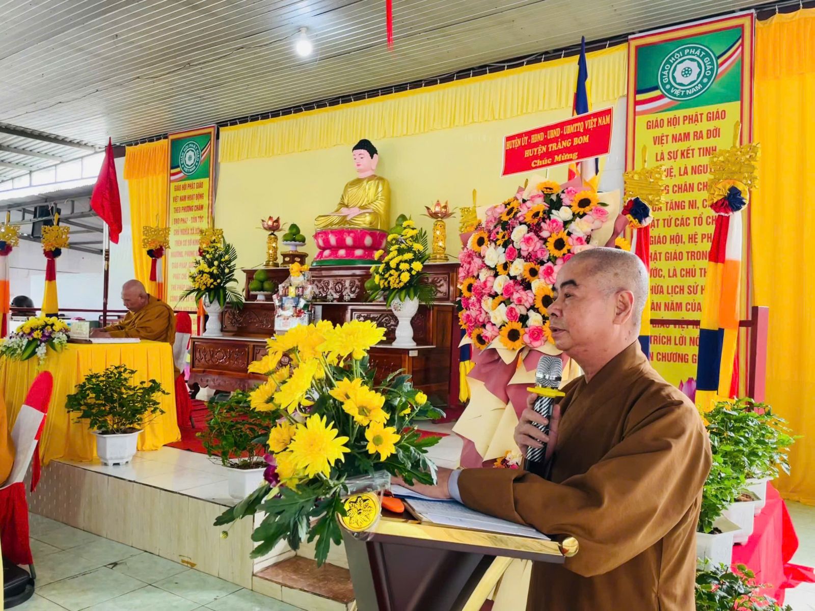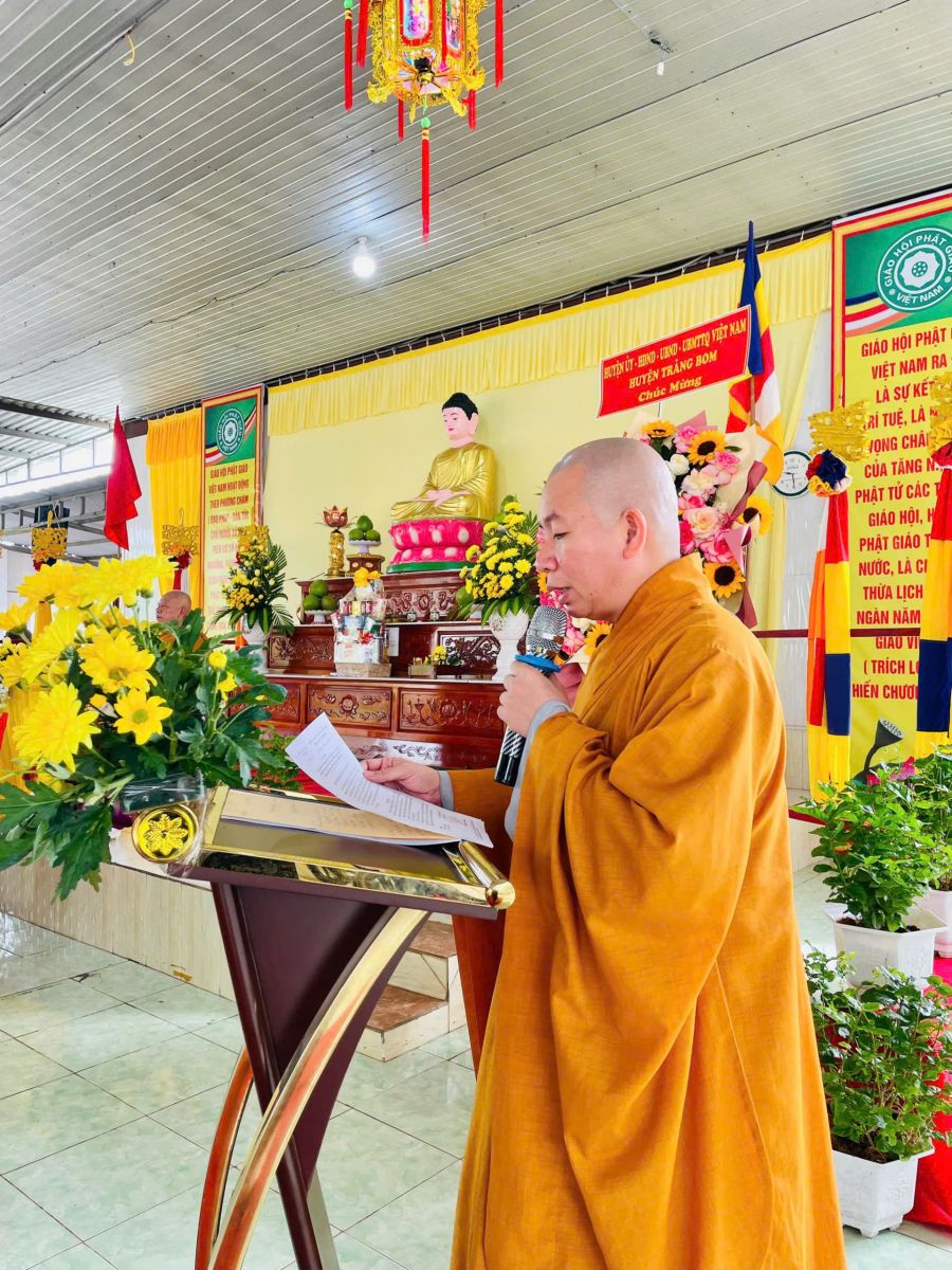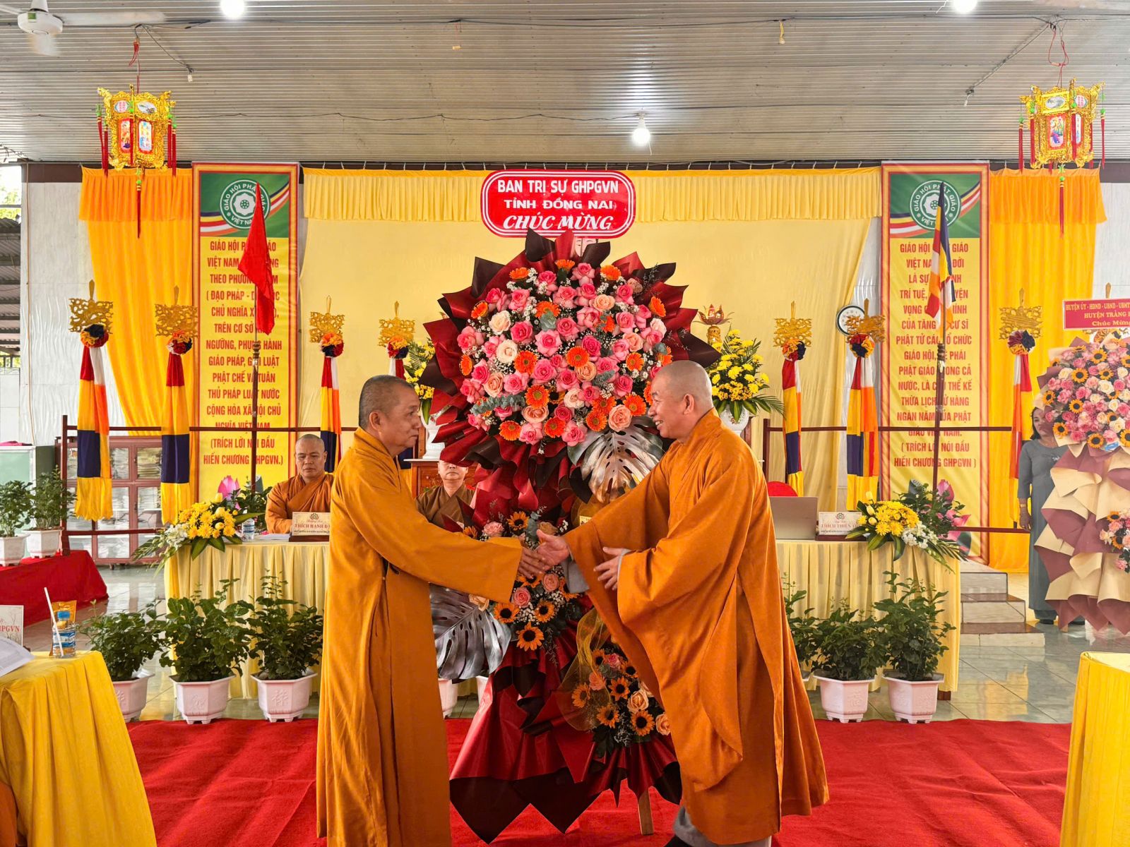 Sau khi tiếp nhận các lãng hoa, quà chúc mừng của tỉnh và huyện nhà, ĐĐ Thích Pháp Hải, phó Thư ký kiêm Chánh văn phòng báo cáo công tác Phật sự giữa nhiệm kỳ 2021-2026. Tại đây ban thư ký trình bày những thành tựu đã đạt được, dưới sự hướng dẫn của thường trực BTS tỉnh, sự quan tâm giúp đỡ tận tình của quý cấp lãnh đạo chính quyền các cấp, sự đồng tâm hiệp lực của Tăng Ni và Phật tử. Đó là nhân tố tích cực để Ban trị sự GHPGVN huyện Trảng Bom hoàn thành tốt nhiệm vụ Phật sự mà Giáo hội tỉnh đã tín nhiệm giao phó. Trong bất kỳ hoàn cảnh nào và thời gian nào thì công tác hành chánh giáo hội cũng đều có những khó khăn nhất định. Bằng sự quyết tâm, Ban trị sự luôn tin tưởng với trí tuệ tập thể, dân chủ trong thảo luận, sáng suốt trong triển khai thực hiện, sẽ đạt được những thành quả to lớn. Quyết tâm phát huy hơn nữa những Phật sự đã làm được và khắc phục những mặt chưa làm được.