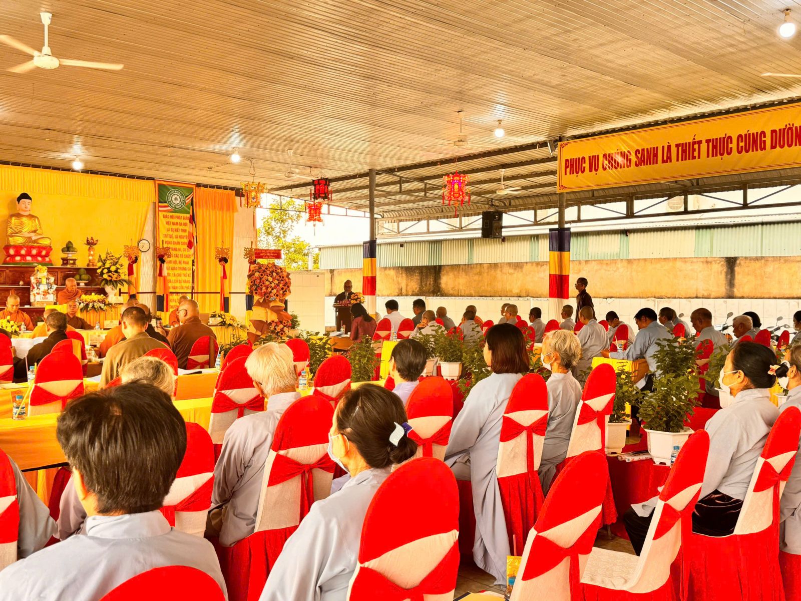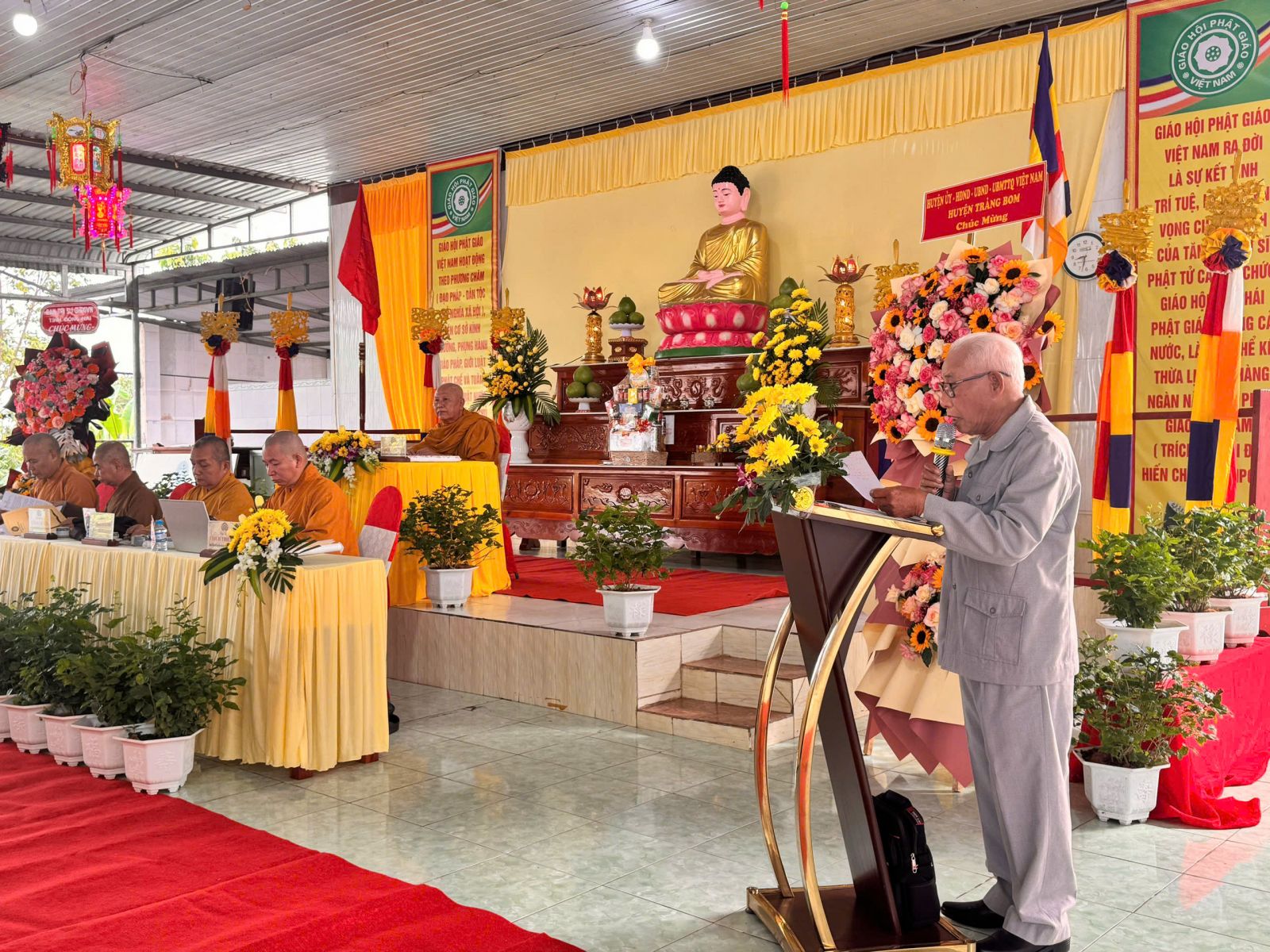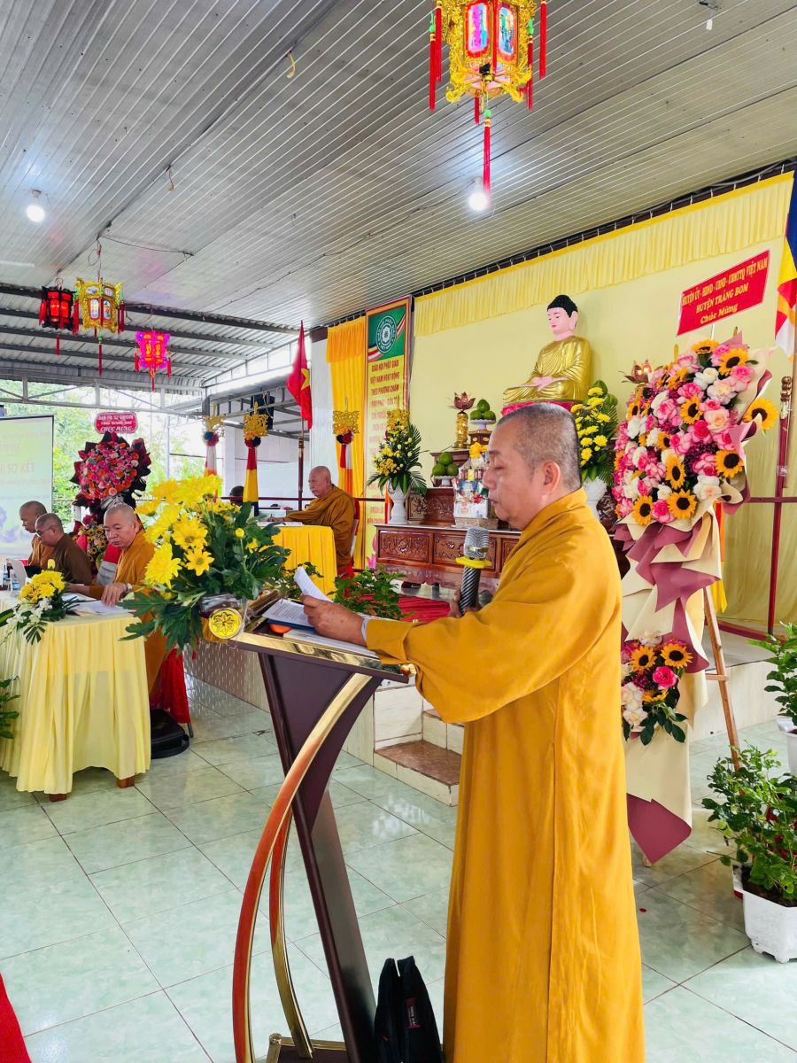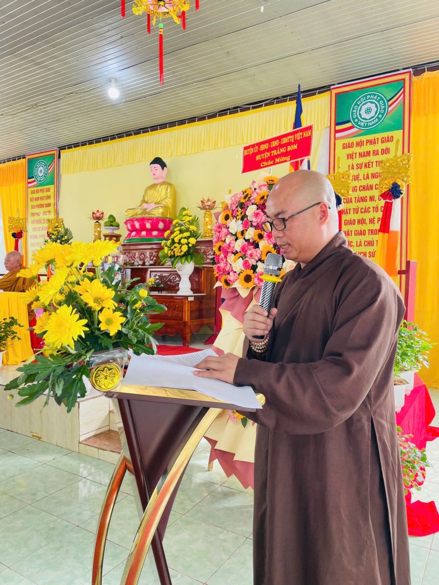 Sau khi tiếp nhận các lãng hoa, quà chúc mừng của tỉnh và huyện nhà, ĐĐ Thích Pháp Hải, phó Thư ký kiêm Chánh văn phòng báo cáo công tác Phật sự giữa nhiệm kỳ 2021-2026. Tại đây ban thư ký trình bày những thành tựu đã đạt được, dưới sự hướng dẫn của thường trực BTS tỉnh, sự quan tâm giúp đỡ tận tình của quý cấp lãnh đạo chính quyền các cấp, sự đồng tâm hiệp lực của Tăng Ni và Phật tử. Đó là nhân tố tích cực để Ban trị sự GHPGVN huyện Trảng Bom hoàn thành tốt nhiệm vụ Phật sự mà Giáo hội tỉnh đã tín nhiệm giao phó. Trong bất kỳ hoàn cảnh nào và thời gian nào thì công tác hành chánh giáo hội cũng đều có những khó khăn nhất định. Bằng sự quyết tâm, Ban trị sự luôn tin tưởng với trí tuệ tập thể, dân chủ trong thảo luận, sáng suốt trong triển khai thực hiện, sẽ đạt được những thành quả to lớn. Quyết tâm phát huy hơn nữa những Phật sự đã làm được và khắc phục những mặt chưa làm được.