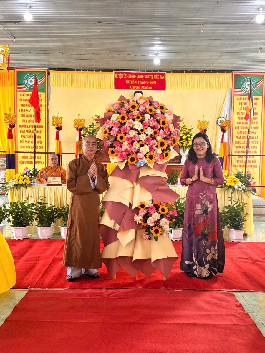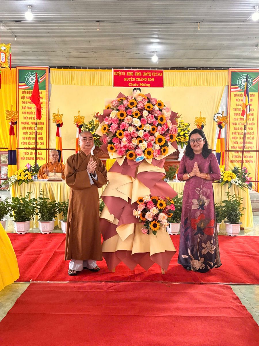 Đại diện chính quyền, bà Trần Thị Lệ Thuỷ - HUV – Trưởng phòng Nội vụ huyện Trảng Bom đánh giá cao mức độ ổn định của Ban trị sự GHPGVN huyện Trảng Bom, bằng việc từ thiện xã hội, xây nhà đại đoàn kết, hỗ trợ các gia đình chính sách, cấp học bổng cho các gia đình con em học sinh nghèo… tham gia tích cực các chương trình vì mục tiêu quốc gia xây dựng nông thôn mới và nông thôn mới nâng cao tại huyện nhà.