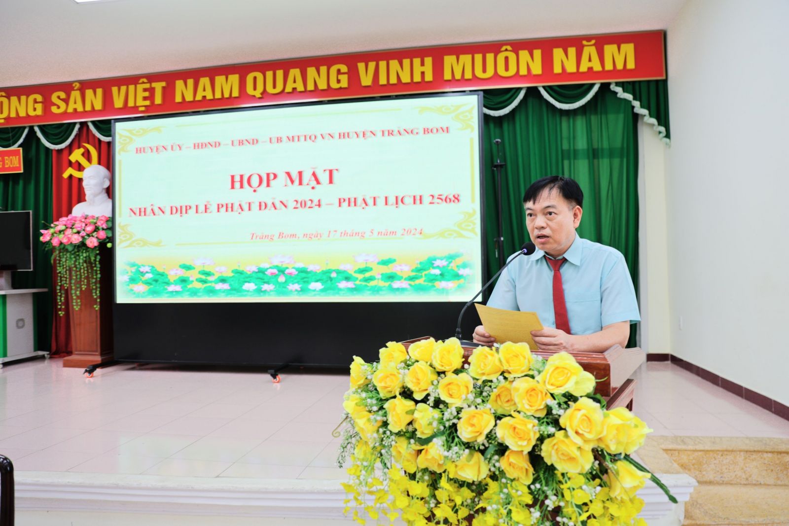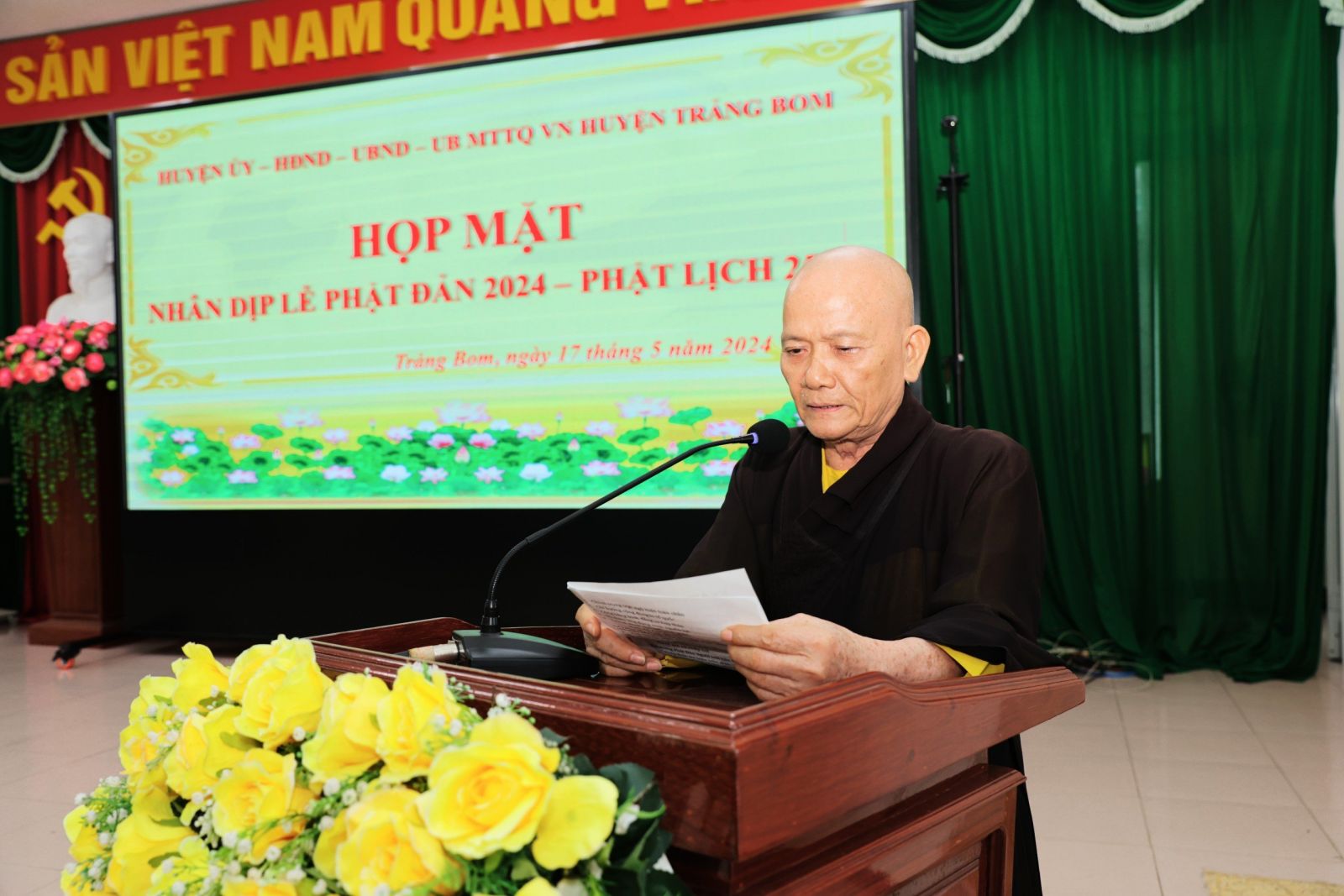 Thay mặt lãnh đạo huyện, ông Đào Xuân Hồng - HUV - CT UB MTTQ Việt Nam huyện đã đọc thư chúc mừng Đại lễ Phật đản năm 2024 - Phật lịch 2568, của Tỉnh ủy - HĐND - UBND - UBMTTQVN tỉnh Đồng Nai;