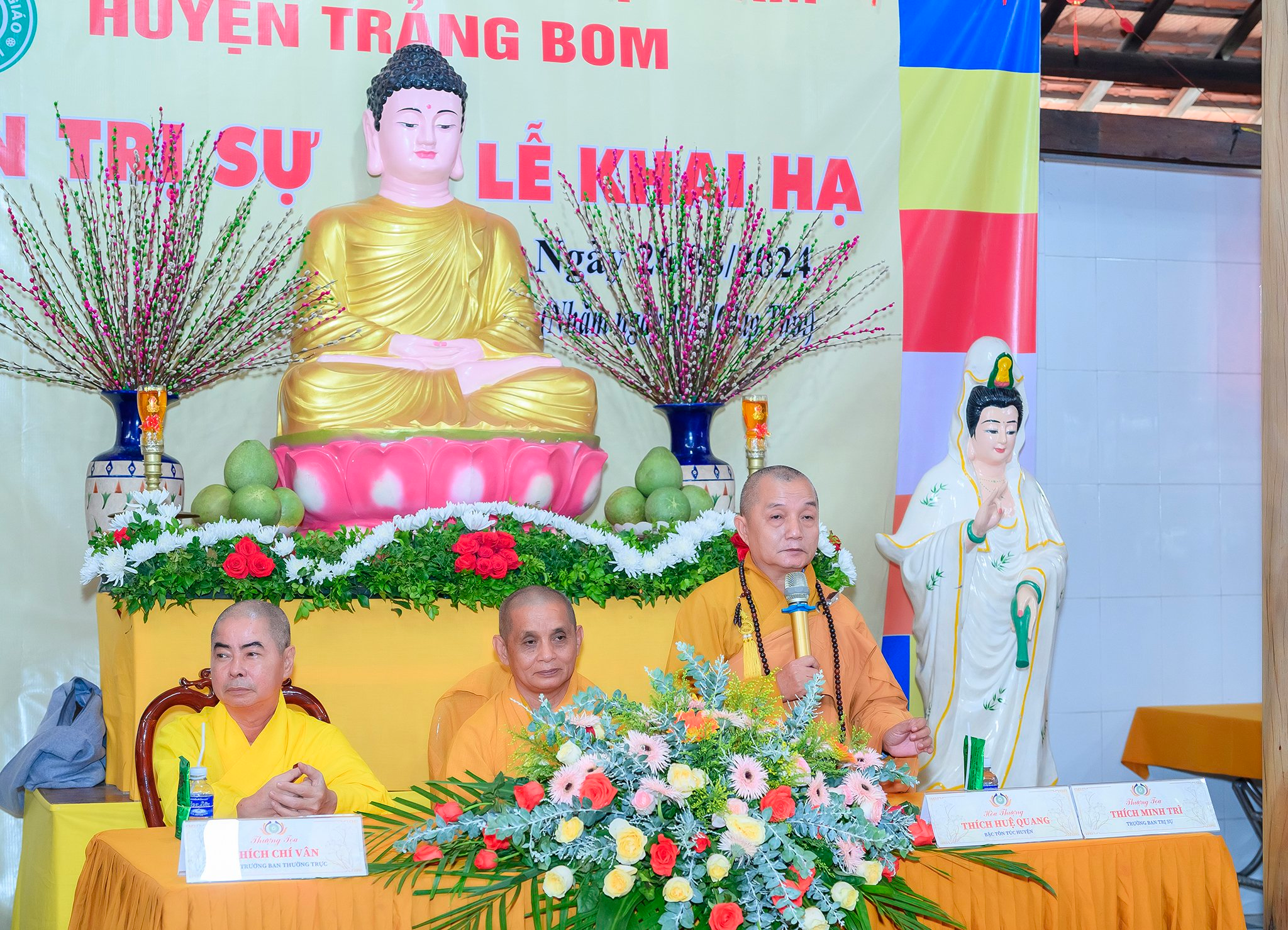 Tại buổi lễ Khai khóa An cư Kiết hạ TT Thích Hạnh Đạt - Phó ban kiêm Chánh thư ký Ban trị sự huyện đã phổ biến một số công văn, thông bạch của Trung ương giáo hội và Ban trị sự tỉnh, liên quan đến những quy định, phương pháp tổ chức an cư kiết hạ, tổ chức khoá tu mùa hè cho phật tử các giới, Ban trị sự GHPGVN huyện Trảng Bom có 2 điểm An cư: Chư Tăng tại chùa Phước Huệ, khu phố 3, thị trấn Trảng Bom và Chư Ni tại chùa Phổ Hiền, ấp 5, xã An Viễn