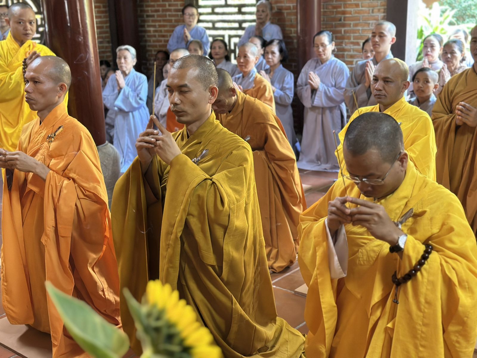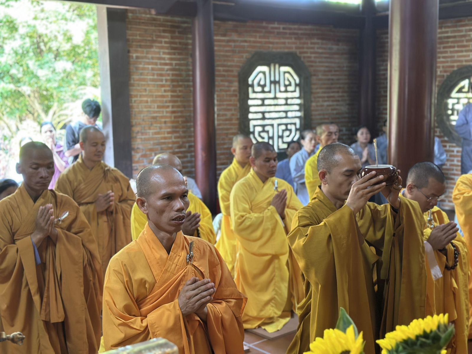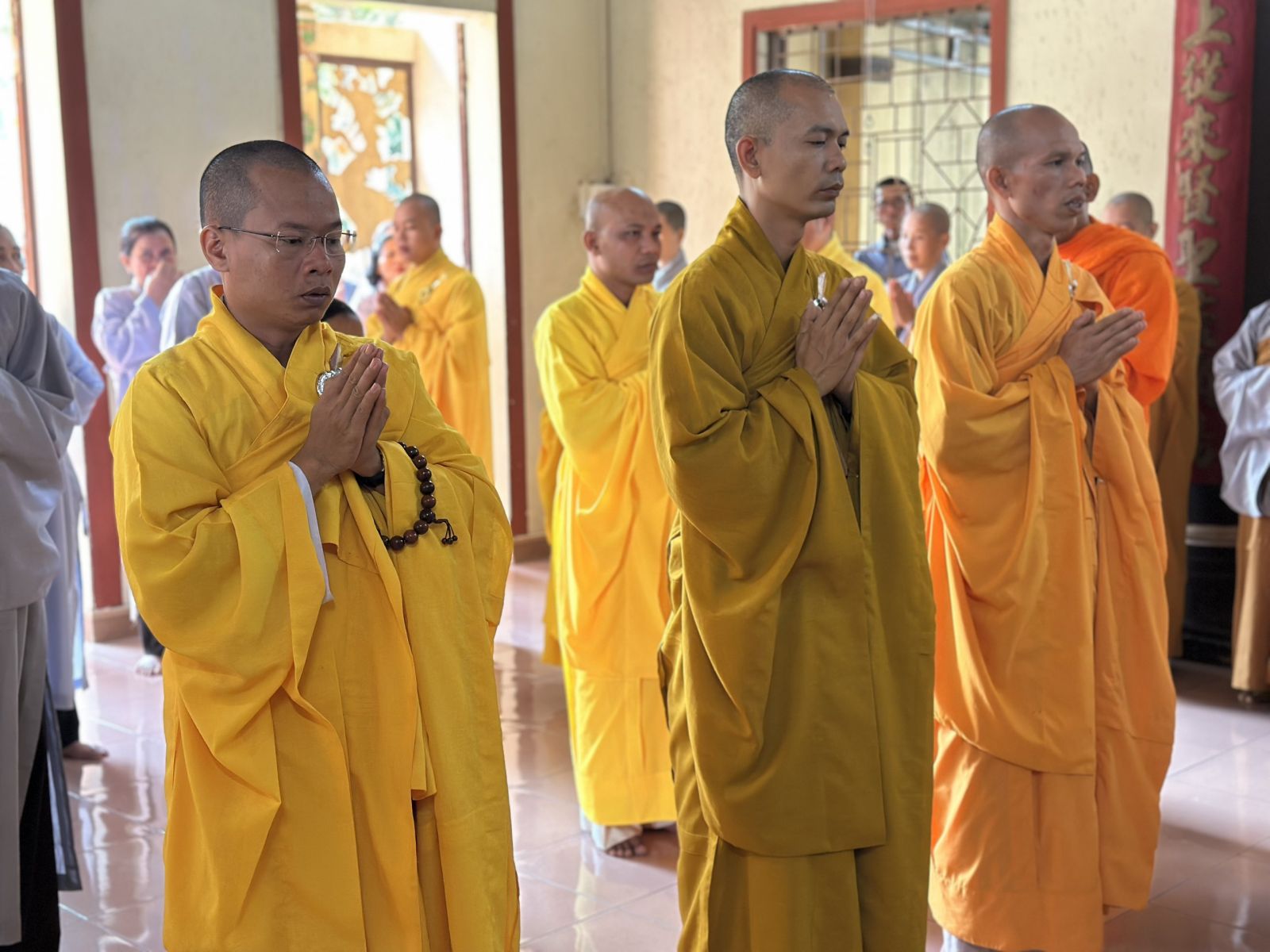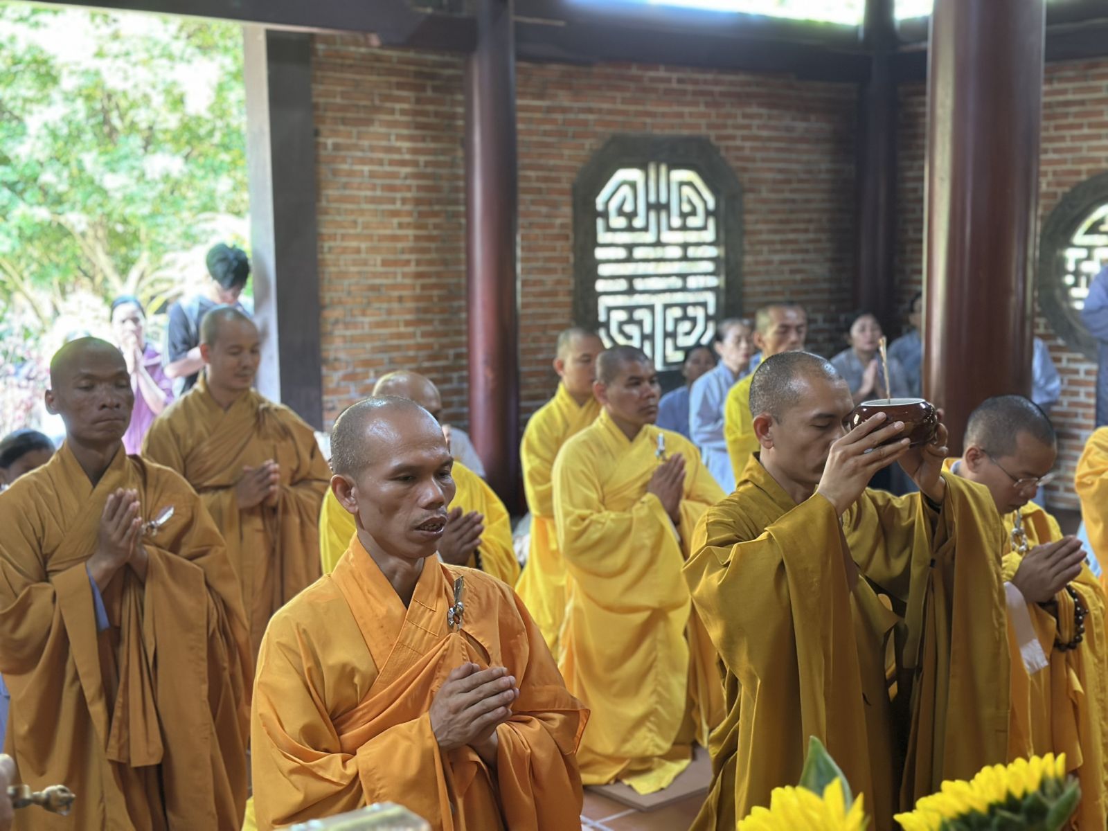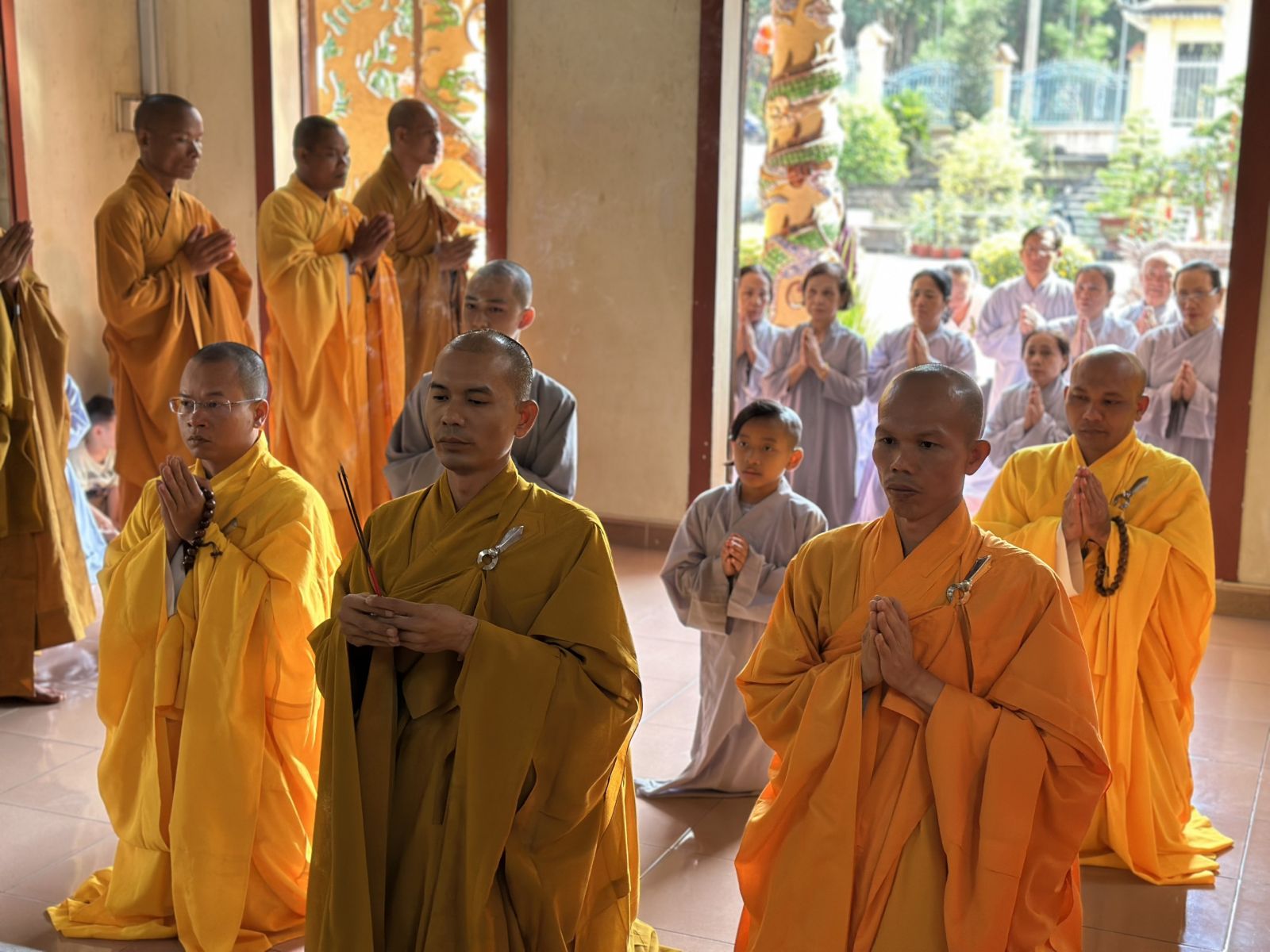 Buổi lễ trang nghiêm với nghi thức truyền thống của thiền môn. Hòa thượng Thích Thiện Hoằng – Chứng minh Ban Trị sự GHPGVN huyện Xuân Lộc, Viện chủ Chùa Linh Hòa; cùng với TT. Thích Minh Trì – Phó Ban Trị sự tỉnh, Trưởng Ban Trị sự GHPGVN huyện Trảng Bom; TT. Thích Chí Vân – Phó trưởng Ban Trị sự GHPGVN huyện Trảng Bom; cùng chư Tôn đức Tăng Ni đã niêm hương đảnh lễ tam bảo chứng minh cho pháp sự được trang nghiêm.
