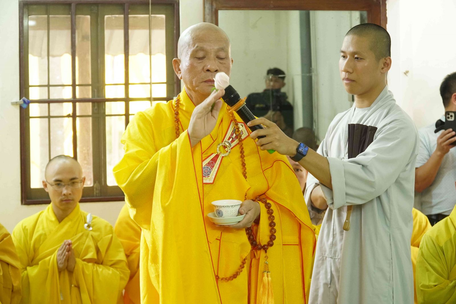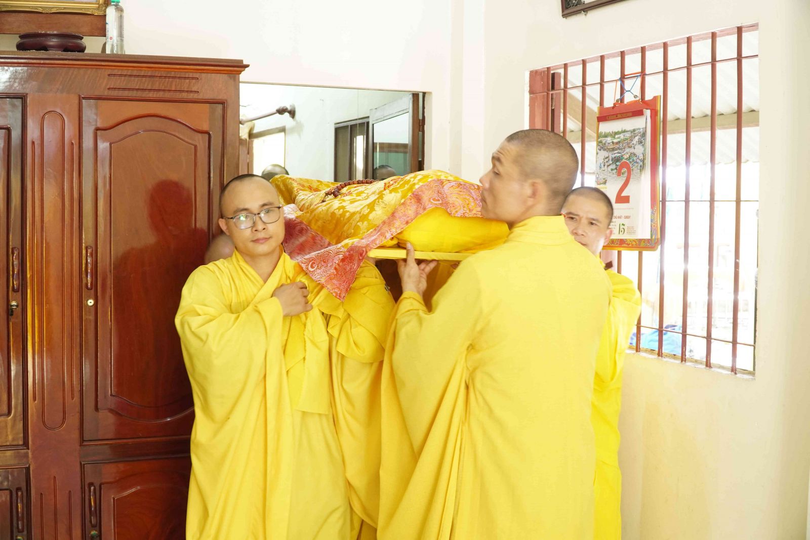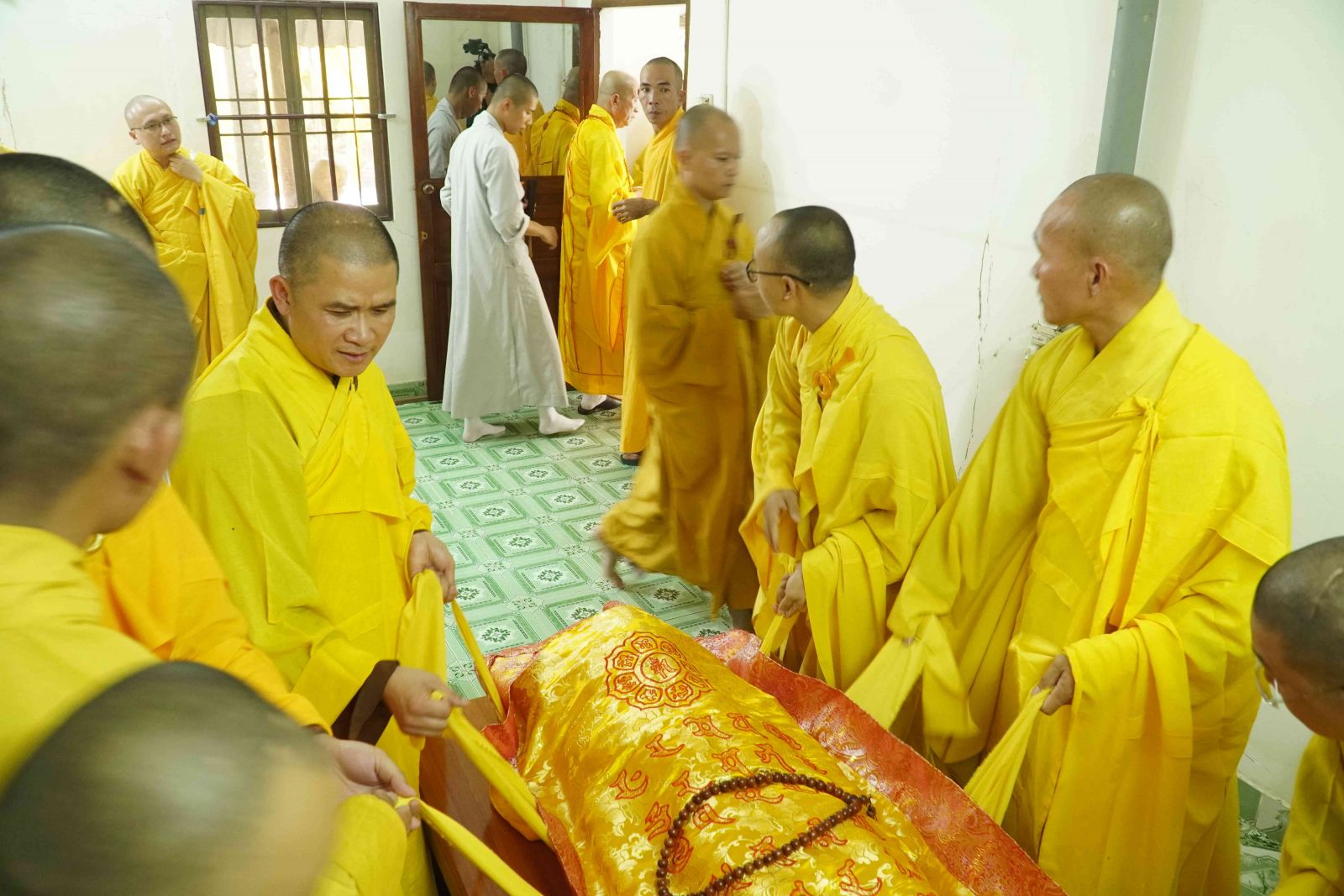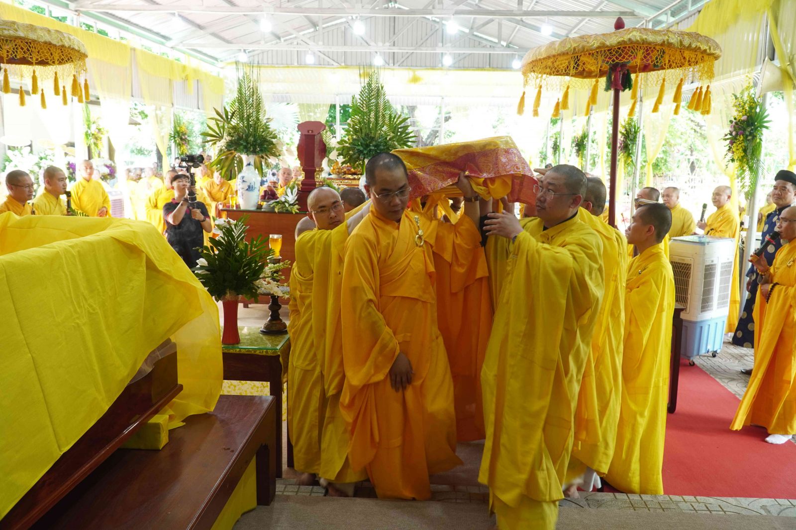 Nơi giác linh đường, Chư tôn Hòa thượng đã trang nghiêm niêm hương cầu nguyện, TT. Thích Pháp Đăng – Sám chủ buổi lễ đã cử hành nghi thức lễ Sái tịnh, sau đó Tăng Ni trong môn đồ Pháp quyến đã cung thỉnh nhục thân Ngài nhập Kim Quan trong tiếng trống rền vang hòa trong tiếng niệm hồng danh đức Phật A Di Đà nhất tâm cầu nguyện Giác linh Ngài cao đăng Phật quốc.