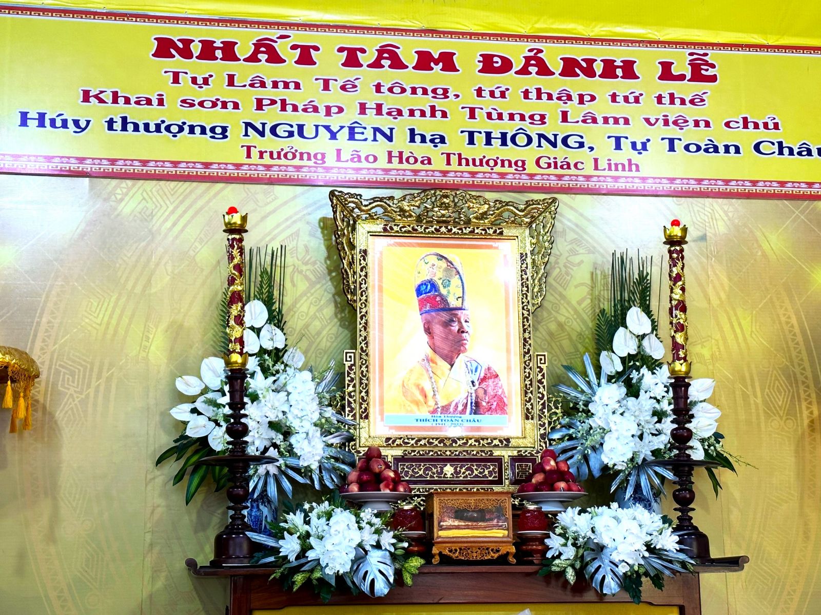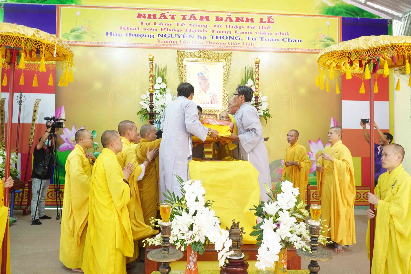 Nhất tâm đảnh lễ: từ Lâm Tế chánh tông, Tứ thập tứ thế, Khai sơn Pháp Hạnh Tùng Lâm viện chủ, húy thượng Nguyên hạ Thông, tự Toàn Châu, trưởng lão Hòa thượng Giác linh.