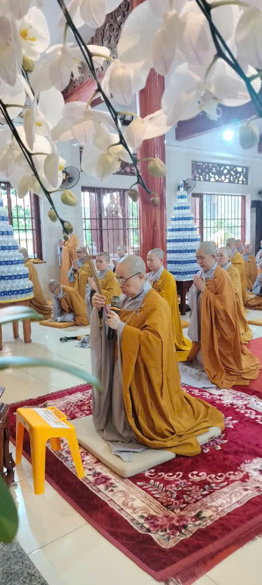 Sau nghi thức niêm hương bạch Phật tác pháp Yết Ma. NS Thích Nữ Tuệ Minh đại diện ban chức sự trường hạ Ni đối trước Đại Tăng thỉnh cầu giáo giới cho Ni chúng.