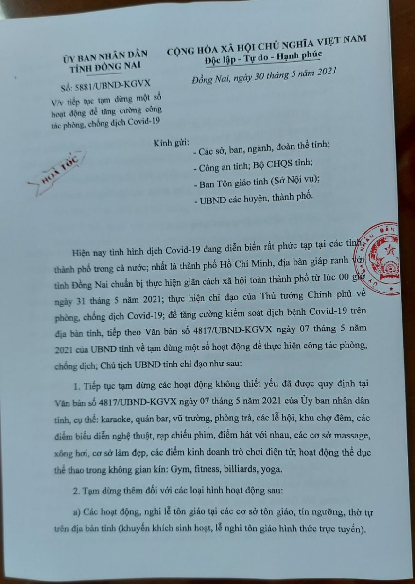 Hiện nay tình hình dịch Covid-19 đang diễn biến rất phức tạp tại các tỉnh, thành phố trong cả nước, nhất là thành phố Hồ Chí Minh, địa bàn giáp ranh với tỉnh Đồng Nai chuẩn bị thực hiện giãn cách xã hội toàn thành phố từ lúc 00 giờ ngày 31 tháng 5 năm 2021; thực hiện chỉ đạo của Thủ tướng Chính phủ về phòng, chống dịch Covid-19, để tăng cường kiểm soát dịch bệnh Covid-19 trên địa bàn tỉnh, tiếp theo Văn bản số 4817/UBND-KGVX ngày 07 tháng 5 năm 2021 của UBND tỉnh về tạm dừng một số hoạt động để thực hiện công tác phòng, chống dịch; Chủ tịch UBND tỉnh chỉ đạo như sau: