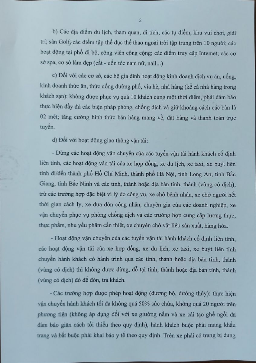 - Dừng các hoạt động vận chuyển của các tuyến vận tải hành khách cố định liên tỉnh, các hoạt động vận tải của xe hợp đồng, xe du lịch, xe taxi, xe buýt liên tỉnh đi đến thành phố Hồ Chí Minh, thành phố Hà Nội, tỉnh Long An, tỉnh Bắc Giang, tỉnh Bắc Ninh và các tỉnh, thành hoặc địa bàn tỉnh, thành (vùng có dịch), trừ các trường hợp đặc biệt vì lý do công vụ, xe chở bệnh nhân, xe chở người hết thời gian cách ly, xe đưa đón công nhân, chuyên gia của các doanh nghiệp, xe vận chuyển phục vụ phòng chống dịch và các trường hợp cung cấp lương thực, thực phẩm, nhu yếu phẩm cần thiế , xe chuyên chở vật liệu sản xuất, hàng hóa.
