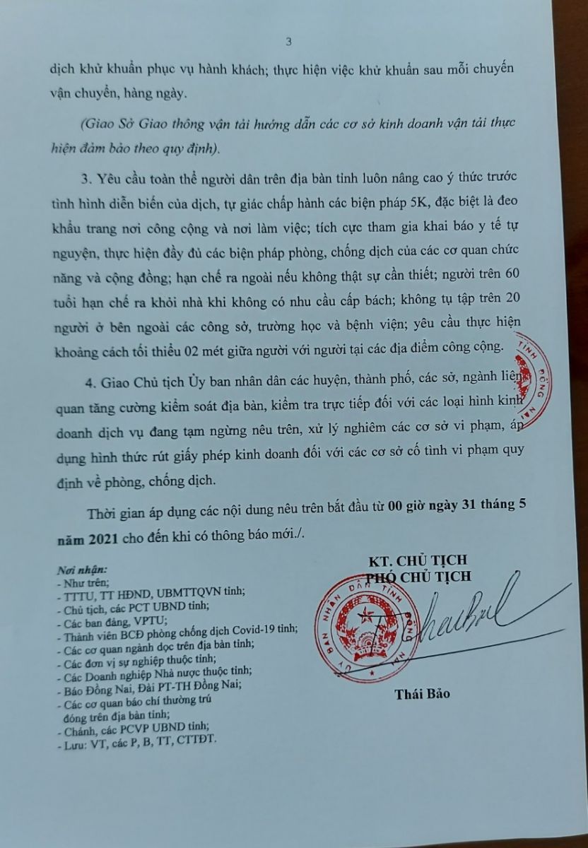 | Nơi nhận: - Như trên; - TTTƯ, TT HĐND, UBMTTQVN tỉnh; - Chủ tịch, các PCT UBND tỉnh; - Các ban đảng, VPTƯ; - Thành viên BCĐ phòng chống dịch Covid-19 tỉnh; - Các cơ quan ngành dọc trên địa bàn tỉnh; - Các đơn vị sự nghiệp thuộc tỉnh; - Các Doanh nghiệp Nhà nước thuộc tỉnh; - Báo Đồng Nai, Đài PT - TH Đồng Nai; - Các cơ quan báo chí thường trú đóng trẽn địa bàn tỉnh; - Chánh, các PCVP UBND tỉnh; - Lưu VT, các P, B, TT, CTTĐT. |