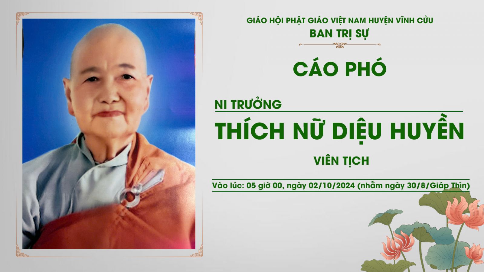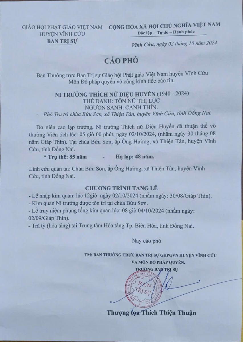 Do niên cao lạp trưởng, đã thuận thế vô thường viên tịch vào lúc 05 giờ 00, ngày 02/10/2024