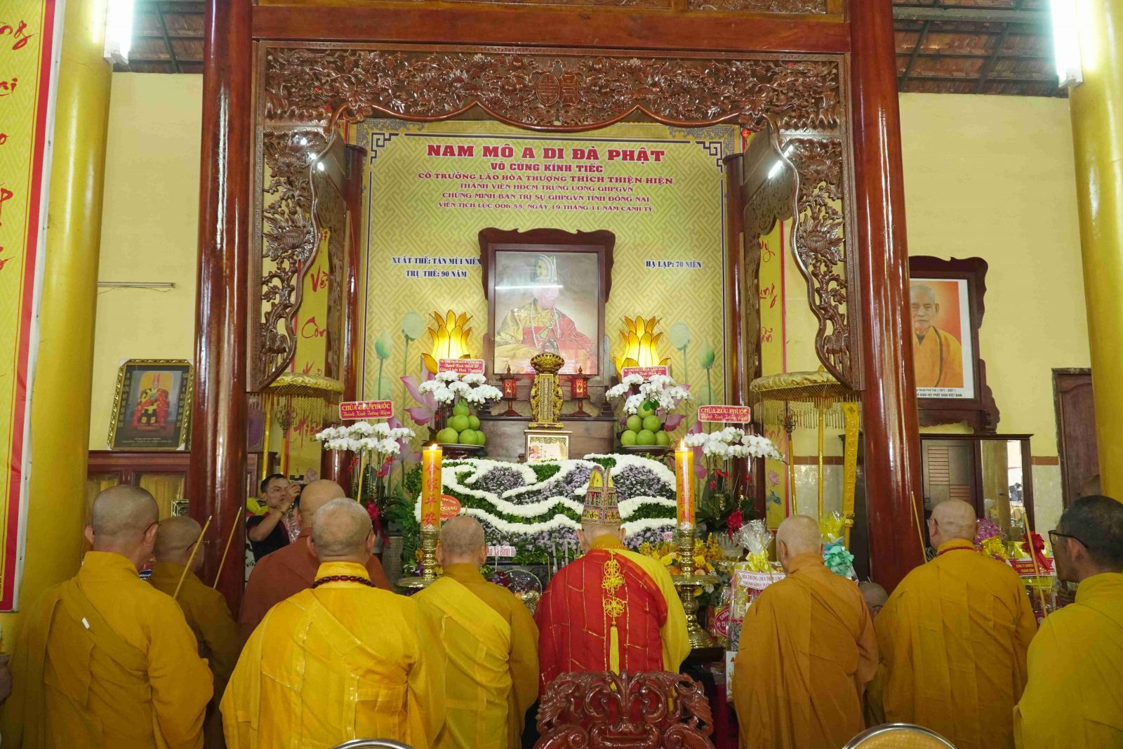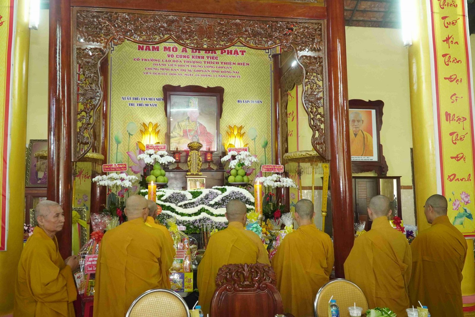Buổi lễ trang nghiêm với nghi thức bạch Phật khai kinh, cúng ngọ và cung tiến Giác linh. Sau đó, môn đồ pháp quyến đã trang nghiêm cung nghinh chư Tôn túc Hòa thượng, Thượng tọa, Ni trưởng, Ni sư, Đại đức Tăng Ni quang lâm Giác linh đài dâng hương tưởng niệm cố Trưởng lão Hòa thượng thượng Thiện hạ Hiện - Thành viên HĐCM TƯ, Chứng minh Ban Trị sự GHPGVN tỉnh Đồng Nai viên tịch.