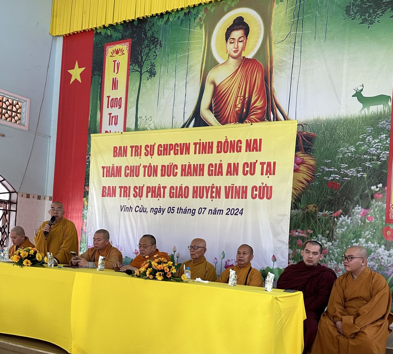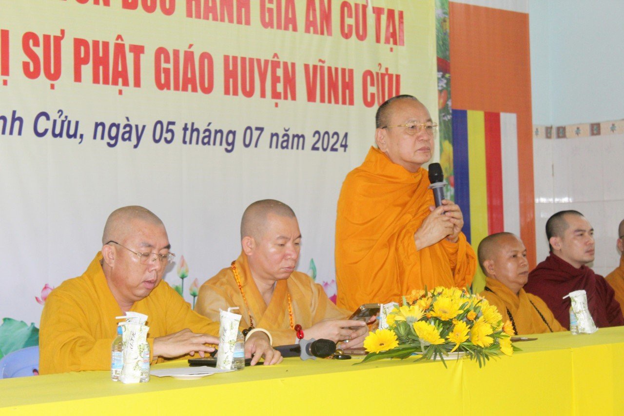 HT Thích Bửu Chánh, trưởng phái đoàn đã có đôi lời sách tấn đến hành giả An cư. Trong mọi hoàn cảnh và điều kiện nào cũng phải An cư. Dù là nhất tăng nhất tự cũng tâm niệm An cư, để duy trì mạng mạch Phật pháp tại địa phương. Huyện Vĩnh Cửu là một trong những huyện vùng sâu vùng xa, về vị trí địa lý dài hàng 100km, trong các con đường sâu thẳm của núi rừng, nhưng vẫn có sự hiện hữu của ngôi chùa, hình bóng Tăng Ni, các chú tiểu và đạo tràng Phật tử tu học, đó là những điều căn bản để duy trì mạng mạch của Phật pháp nơi vùng sâu vùng xa này, nên cần phải cố gắng.
