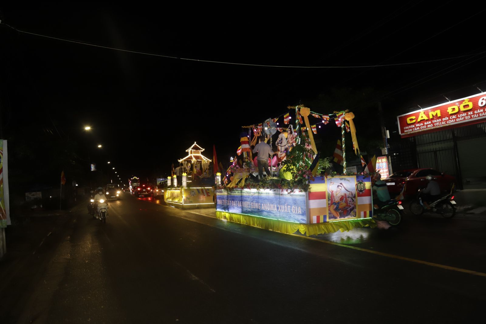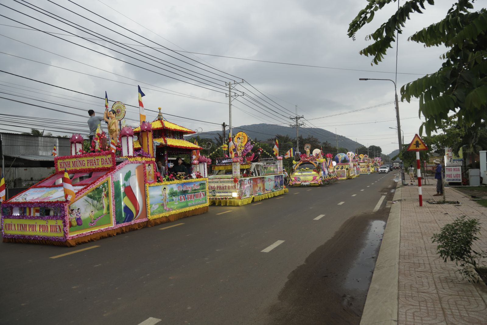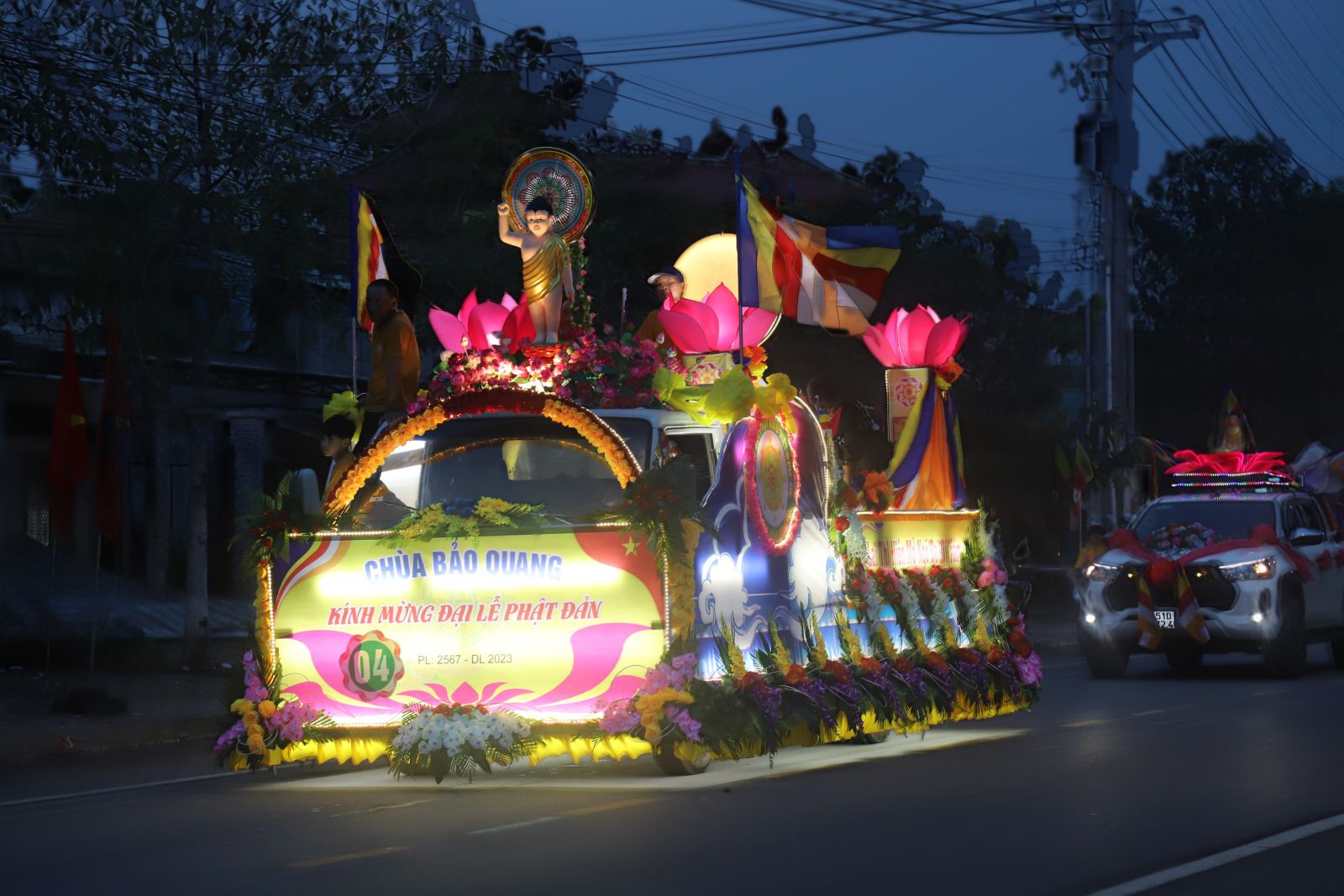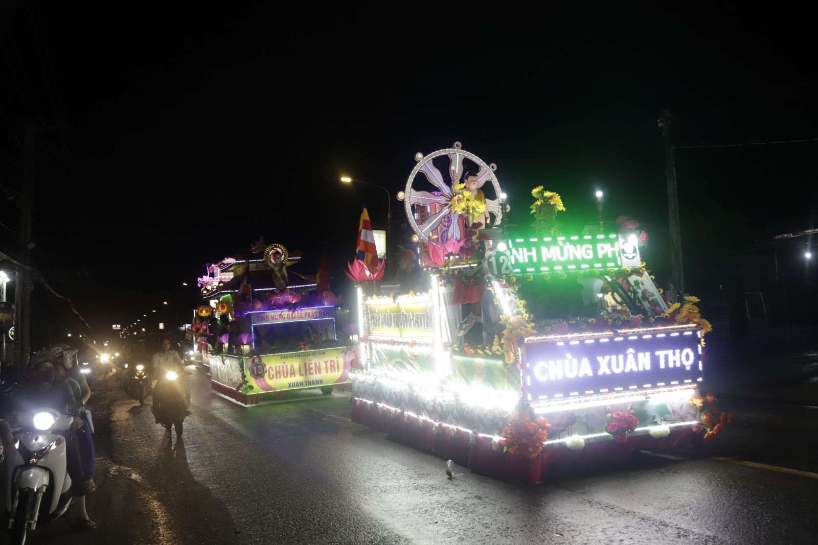 Trong niềm hoan hỷ vô biên đón mừng Phật đản, đoàn diễu hành có sự tham dự của Ban Tổ chức, Ban Điều hành xe hoa, xe chư Tăng Ni. Và sự hưởng ứng nồng nhiệt và thành kính của các GĐPT, các Đạo tràng Phật tử bằng xe mô tô, xe gắn máy, xe đạp được trang trí cờ, hoa,…rực rỡ kéo đài hơn 02km với số lượng gần 1000 người tham dự khiến cho cả đoạn đường dài lung linh tràn ngập hoa đèn, hoà vui theo ca khúc Kính mừng Phật Đản. Trên các tuyến đường các tự viện và các tư gia Phật tử cầm cờ hoa ra đón và chấp tay thành kính trong niềm tôn kính vô biên.