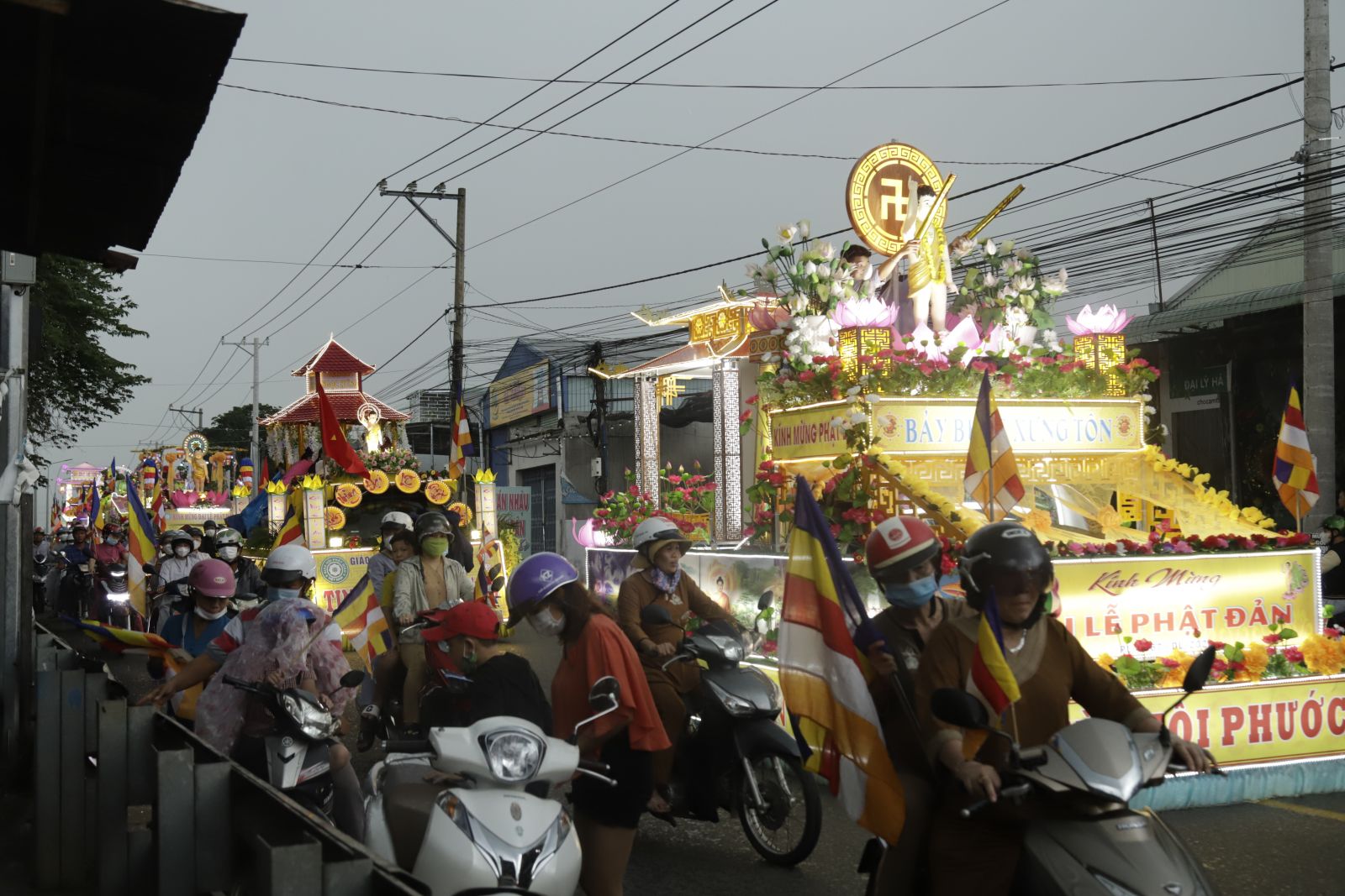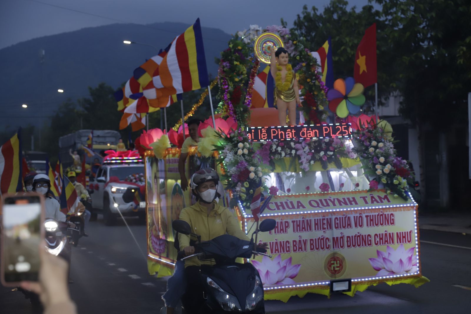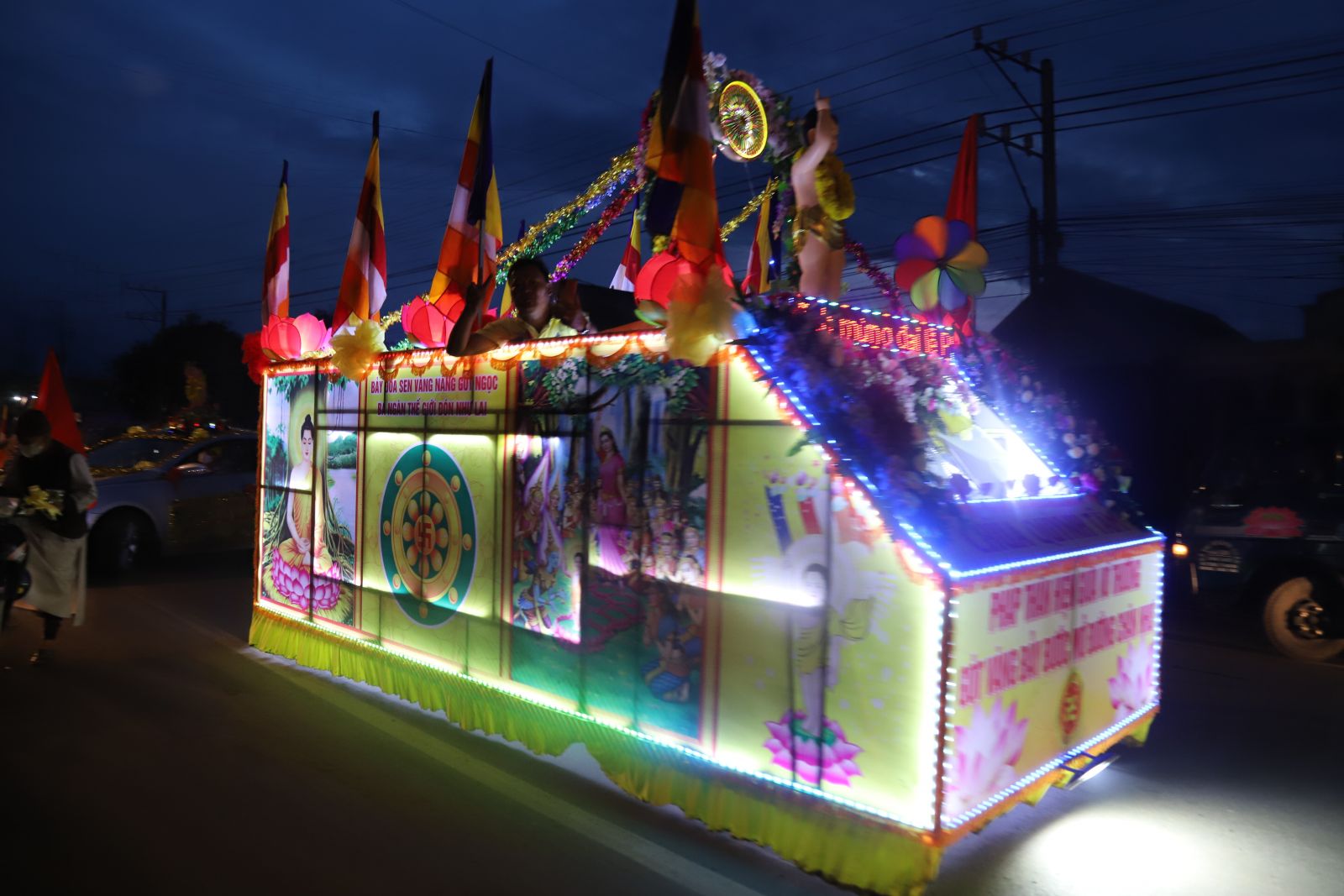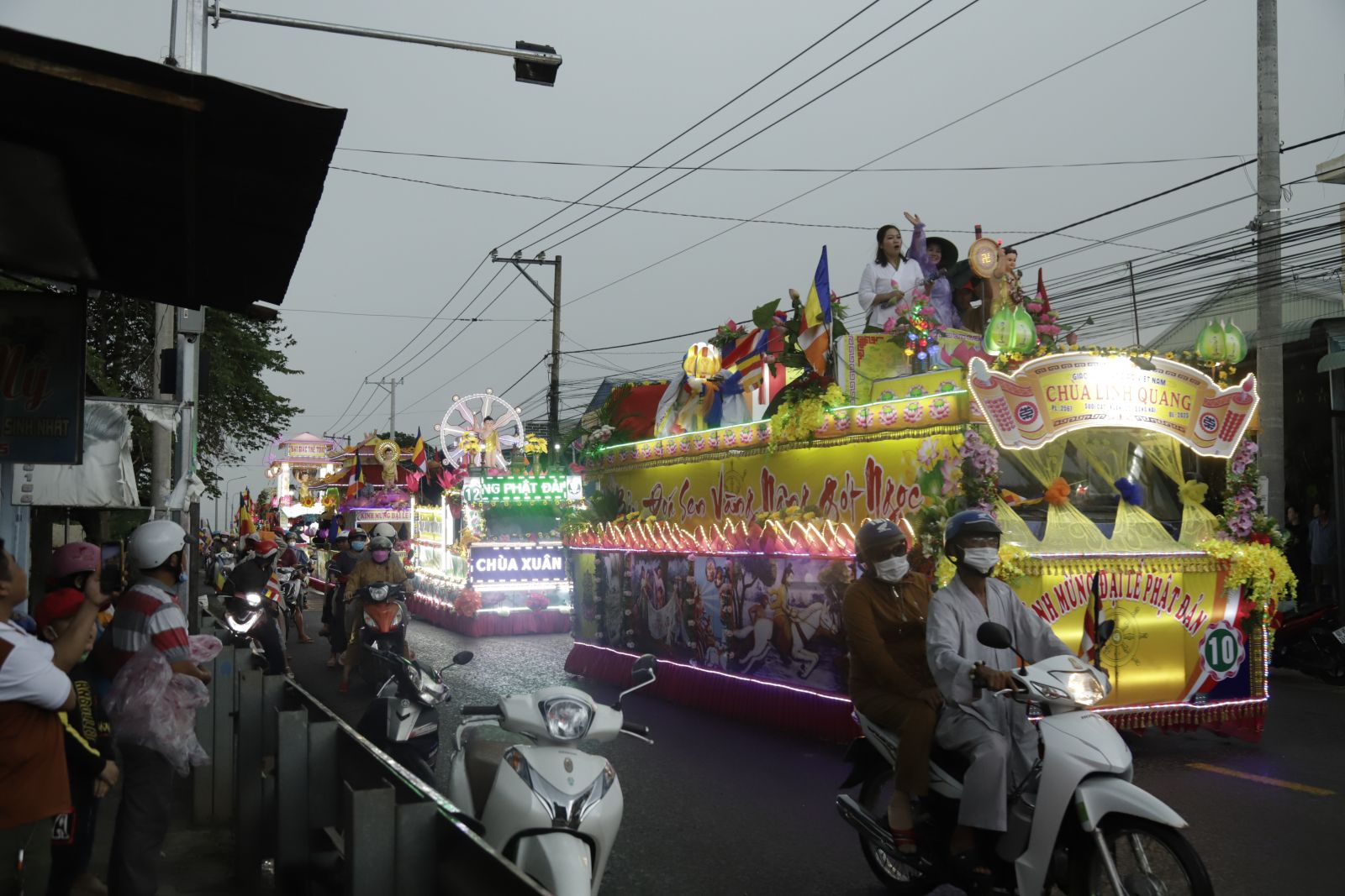 Trong niềm hoan hỷ vô biên đón mừng Phật đản, đoàn diễu hành có sự tham dự của Ban Tổ chức, Ban Điều hành xe hoa, xe chư Tăng Ni. Và sự hưởng ứng nồng nhiệt và thành kính của các GĐPT, các Đạo tràng Phật tử bằng xe mô tô, xe gắn máy, xe đạp được trang trí cờ, hoa,…rực rỡ kéo đài hơn 02km với số lượng gần 1000 người tham dự khiến cho cả đoạn đường dài lung linh tràn ngập hoa đèn, hoà vui theo ca khúc Kính mừng Phật Đản. Trên các tuyến đường các tự viện và các tư gia Phật tử cầm cờ hoa ra đón và chấp tay thành kính trong niềm tôn kính vô biên.