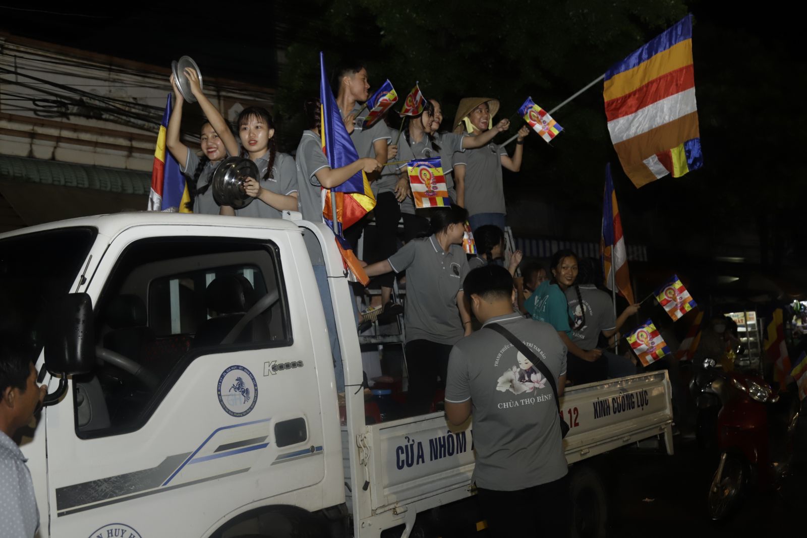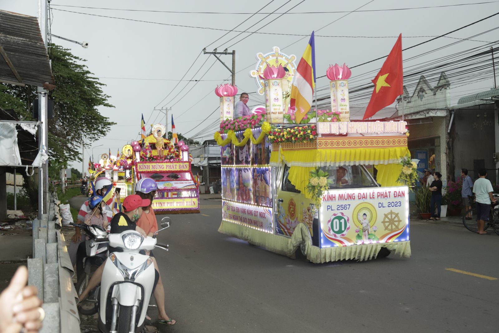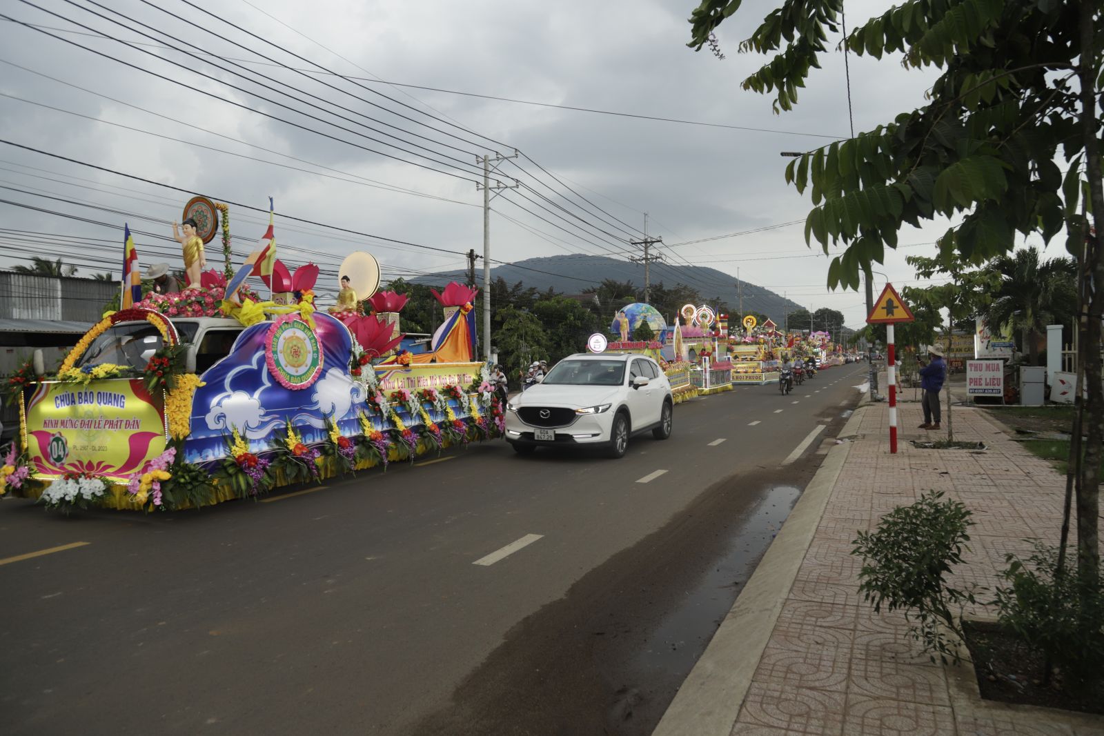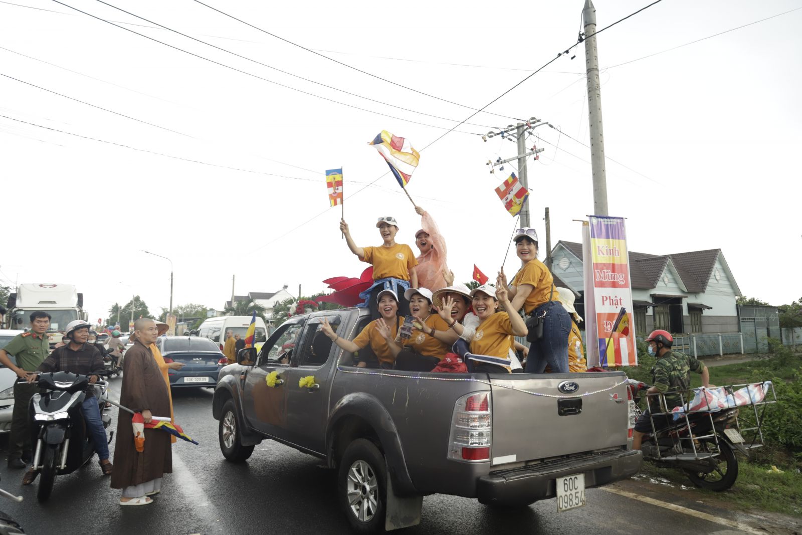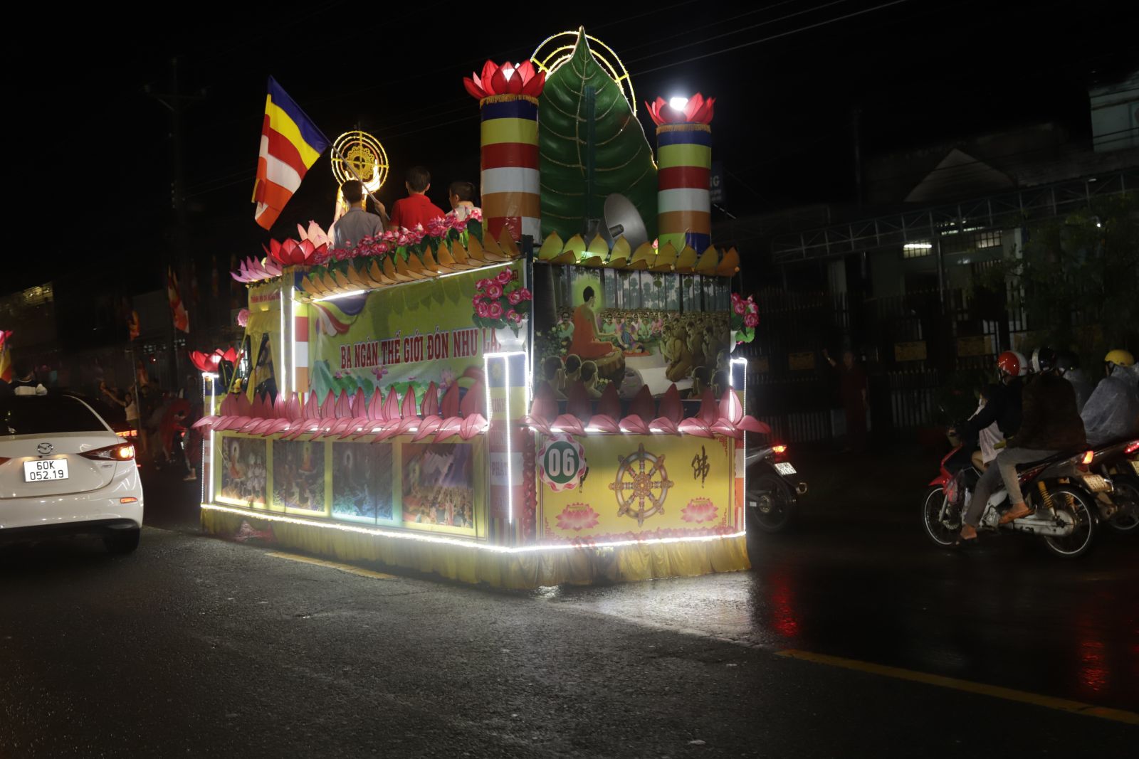 Trong niềm hoan hỷ vô biên đón mừng Phật đản, đoàn diễu hành có sự tham dự của Ban Tổ chức, Ban Điều hành xe hoa, xe chư Tăng Ni. Và sự hưởng ứng nồng nhiệt và thành kính của các GĐPT, các Đạo tràng Phật tử bằng xe mô tô, xe gắn máy, xe đạp được trang trí cờ, hoa,…rực rỡ kéo đài hơn 02km với số lượng gần 1000 người tham dự khiến cho cả đoạn đường dài lung linh tràn ngập hoa đèn, hoà vui theo ca khúc Kính mừng Phật Đản. Trên các tuyến đường các tự viện và các tư gia Phật tử cầm cờ hoa ra đón và chấp tay thành kính trong niềm tôn kính vô biên.