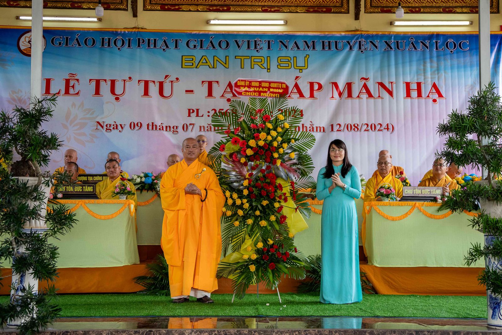 Tại buổi lễ, Thường trực BTS GHPVN tỉnh Đồng Nai cùng các cấp lãnh đạo chính quyền đã tặng những lẵng hoa tươi thắm chúc mừng BTS GHPGVN huyện và chư Tăng Ni hành giả an cư nhân ngày mãn hạ.