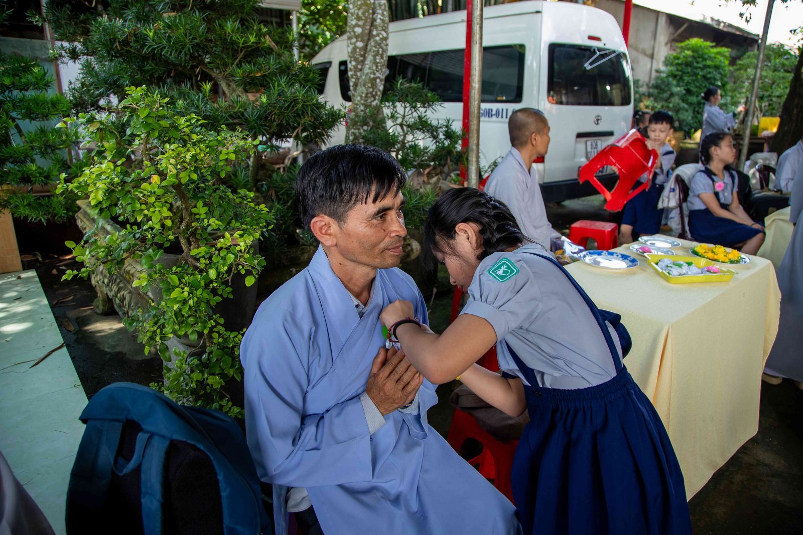 ĐĐ. Thích Đồng Đạt - Trưởng Ban Kiểm soát GHPGVN huyện cùng các vị Tăng Ni đại diện cho 294 hành giả Tăng Ni an cư đã đối trước chư Tôn đức giáo phẩm dâng lời tác bạch Tạ pháp. Trong không khí đồng vọng của mùa báo hiếu Ban Trị sự, Ban Tổ chức an cư đã cử hành nghi thức bông hồng cài áo trong ngày tạ pháp tự tứ.