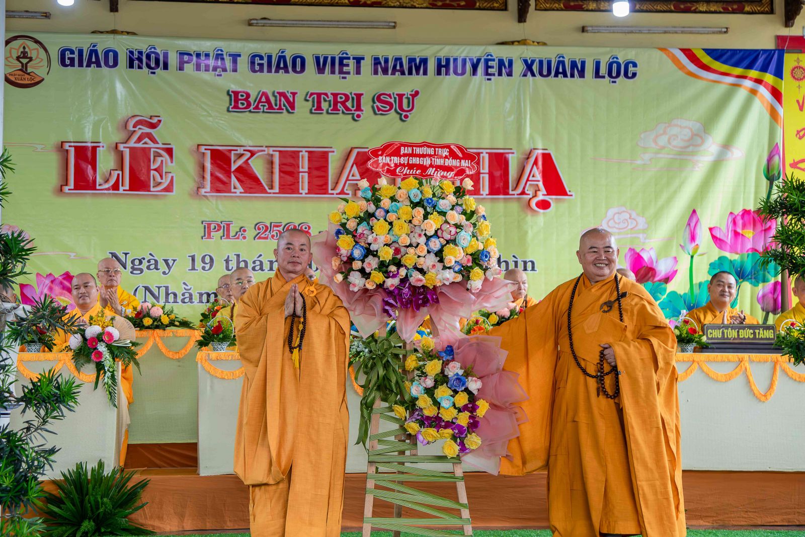 Tại buổi lễ, Thường trực BTS GHPVN tỉnh Đồng Nai cùng các cấp lãnh đạo chính quyền đã trao tặng những lẵng hoa tươi thắm chúc mừng BTS GHPGVN huyện và chư Tăng Ni hành giả an cư nhân ngày khai hạ. Bên cạnh đó Ban Tổ chức, Ban Chức sự Trường hạ cùng chư hành giả an cư đã đón nhận được sự phát tâm của quý Tôn đức Tăng Ni và quý Phật tử cúng dường Trường hạ để chư Tăng Ni an tâm tu học trong 03 tháng.