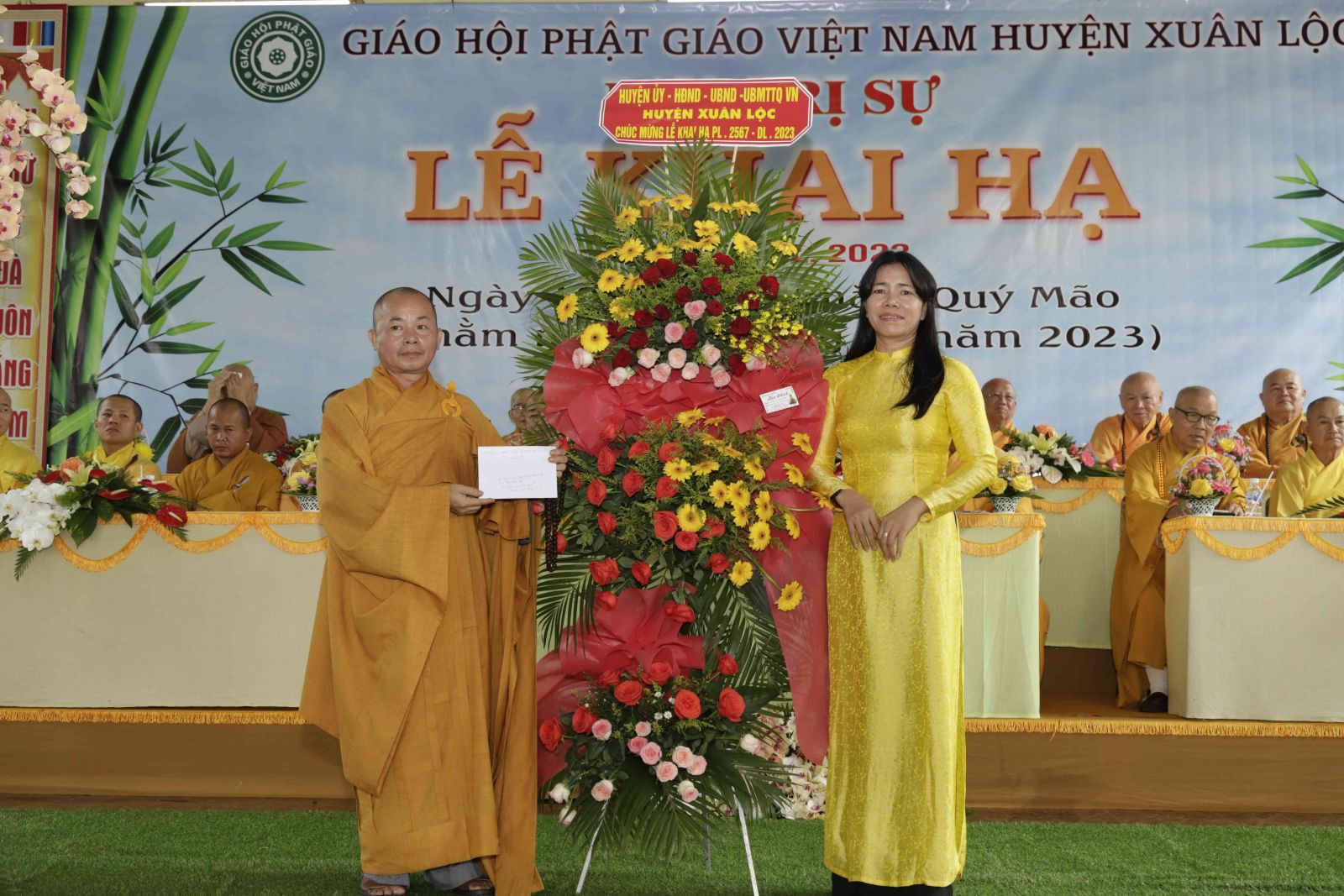 Tại buổi lễ Ban Tổ chức đã đón nhận những lẵng hoa chúc mừng của Lãnh đạo Ban Trị sự GHPGVN tỉnh Đồng Nai và các cấp lãnh đạo Chính quyền cùng với số tiền 10.000.000đ hỗ trợ của UBND huyện Xuân Lộc. Bên cạnh đó Ban Tổ chức cũng đón nhận được sự phát tâm cúng dường hỗ trợ trường hạ của quý chư Tôn đức Tăng Ni và Phật tử.