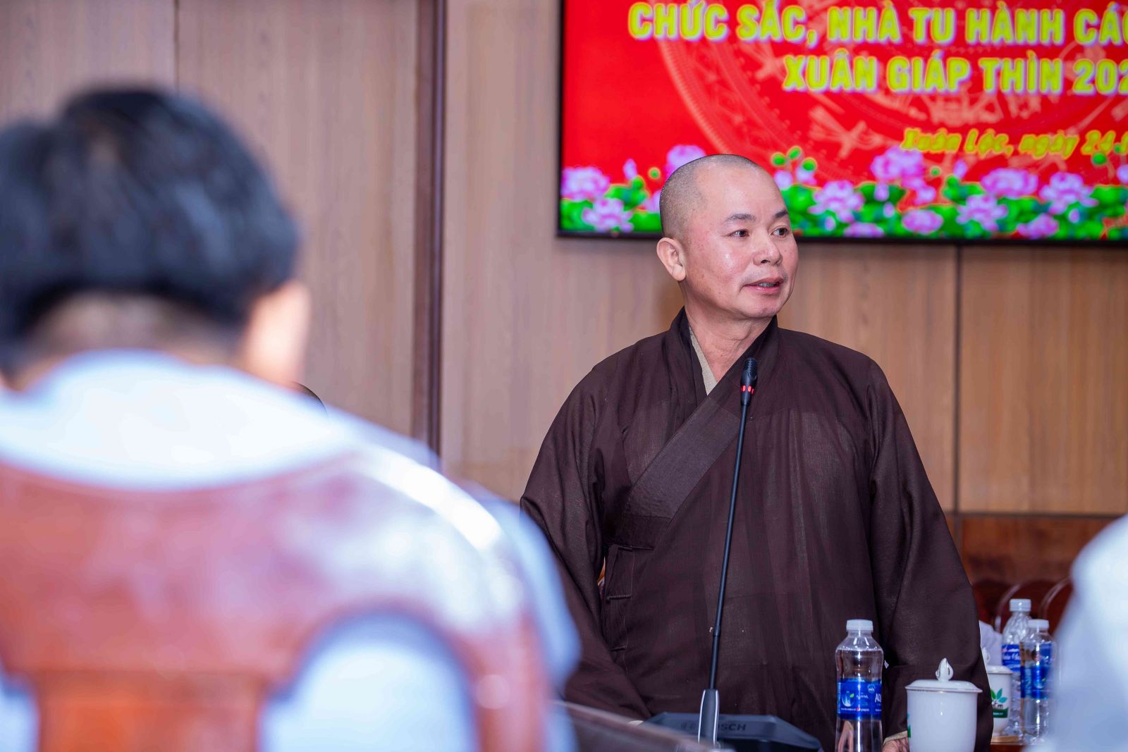 Sau khi lắng nghe về tình hình kinh tế xã hội, an ninh quốc phòng, giá trị sản xuất tăng trưởng của huyện Xuân Lộc. TT. Thích Huệ Quang đại diện GHPGVN huyện phát biểu chúc mừng những thành tựu của huyện Xuân Lộc. Tuy với tình hình khó khăn và thách thức nhiều trong năm 2023 nhưng dưới sự lãnh đạo của Đảng bộ, Chính quyền và sự quyết tâm của Nhân dân huyện Xuân Lộc đã đưa huyện nhà vươn lên trong năm 2023. Với vai trò là thành viên trong Khối Đại Đoàn kết Ban Trị sự cùng chư Tăng Ni huyện Xuân Lộc luôn đồng hành cùng Chính quyền và Nhân dân huyện trong công cuộc xây dựng và phát triển huyện Xuân Lộc ngày càng phát triển bền vững hơn nữa.