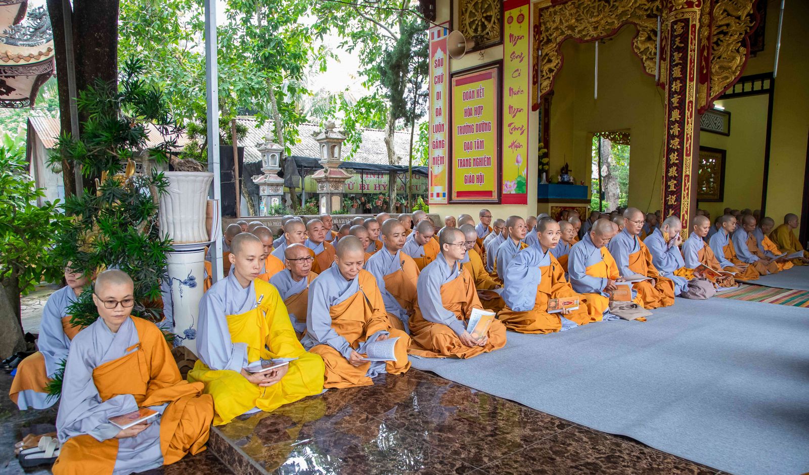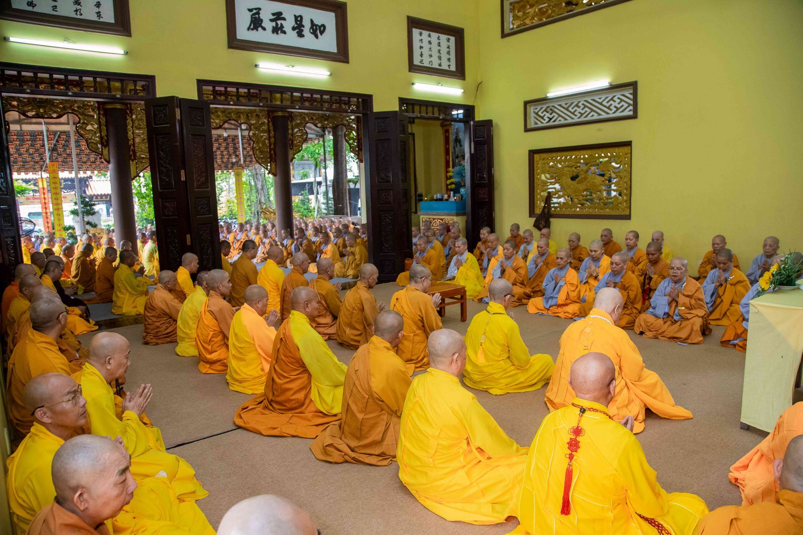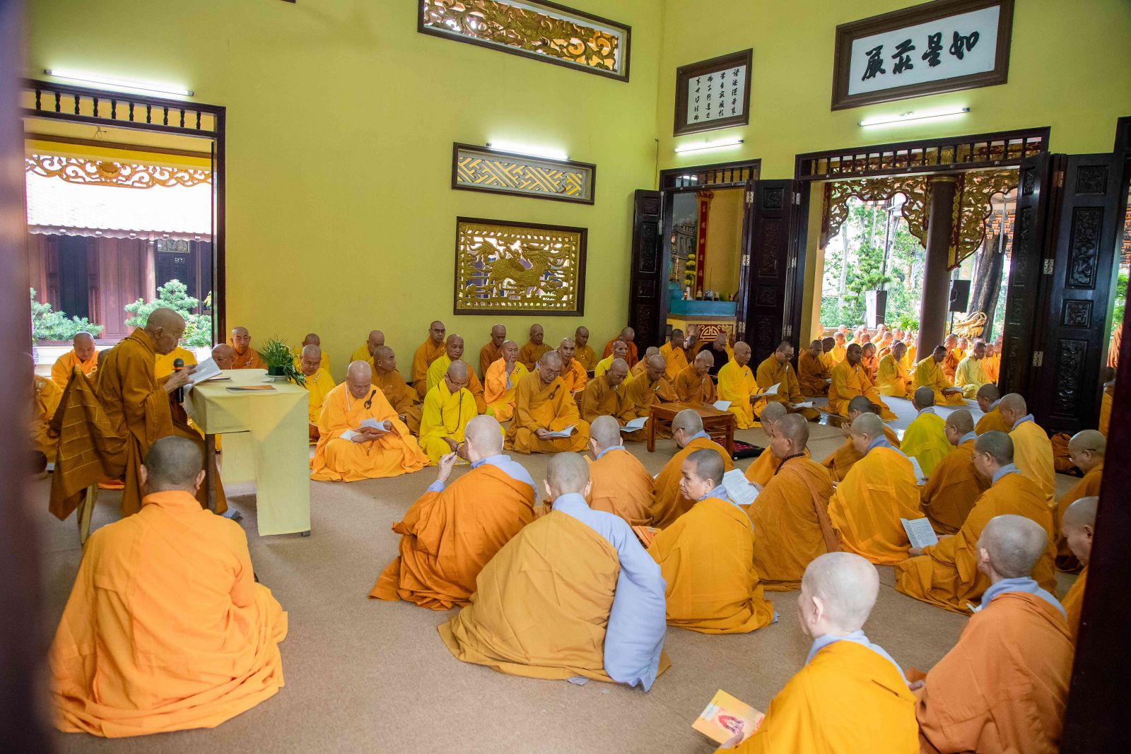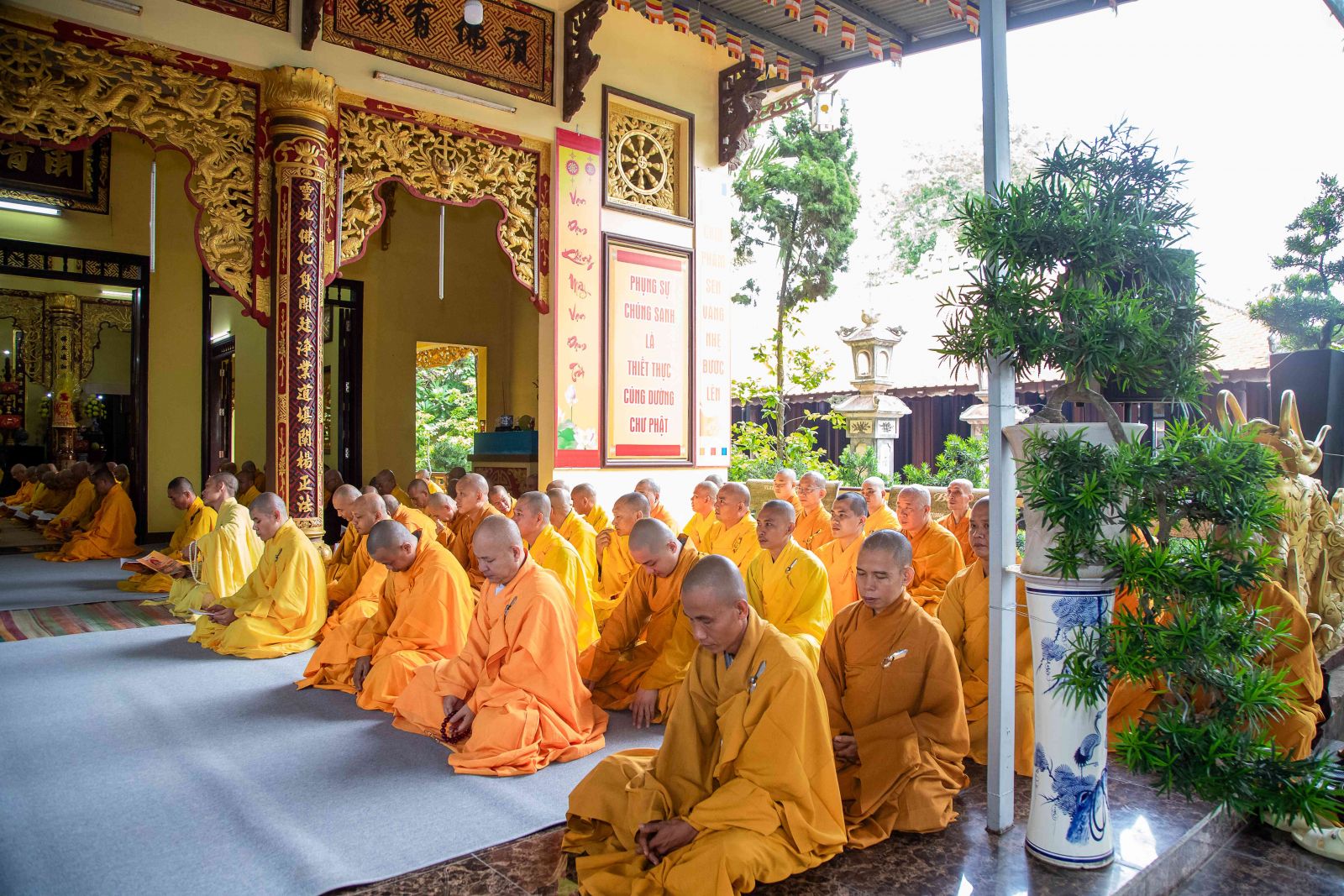 Tại chánh điện, chư Tôn giáo phẩm Ban Chứng minh, Ban chức sự Trường hạ niêm hương bạch Phật; toàn thể đại chúng thành kính đảnh lễ Tam bảo, thực hiện nghi thức Bố-tát theo pháp. Đây là kỳ Bố-tát vào ngày Rằm nên chư Tôn đức Tăng Ni cùng quý Phật tử thọ Bồ-tát giới đồng lắng nghe HT. Thích Thiện Đồng trùng tuyên Kinh Phạm Võng Bồ Tát giới.