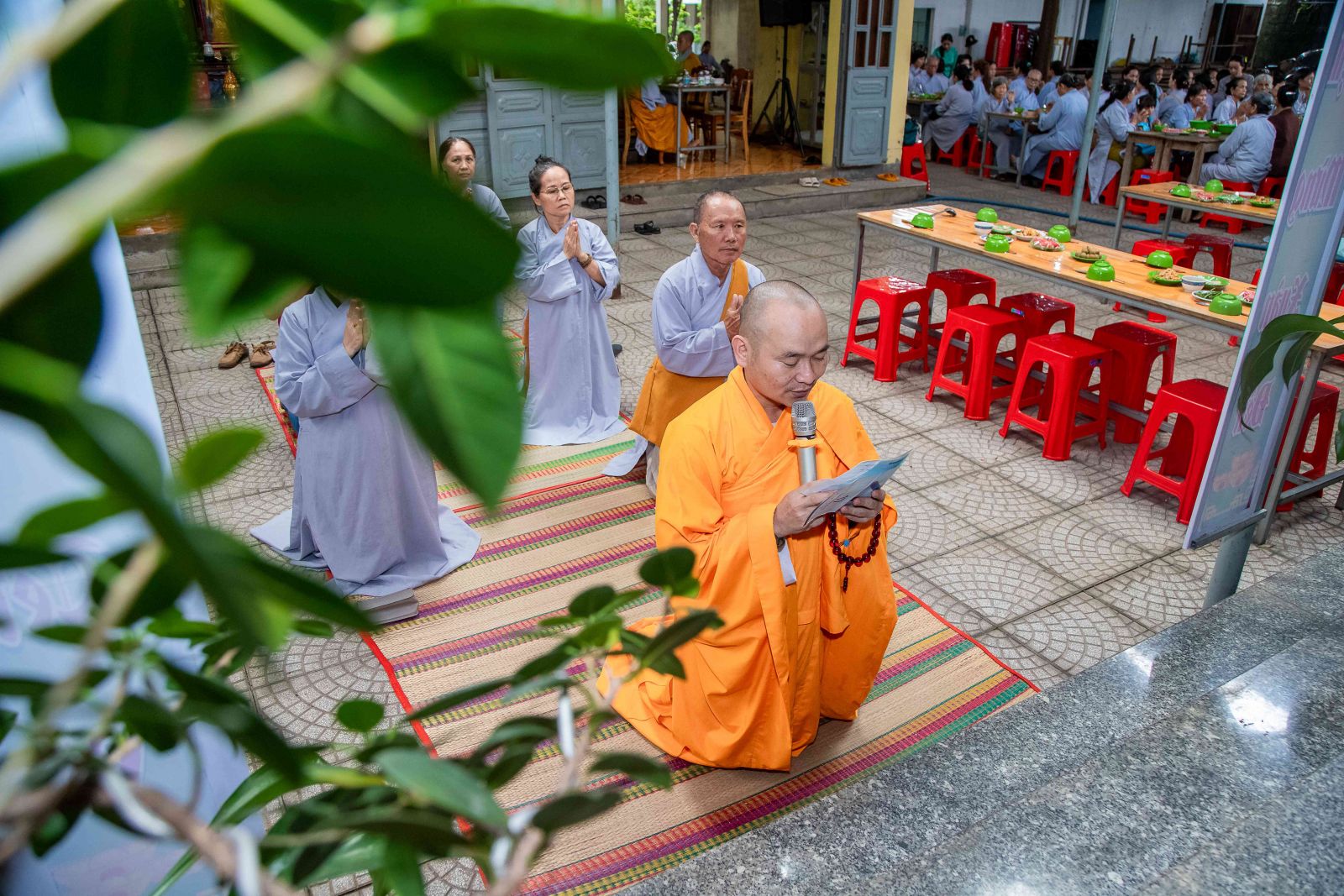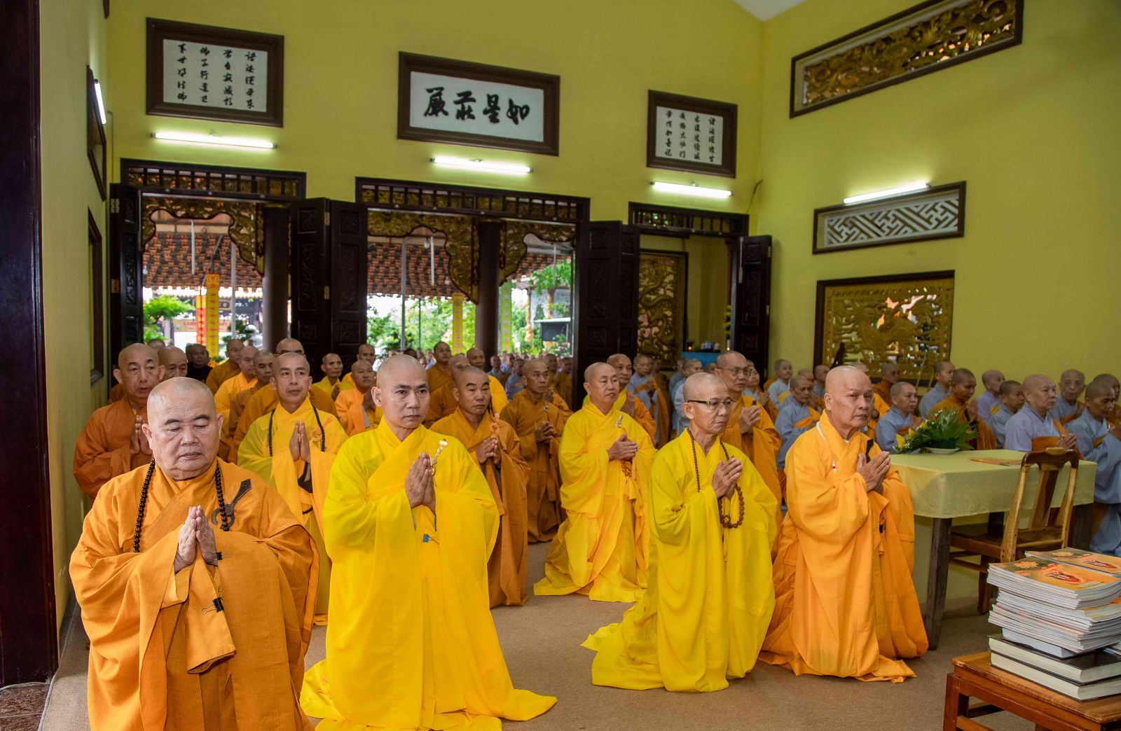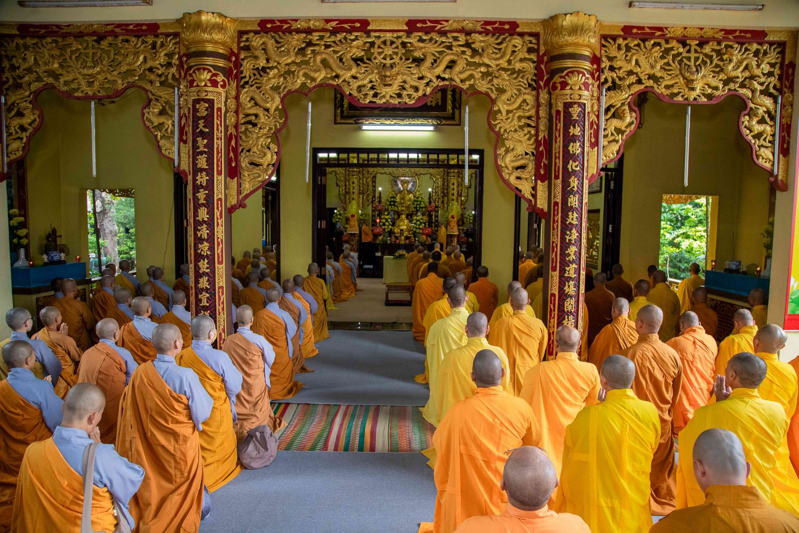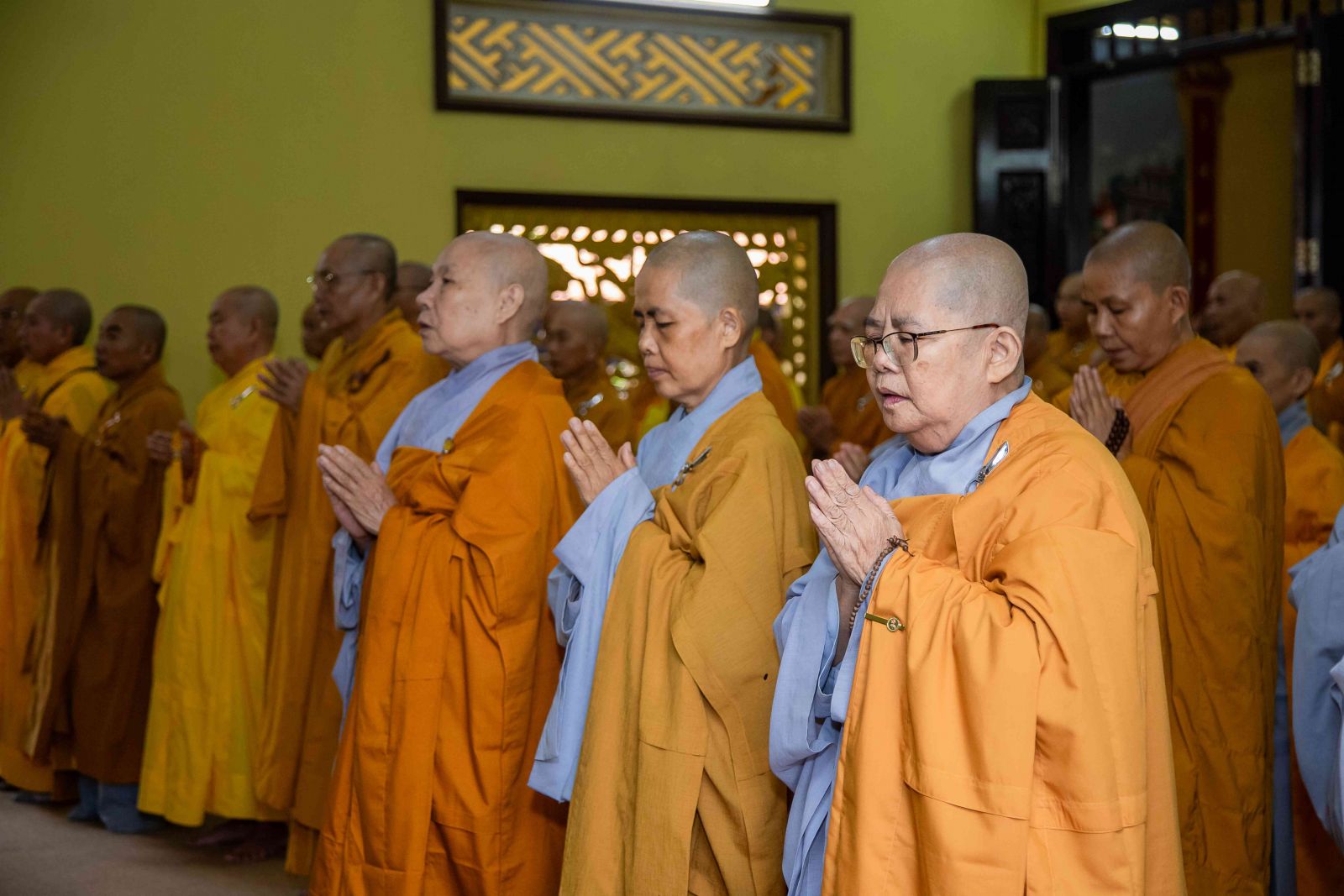 Tại chánh điện, chư Tôn giáo phẩm Ban Chứng minh, Ban chức sự Trường hạ niêm hương bạch Phật; toàn thể đại chúng thành kính đảnh lễ Tam bảo, thực hiện nghi thức Bố-tát theo pháp. Đây là kỳ Bố-tát vào ngày Rằm nên chư Tôn đức Tăng Ni cùng quý Phật tử thọ Bồ-tát giới đồng lắng nghe HT. Thích Thiện Đồng trùng tuyên Kinh Phạm Võng Bồ Tát giới.