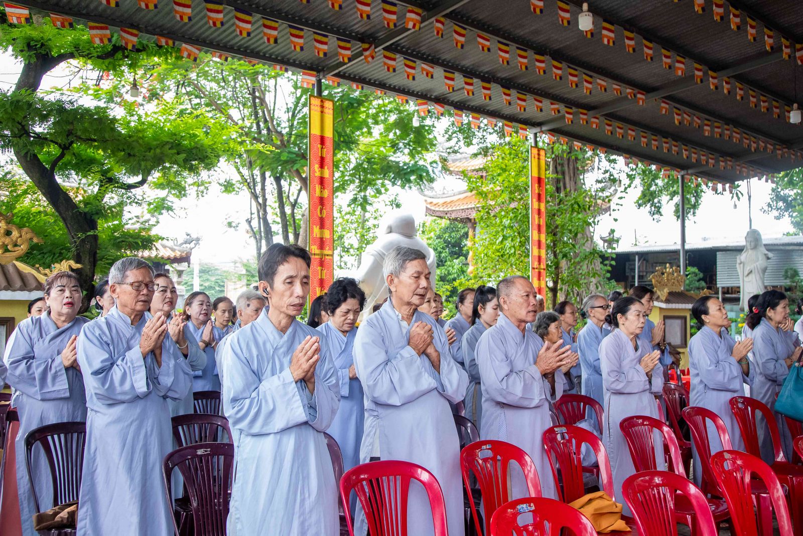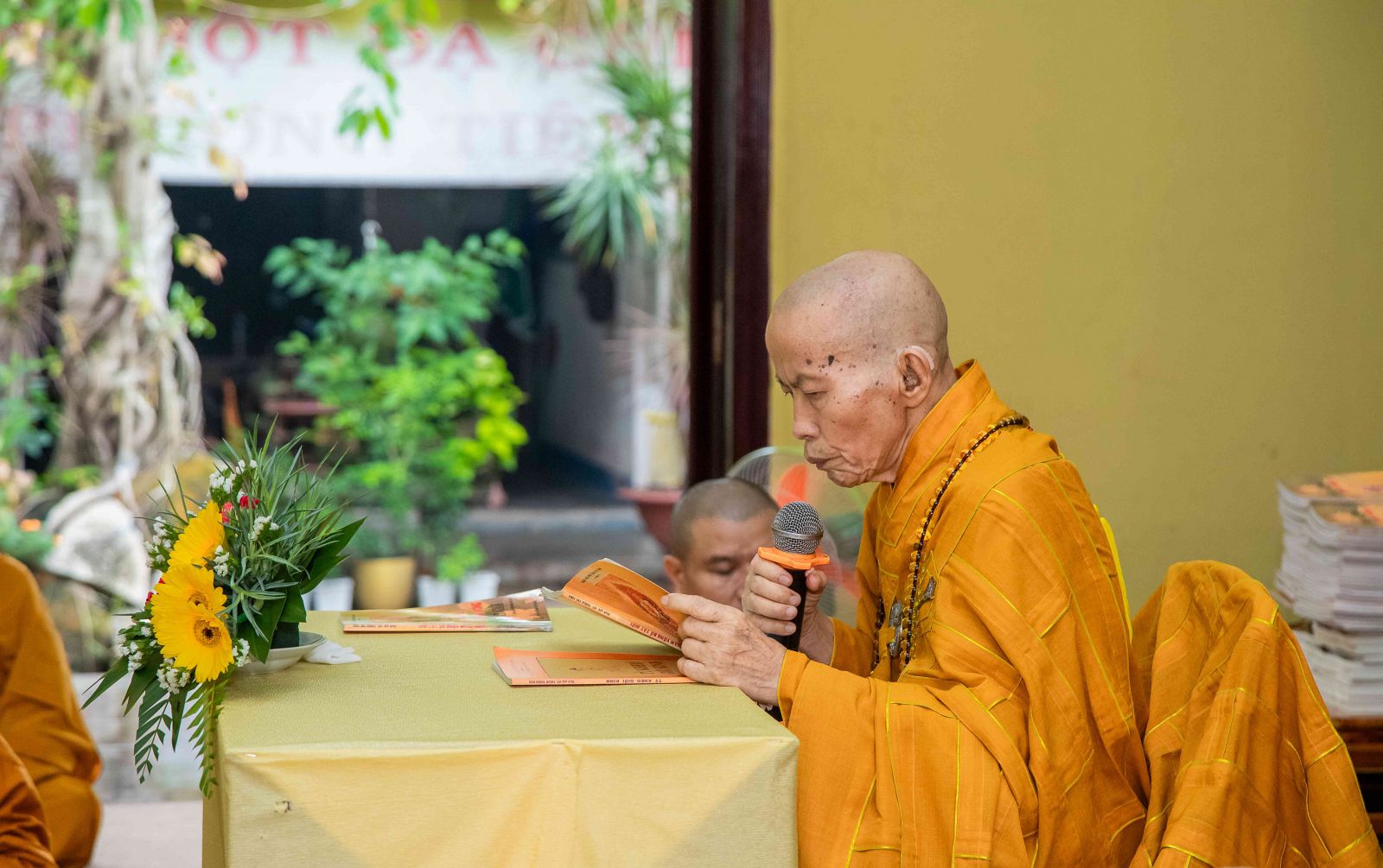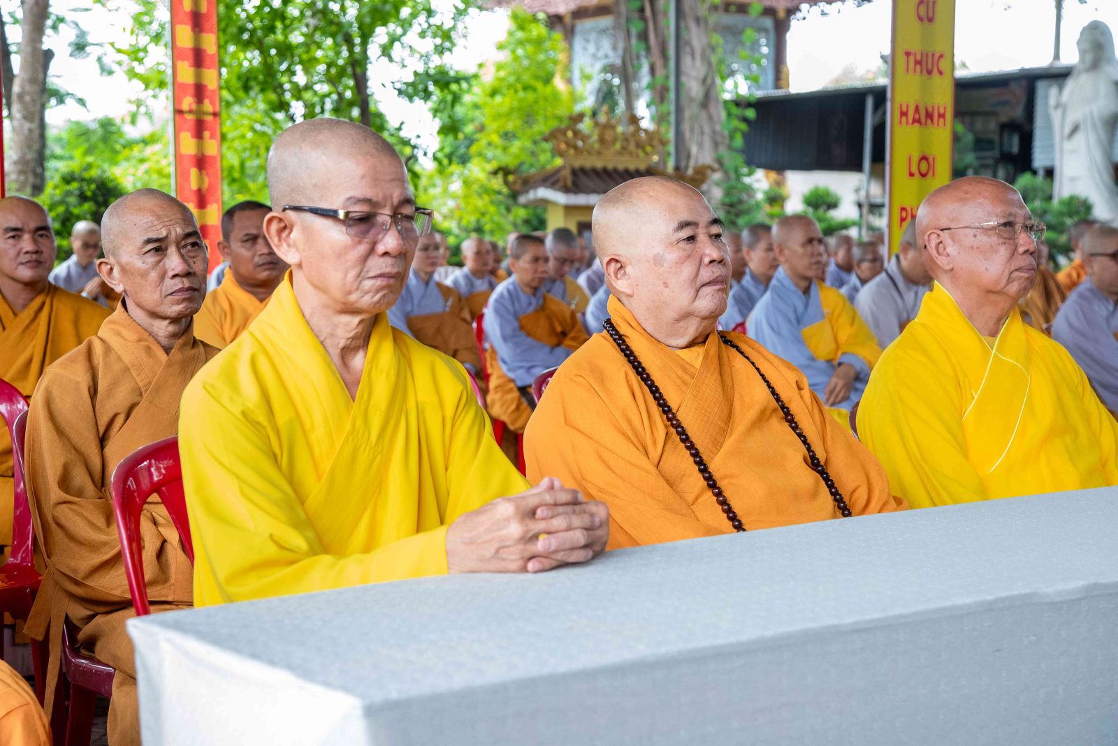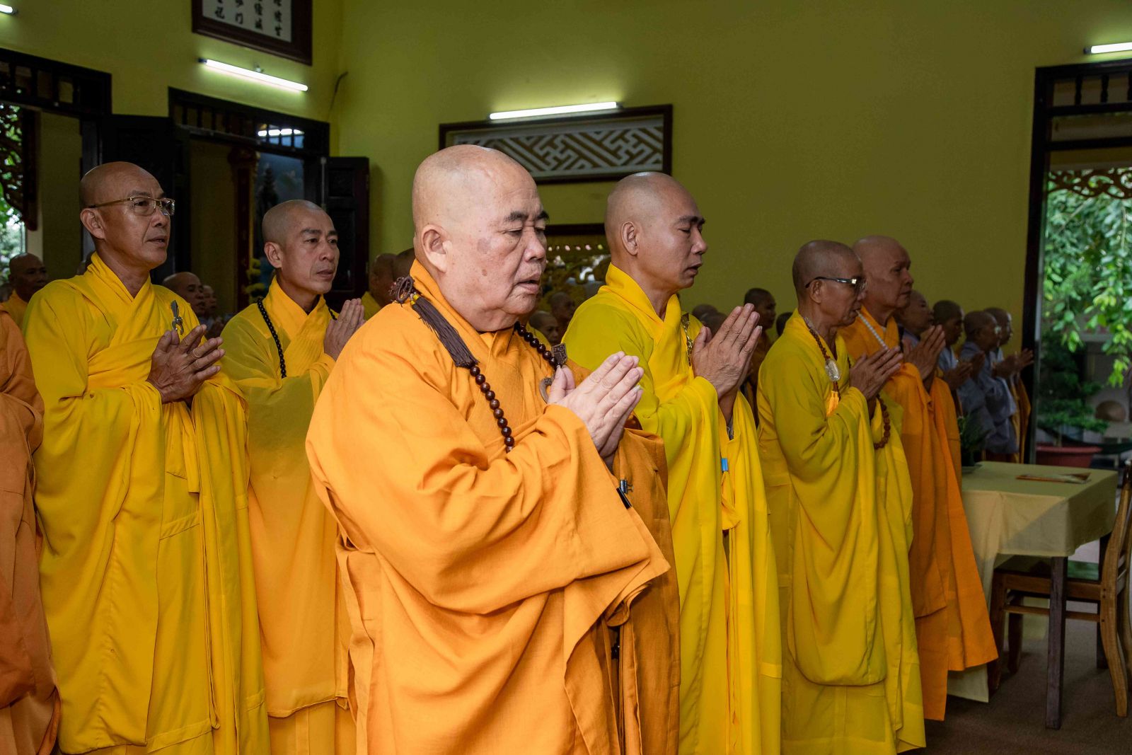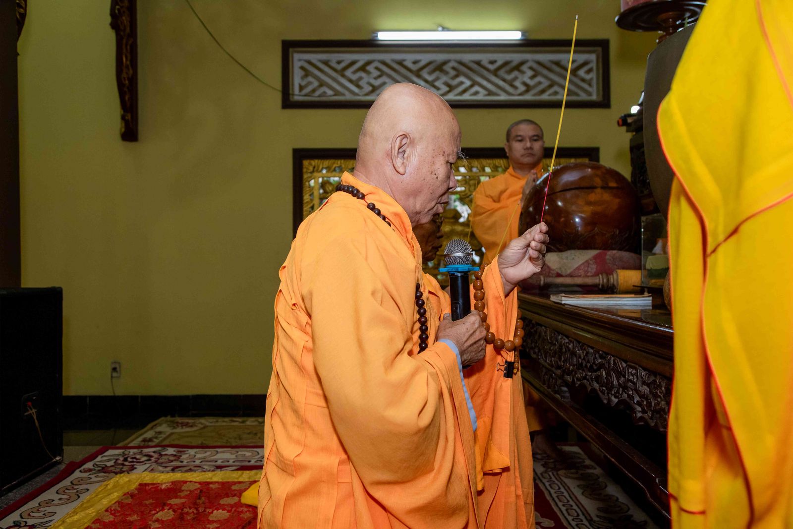 Tại chánh điện, chư Tôn giáo phẩm Ban Chứng minh, Ban chức sự Trường hạ niêm hương bạch Phật; toàn thể đại chúng thành kính đảnh lễ Tam bảo, thực hiện nghi thức Bố-tát theo pháp. Đây là kỳ Bố-tát vào ngày Rằm nên chư Tôn đức Tăng Ni cùng quý Phật tử thọ Bồ-tát giới đồng lắng nghe HT. Thích Thiện Đồng trùng tuyên Kinh Phạm Võng Bồ Tát giới.