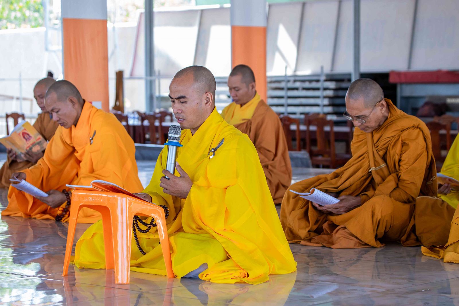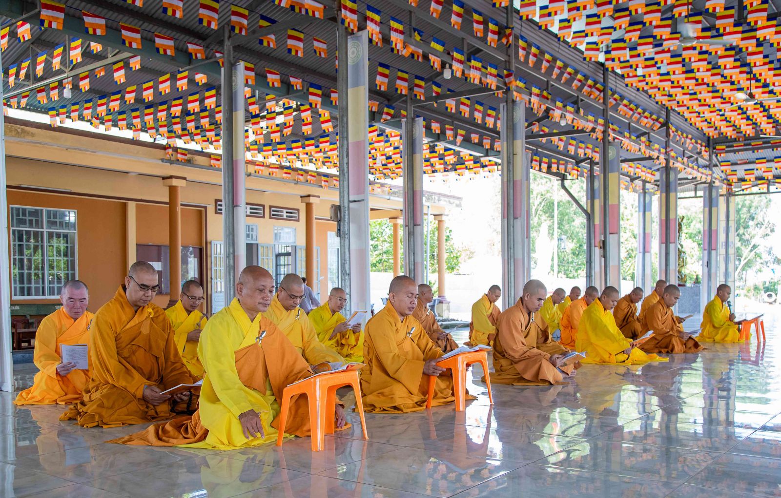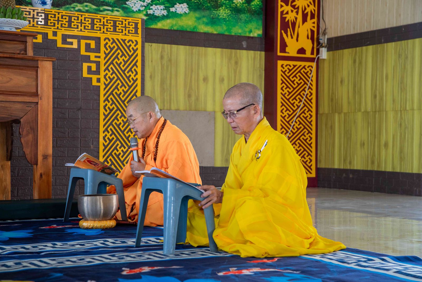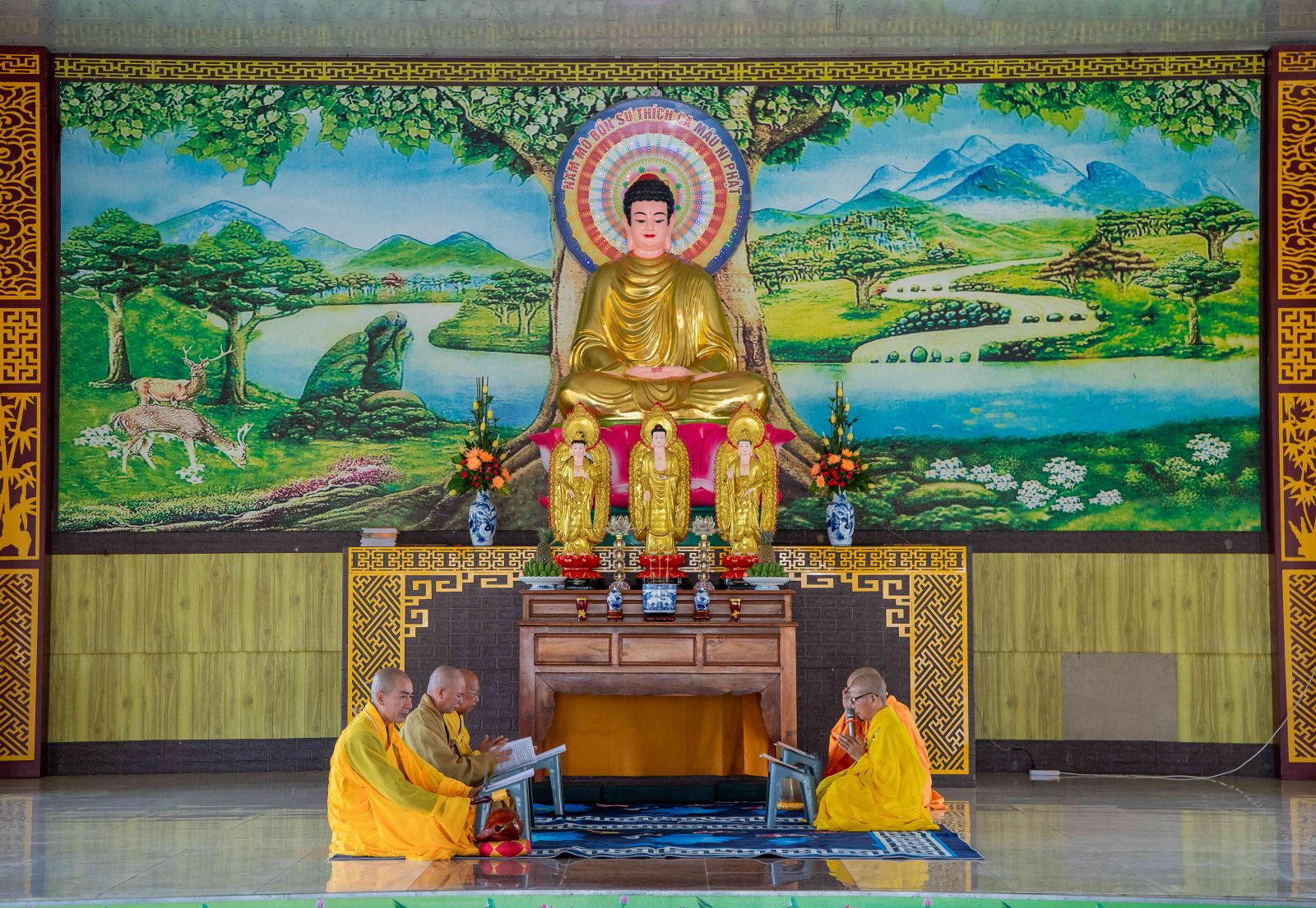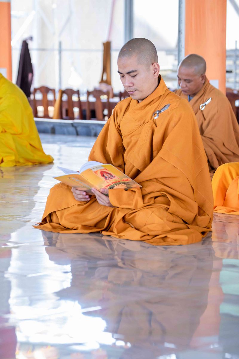 Tại Chánh điện, Chư tôn đức giáo phẩm Ban Chứng minh, chư Tôn đức Ban Trị sự đã niêm hương bạch Phật; toàn thể đại chúng thành kính đảnh lễ Tam bảo, thực hiện nghi thức Yết-ma Bố-tát, tụng giới. Kỳ Bố-tát hàng tháng ngoài mùa An cư kiết hạ nên toàn thể chư Tôn đức Tăng Ni đồng trì tụng Kinh Phạm Võng Bồ Tát Giới.
