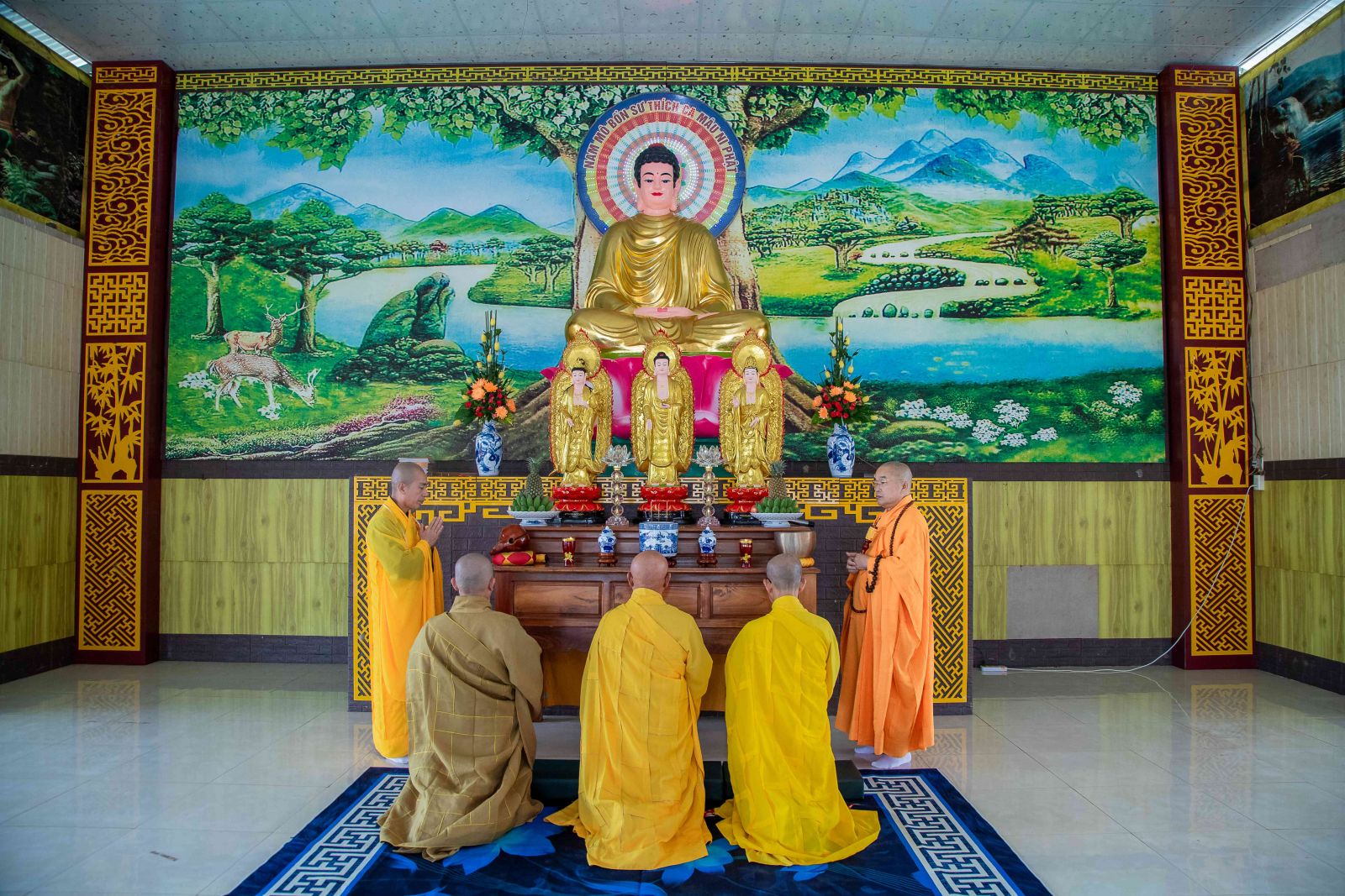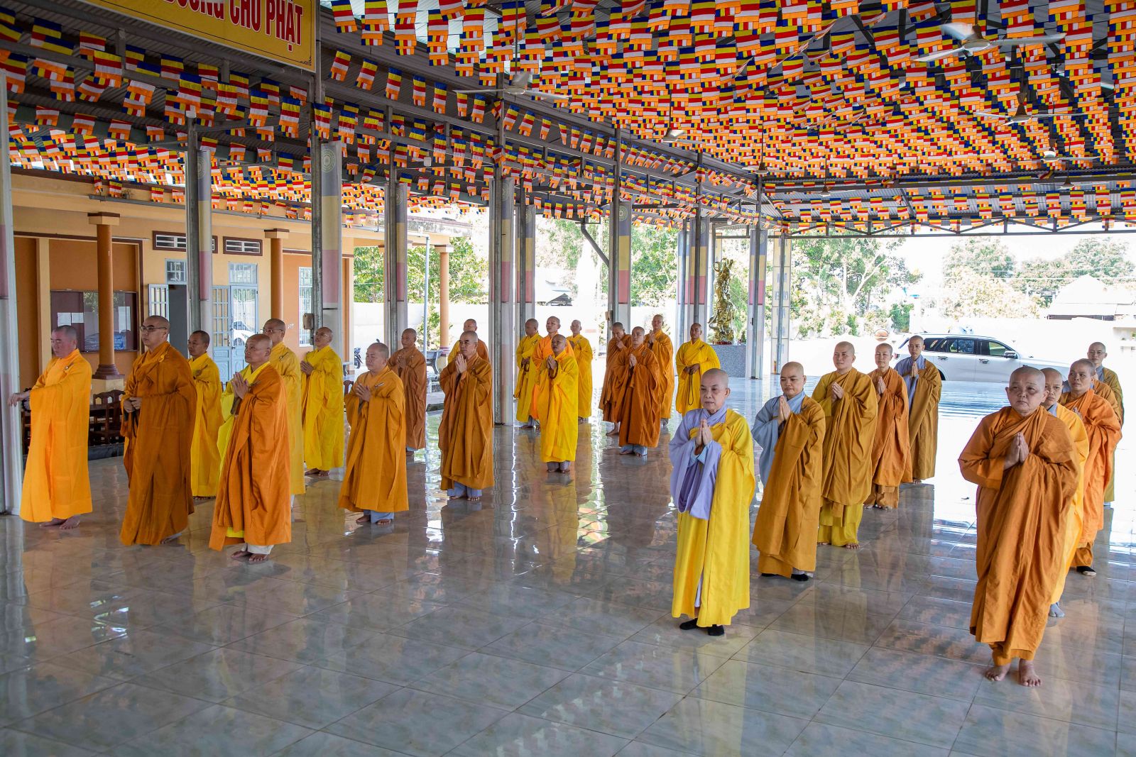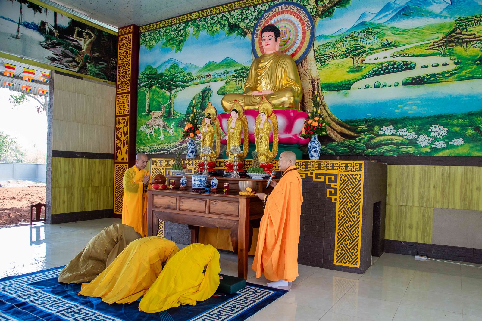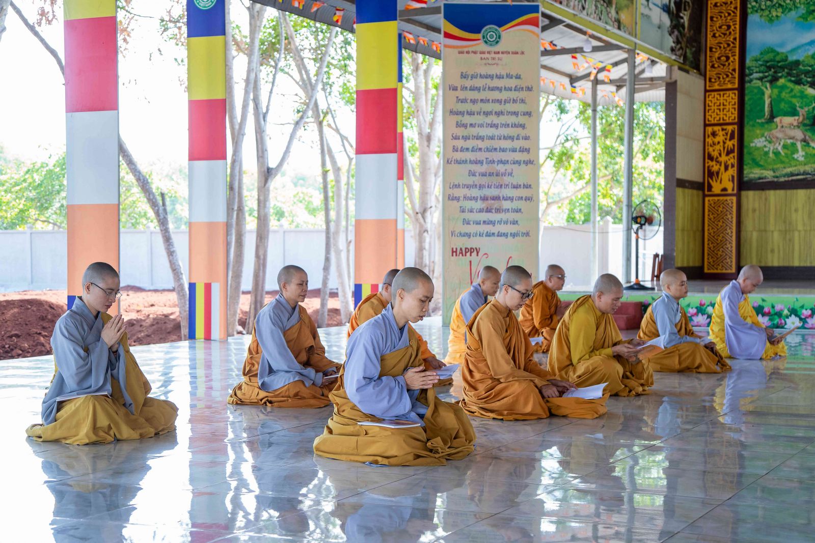 Tại Chánh điện, Chư tôn đức giáo phẩm Ban Chứng minh, chư Tôn đức Ban Trị sự đã niêm hương bạch Phật; toàn thể đại chúng thành kính đảnh lễ Tam bảo, thực hiện nghi thức Yết-ma Bố-tát, tụng giới. Kỳ Bố-tát hàng tháng ngoài mùa An cư kiết hạ nên toàn thể chư Tôn đức Tăng Ni đồng trì tụng Kinh Phạm Võng Bồ Tát Giới.