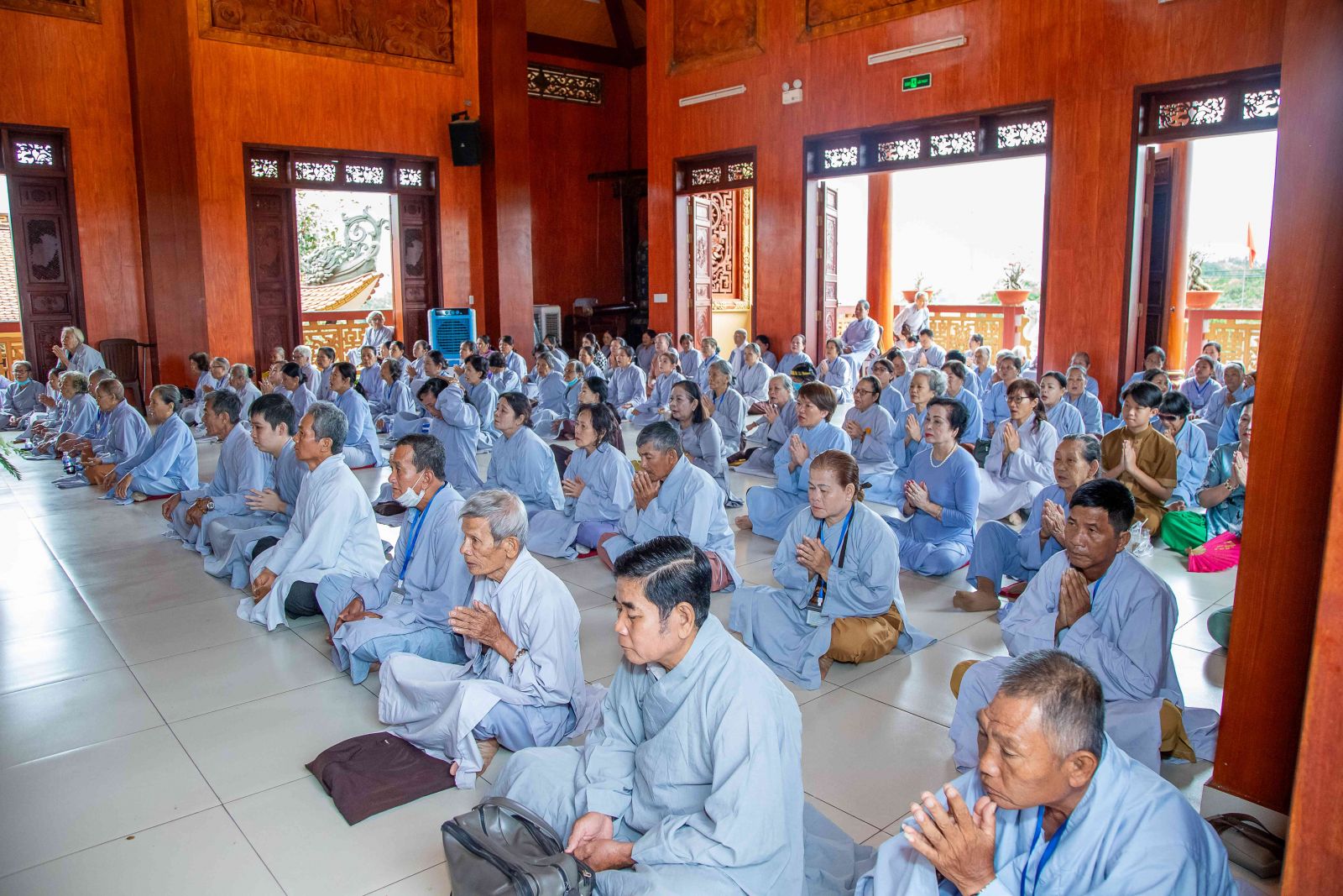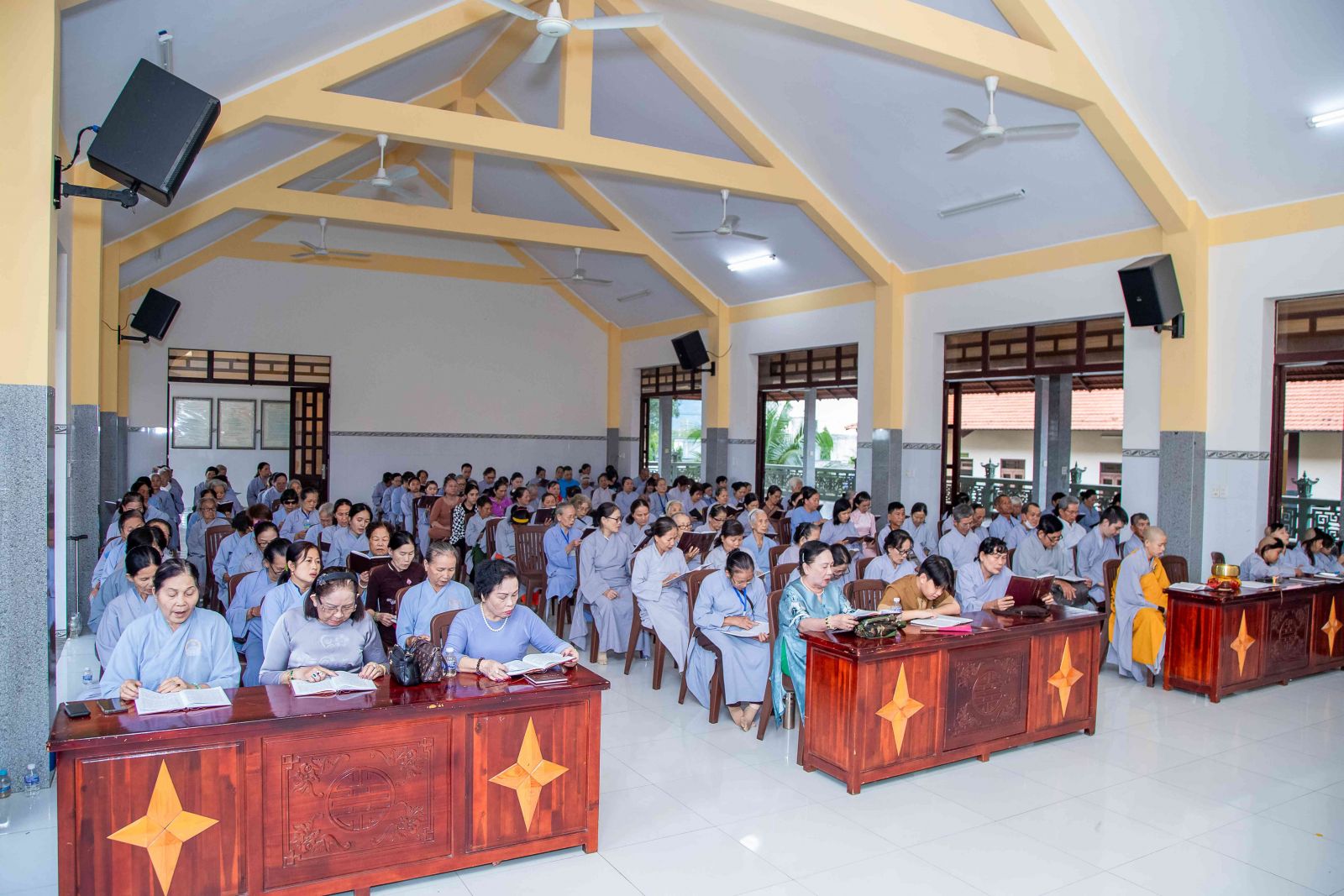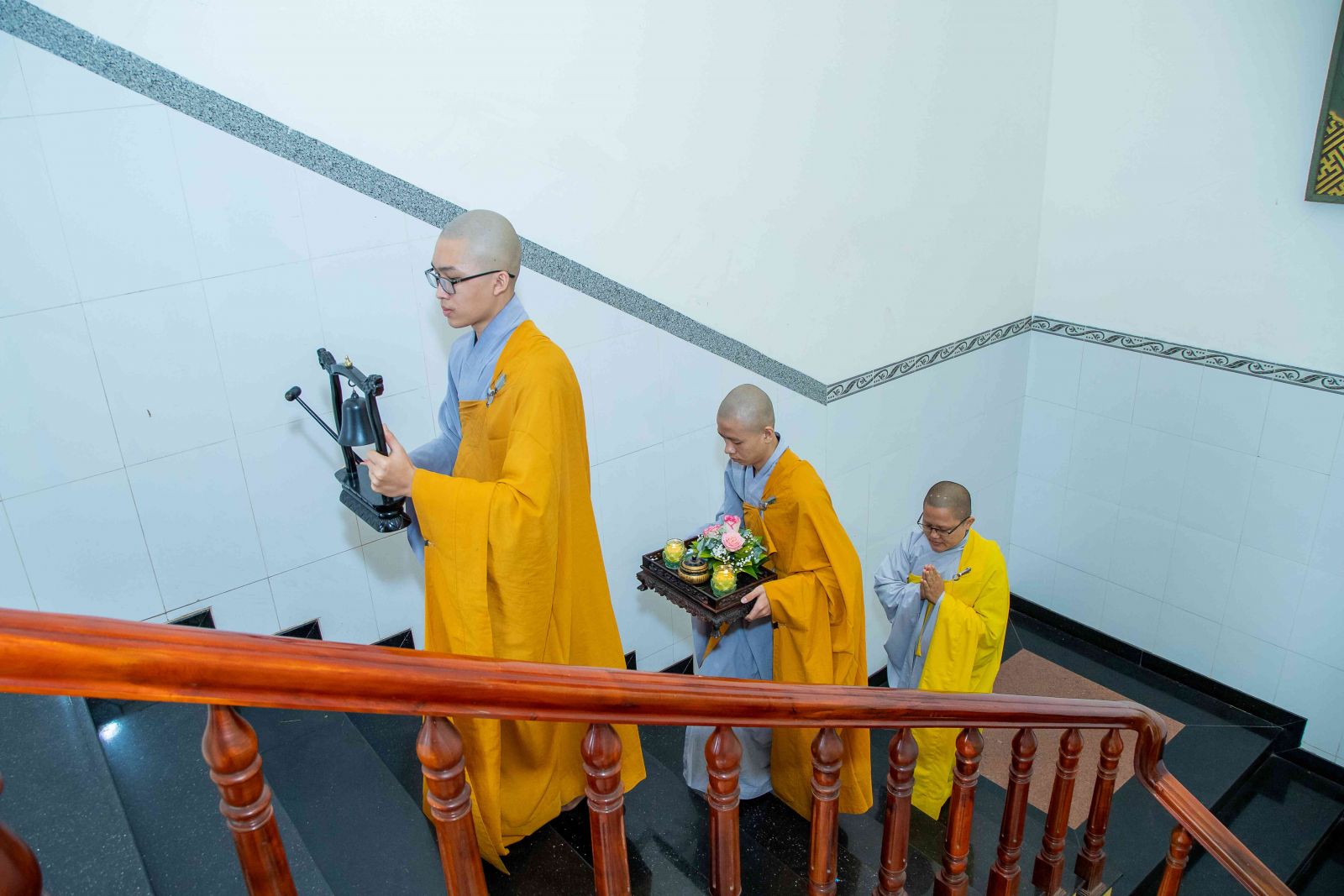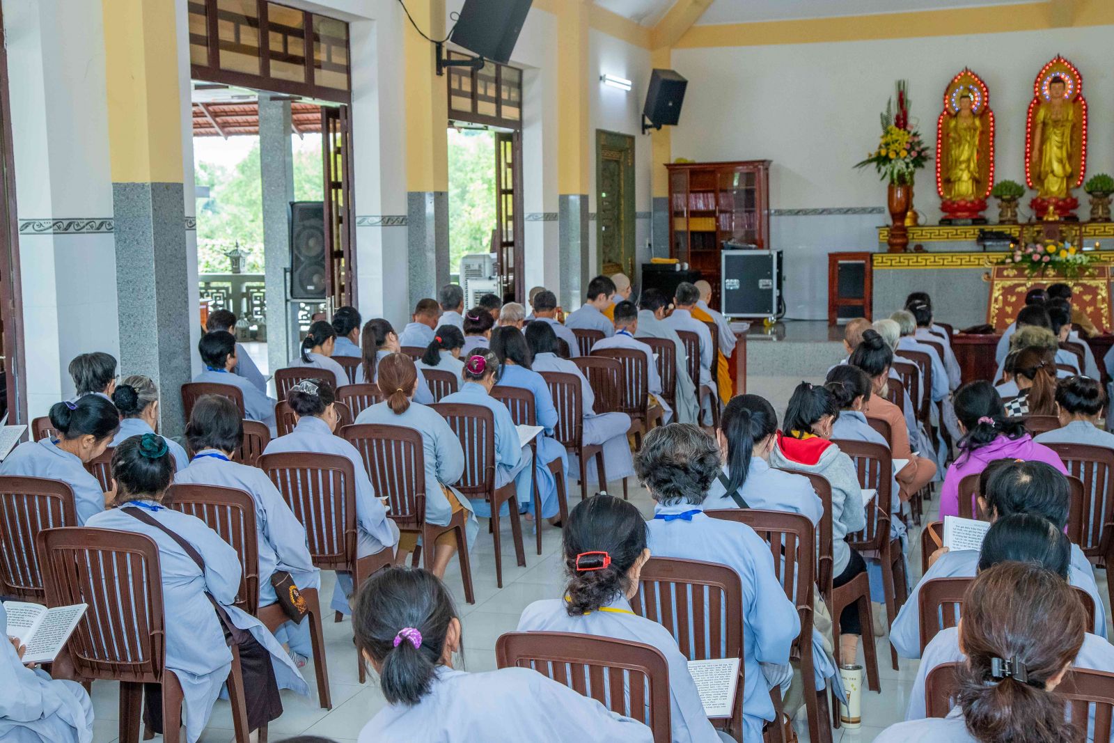Vào lúc 07h00’ sau khi dùng điểm tâm sáng xong, cả hội chúng vân tập về tại Chánh điện để cung đón chư Tăng quang lâm niêm hương, đảnh lễ Tam bảo khai khóa tu học. Cả đại chúng bắt đầu tụng kinh sau đó kinh hành về Giảng đường để chuẩn bị lắng nghe Pháp thoại.