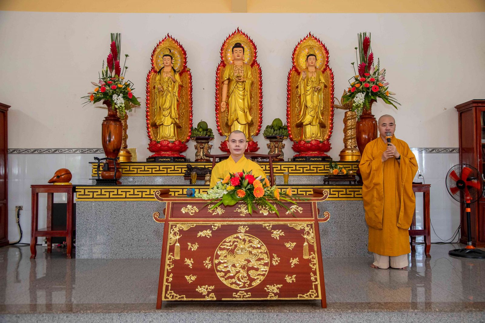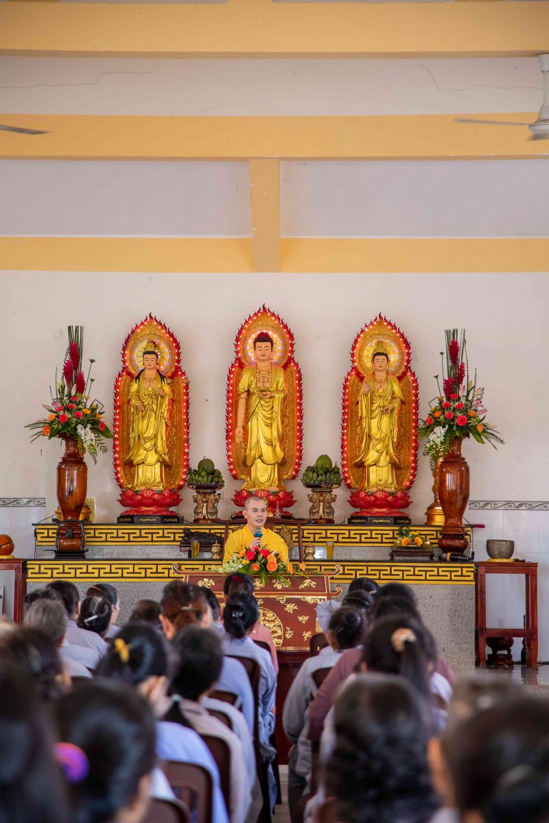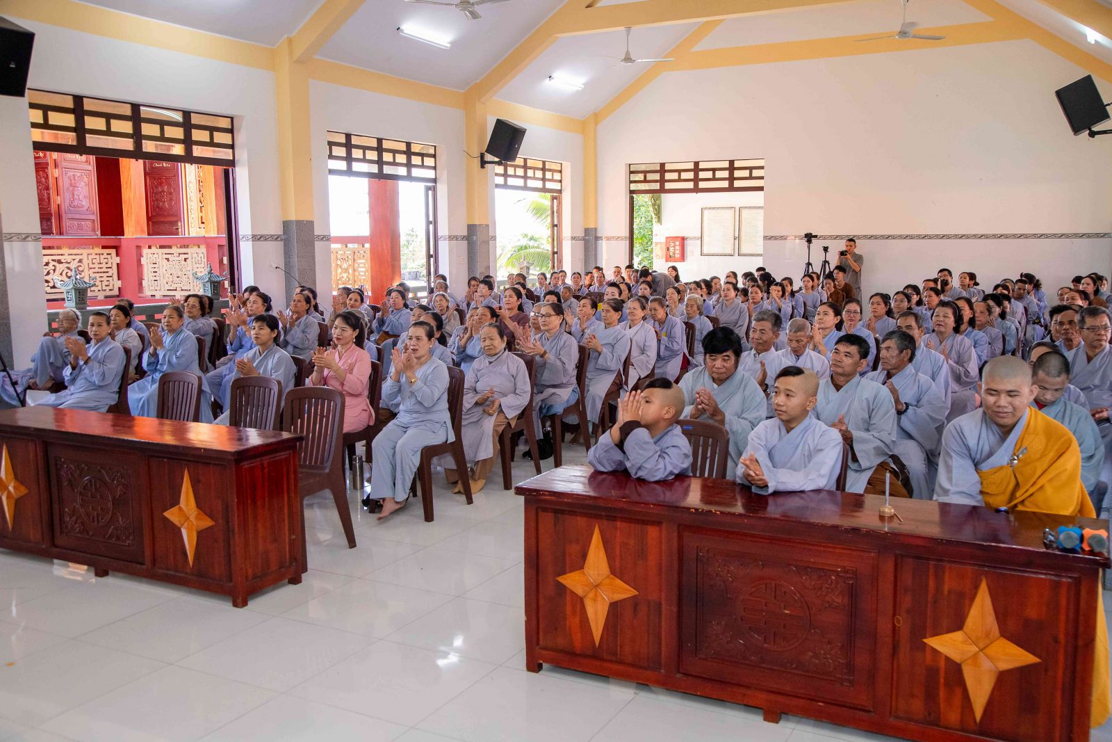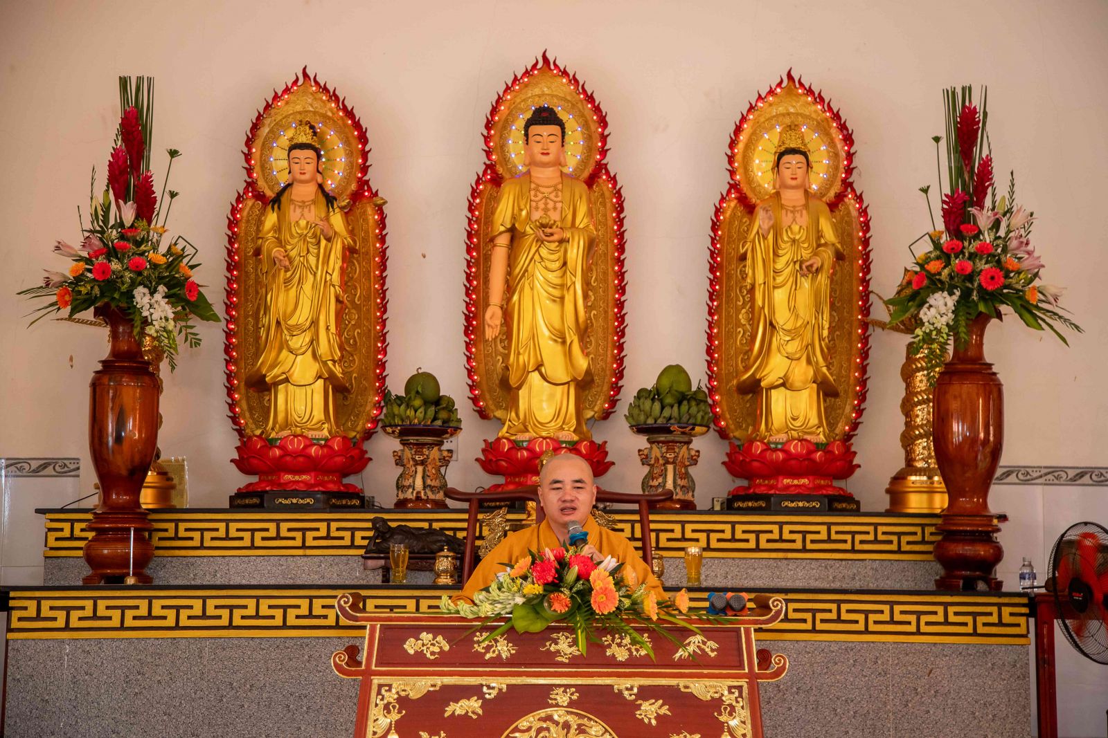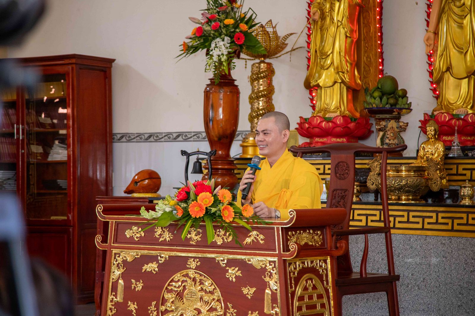 Sau đó toàn thể đạo tràng trang nghiêm cung đón ĐĐ. Thích Khải Thành – Phó Trưởng Ban Thường trực Ban Hoằng pháp GHPGVN Tp. Biên Hoà, trụ trì chùa Pháp Bảo, Tp. Biên Hòa, tỉnh Đồng Nai quang lâm thuyết giảng. Đến với đạo tràng Đại đức giảng sư đã chia sẻ bài pháp thoại với đề tài: “Rèn luyện tâm trí sống đời bình an”. Trong bài pháp thoại Đại đức nhấn mạnh: “Trong quá trình tu học hằng ngày chúng ta cần trang bị cho bản thân mình: Thứ nhất là phải siêng năng lễ Phật để nhớ đến công hạnh của chư Phật, chư Bồ-tát và dẹp trừ bản ngã của chính mình; Thứ hai là cố gắng hành trì ngũ giới vì đó là nền tảng đạo đức căn bản của người Phật tử tại gia; Thứ ba là phải biết nuôi dưỡng lòng từ bi, luôn đem lòng từ ban rải đến với chúng sanh và giúp chúng sanh nhổ sạch những gốc rễ của khổ đau, đạt đến sự an vui hạnh phúc; Thứ tư là luôn thực hành Mười điều lành ngõ hầu giúp tăng trưởng công đức cho tự thân; Thứ năm là thực tập thiền định và chánh niệm để tâm chúng ta luôn được thanh tịnh và không bị bơn nhơ của phiền não chi phối; Thứ sáu là biết quán niệm về vô thường để giúp chúng ta sẽ bình thản trước những biến chuyển đổi thay của cuộc đời, không còn đau khổ trước cảnh tử biệt sinh ly”.