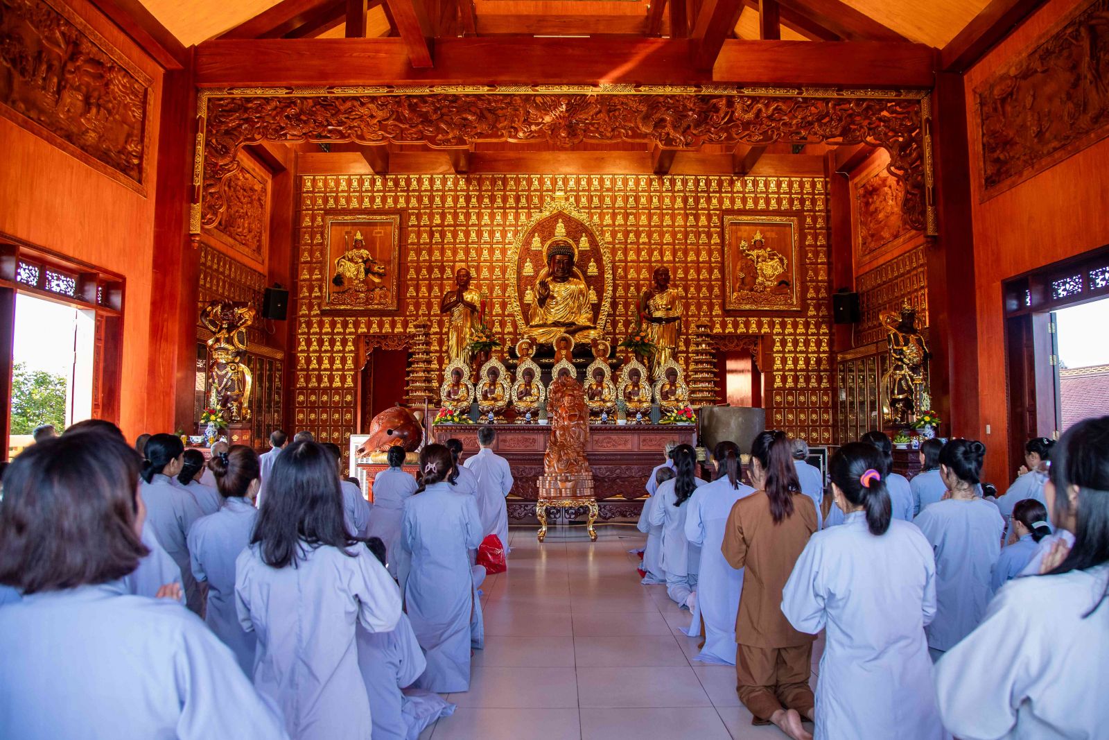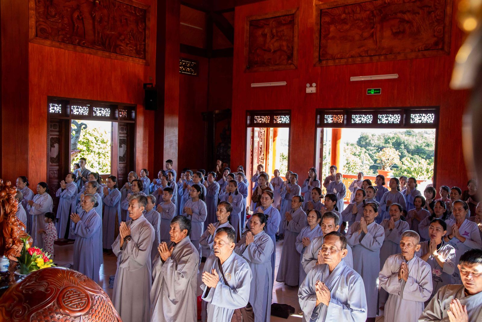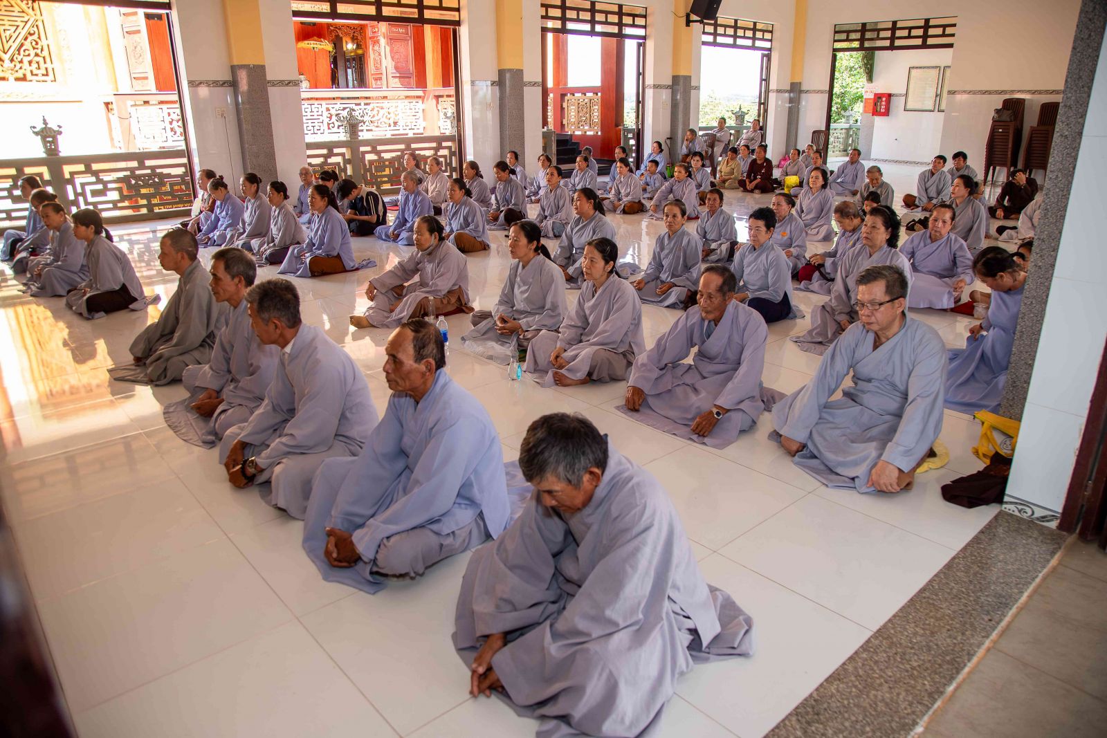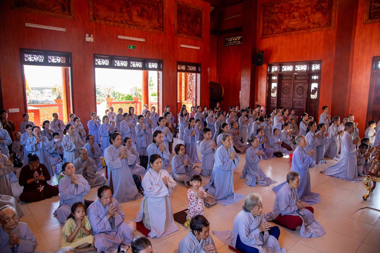Từ sáng sớm quý thiện tín nam nữ Phật tử đã vân tập về Chùa Minh Hiệp. Sau khi dùng điểm tâm sáng xong, toàn thể đạo tràng vân tập về tại Chánh điện để cung đón Đại đức trụ trì cùng chư Tăng quang lâm niêm hương, đảnh lễ Tam bảo khai khóa tu học. Đại chúng bắt đầu tụng kinh sau đó kinh hành về giảng đường chính để chuẩn bị lắng nghe pháp thoại.