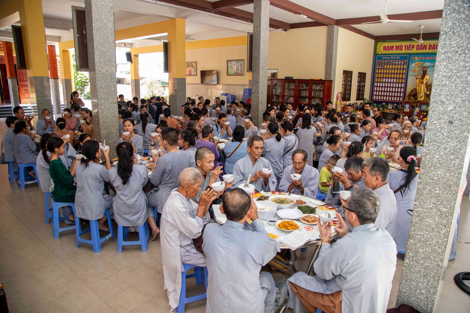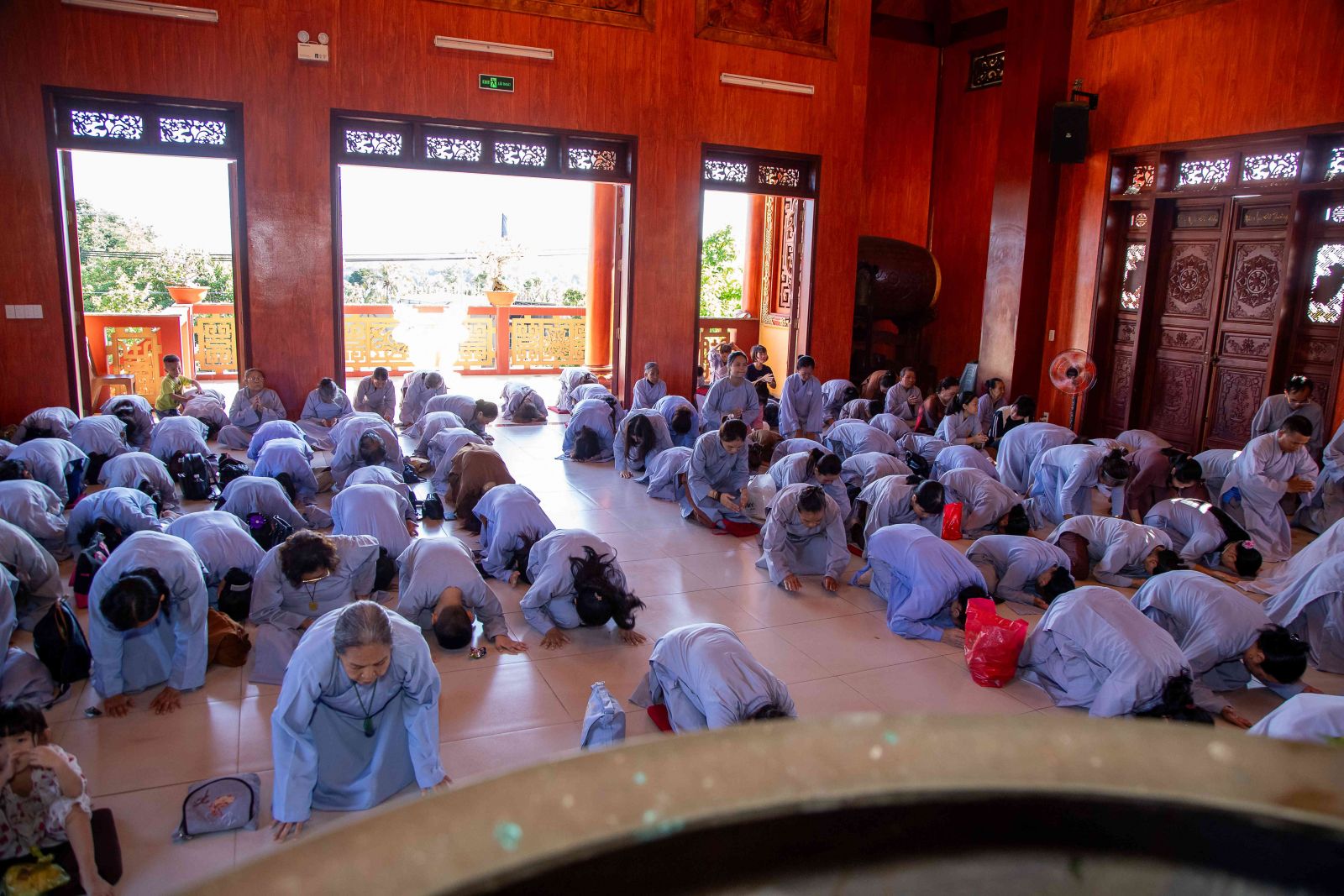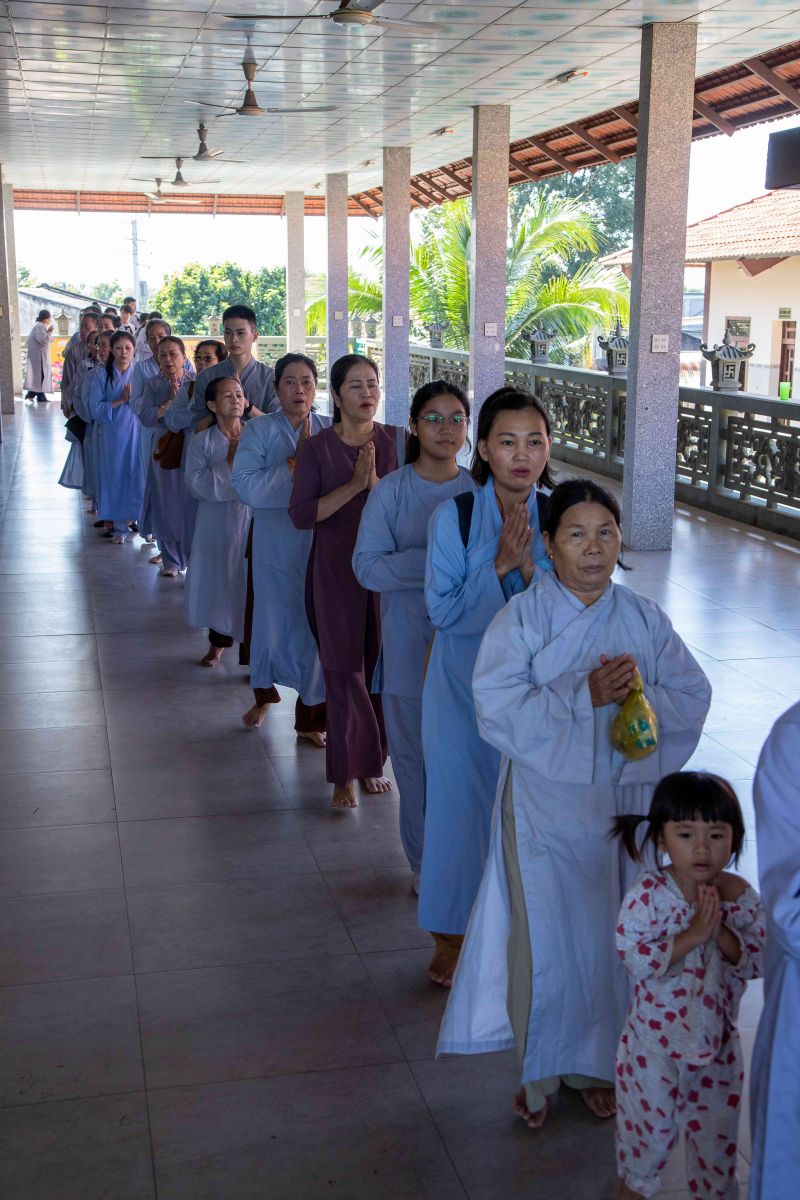 Từ sáng sớm quý thiện tín nam nữ Phật tử đã vân tập về Chùa Minh Hiệp. Sau khi dùng điểm tâm sáng xong, toàn thể đạo tràng vân tập về tại Chánh điện để cung đón Đại đức trụ trì cùng chư Tăng quang lâm niêm hương, đảnh lễ Tam bảo khai khóa tu học. Đại chúng bắt đầu tụng kinh sau đó kinh hành về giảng đường chính để chuẩn bị lắng nghe pháp thoại.