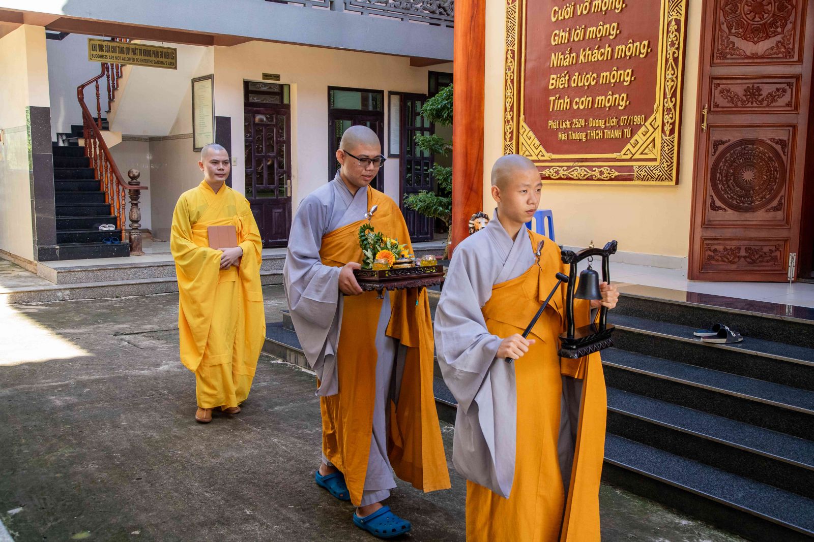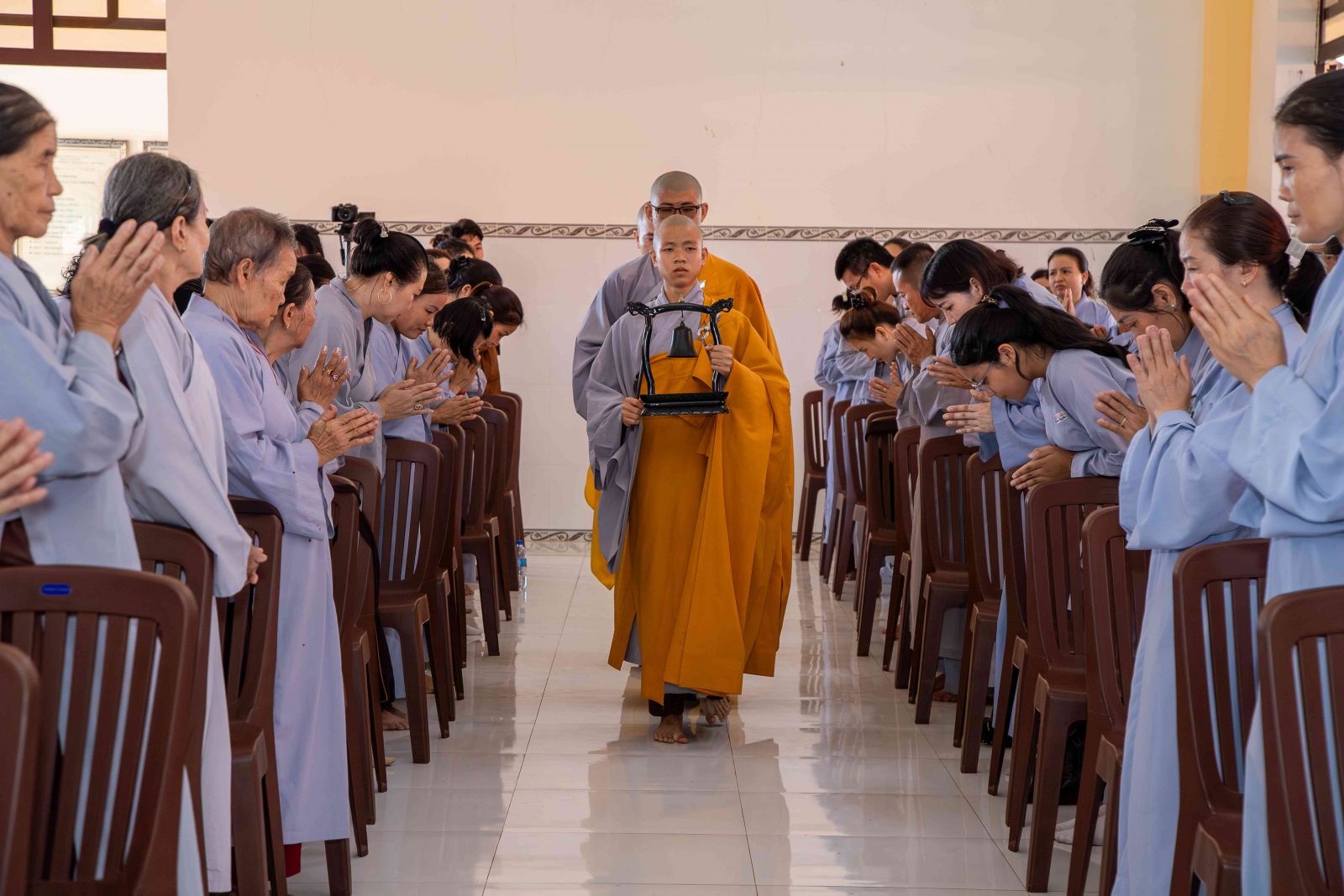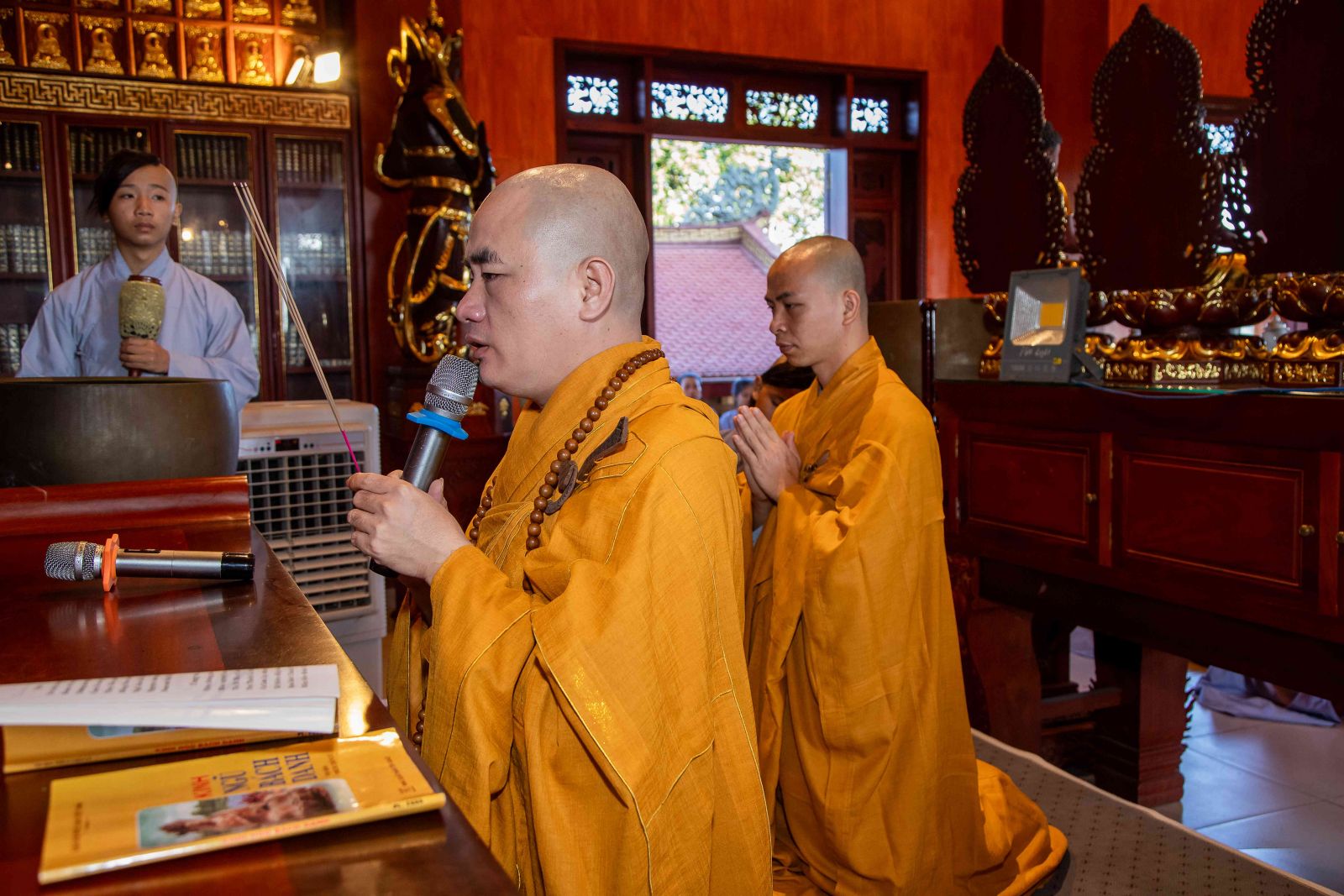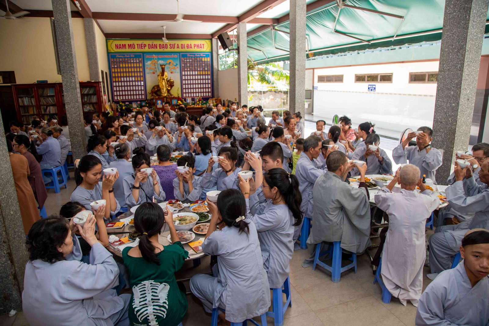 Từ sáng sớm quý thiện tín nam nữ Phật tử đã vân tập về Chùa Minh Hiệp. Sau khi dùng điểm tâm sáng xong, toàn thể đạo tràng vân tập về tại Chánh điện để cung đón Đại đức trụ trì cùng chư Tăng quang lâm niêm hương, đảnh lễ Tam bảo khai khóa tu học. Đại chúng bắt đầu tụng kinh sau đó kinh hành về giảng đường chính để chuẩn bị lắng nghe pháp thoại.