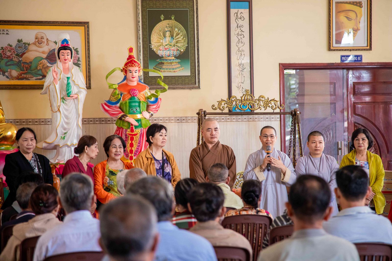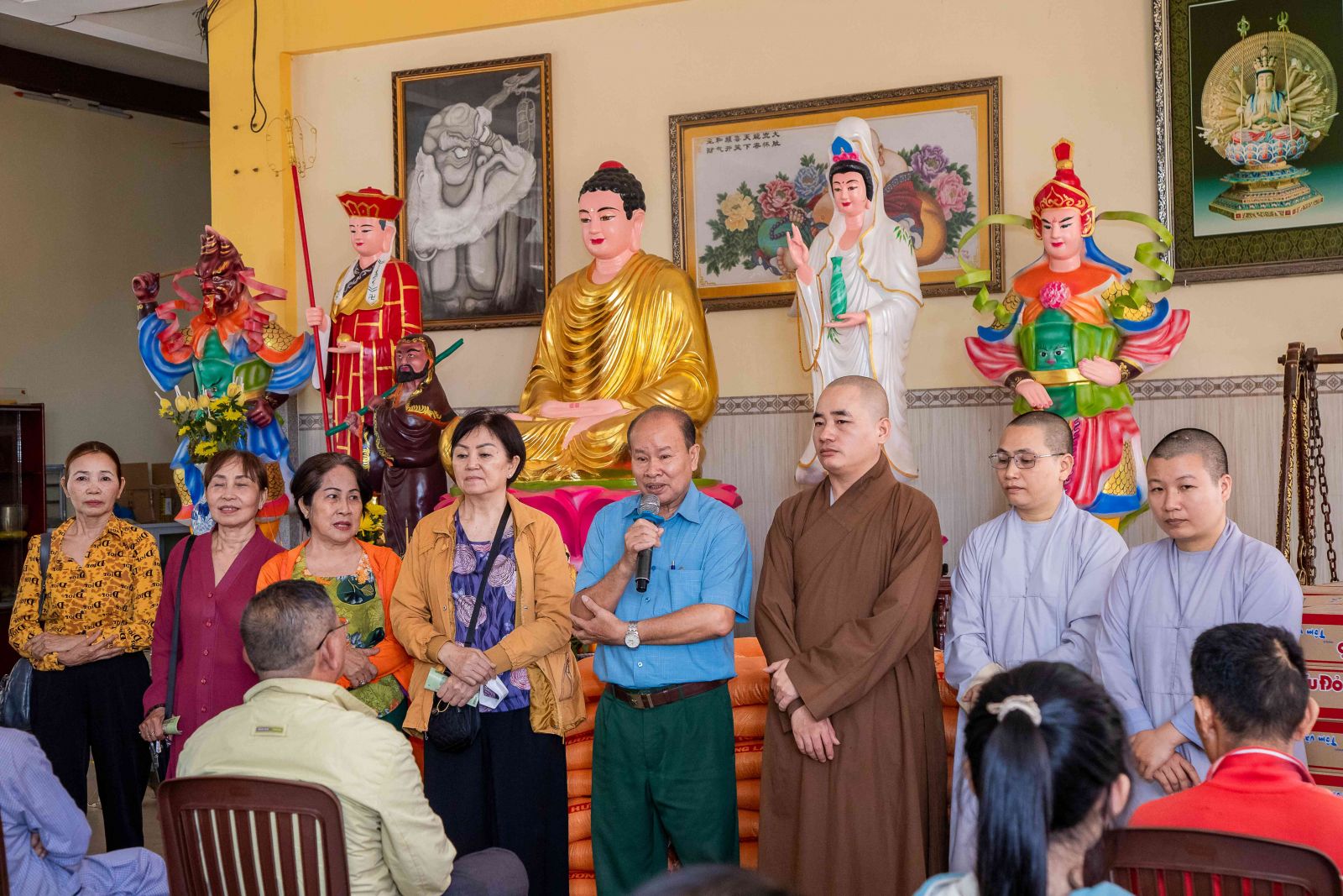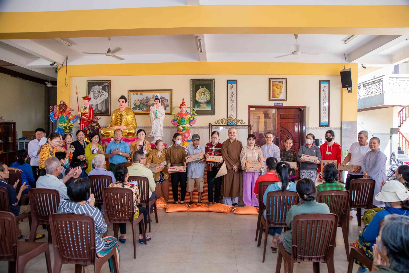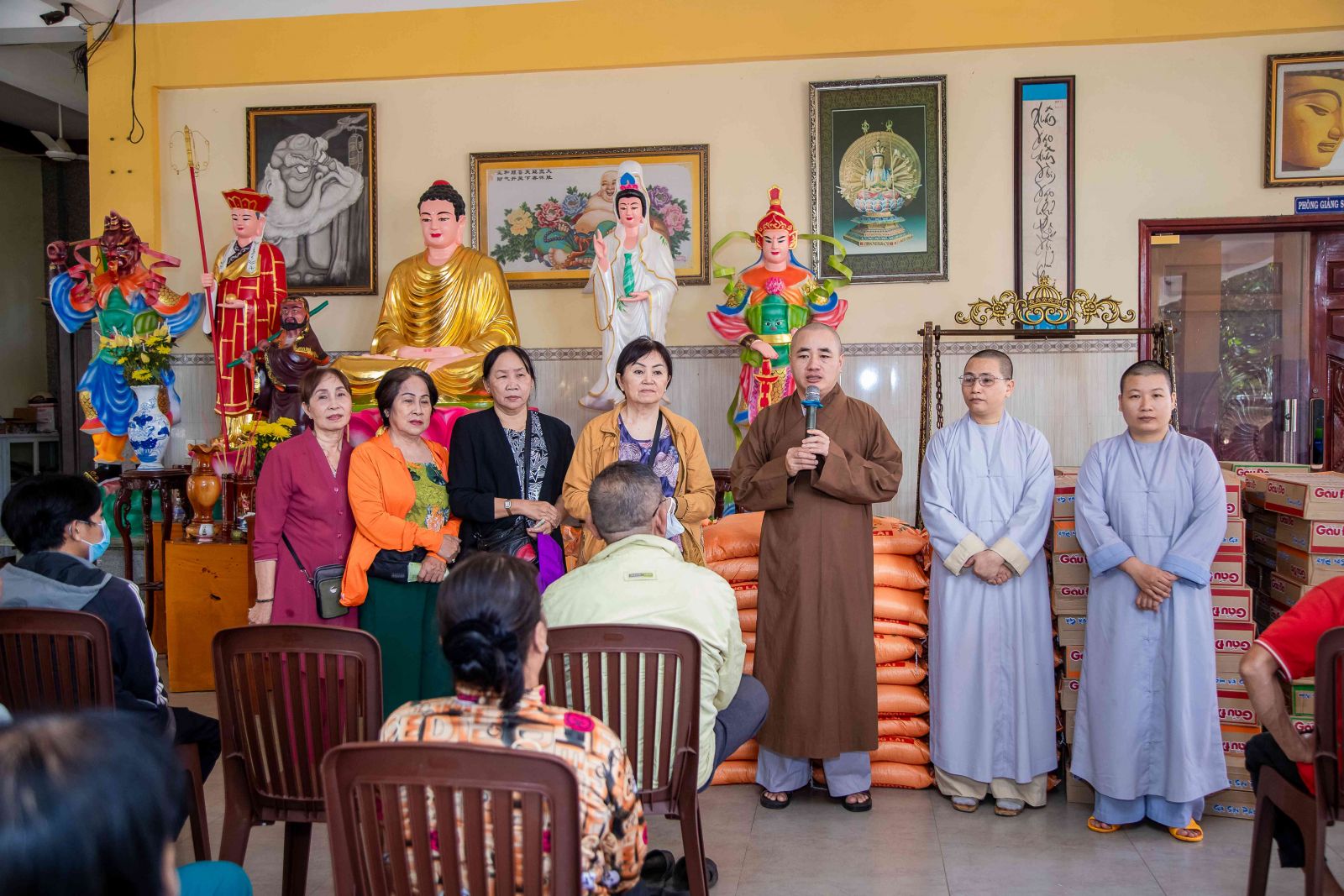 Đại đức trụ trì đã chia sẻ đến với hội chúng nhân duyên buổi trao quà yêu thương ngày hôm nay. Đại đức nhấn mạnh: “Trong cuộc sống này có rất nhiều người giàu có, tiền ròng bạc chảy nhưng không phải ai cũng biết chia sẻ đến những người có hoàn cảnh khó khăn. Sở dĩ tại sao ở chùa quý Thầy Cô thường hay kết nối các vị Mạnh thường quân, người Phật tử hộ đạo để chia sẻ đến những hoàn cảnh khó khăn. Bởi những người tu học theo đạo Phật luôn lấy tinh thần từ bi cứu khổ ban vui làm đầu, luôn cảm thương cho người bất hạnh. Người con Phật dù xuất gia hay tại gia đi nữa khi thấy mình có điều kiện hơn những người khác họ tự nhận thấy mình có chút phước báu hơn người, họ thấy cần san sẻ ái tài của mình, do mình dùng công sức, trí lực bản thân mà đem cho những người thiếu phước báu, kém may mắn hơn người khác đó chính là nghĩa cử cao đẹp của người con Phật. Chính vì vậy quý bà con mỗi khi nhận quà ở đây hay bất cứ nơi đâu thì hãy nghĩ tưởng đến tình thương, sự chia sẻ của những người lao động vất vả để dành tiền bạc san sẻ bớt cho chúng ta, đó chính là tinh thần ăn quả nhớ kẻ trồng cây, tinh thần tri ân cao đẹp của con người. Hôm nay đây cũng vậy vì cảm thương cho những nạn nhân nhiễm chất độc da cam/đioxin nên các Phật tử đã về đây để chia sẻ đến quý vị, không phân biệt bất cứ tôn giáo nào và chỉ một mục đích duy nhất đó là lan tỏa tình thương trong hạnh bố thí của Phật dạy góp phần giúp đời sống xã hội ngày càng tốt đẹp hơn, hạnh phúc hơn”.