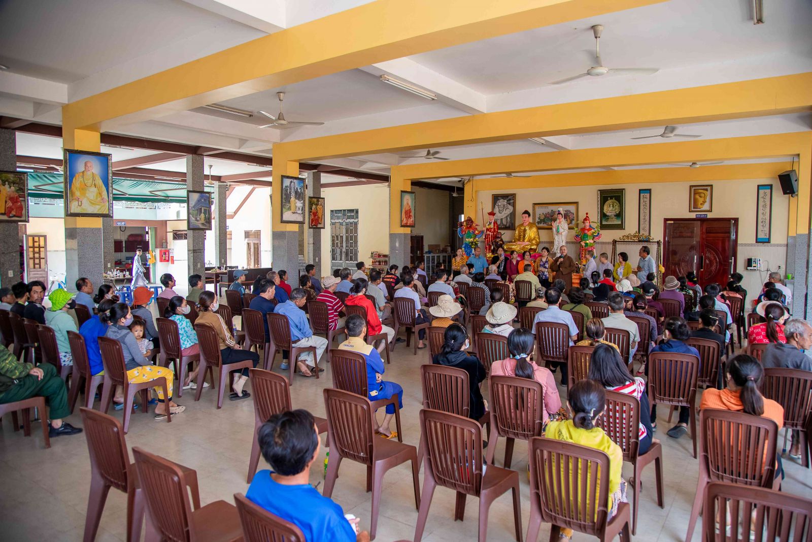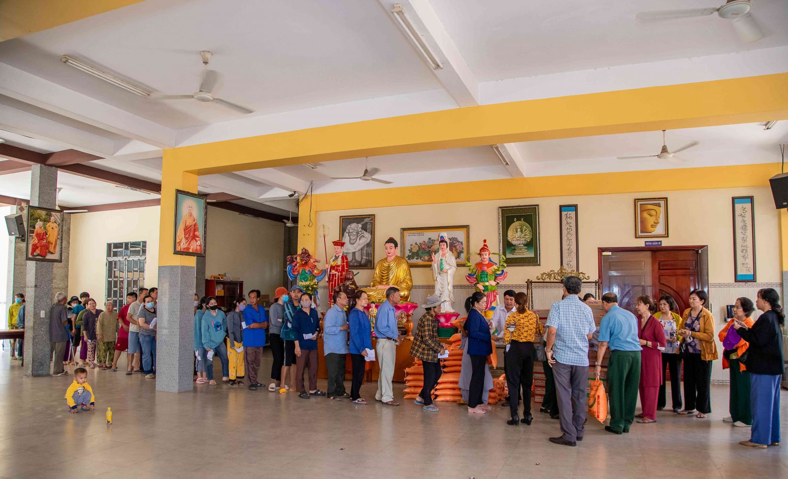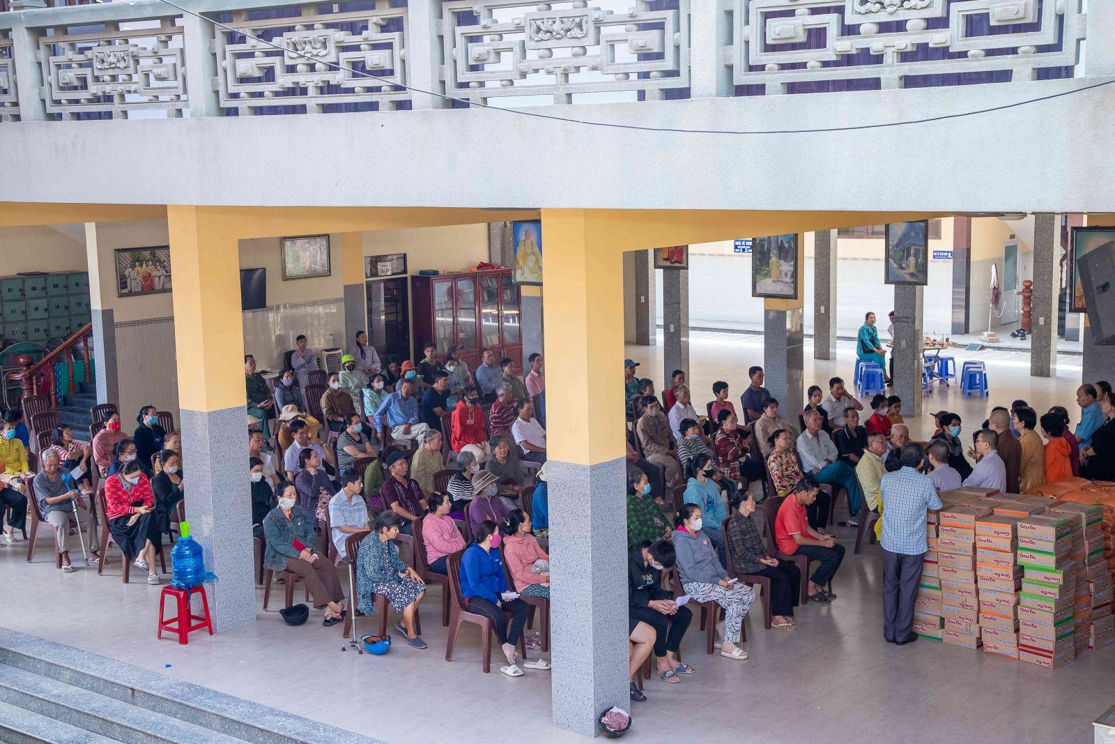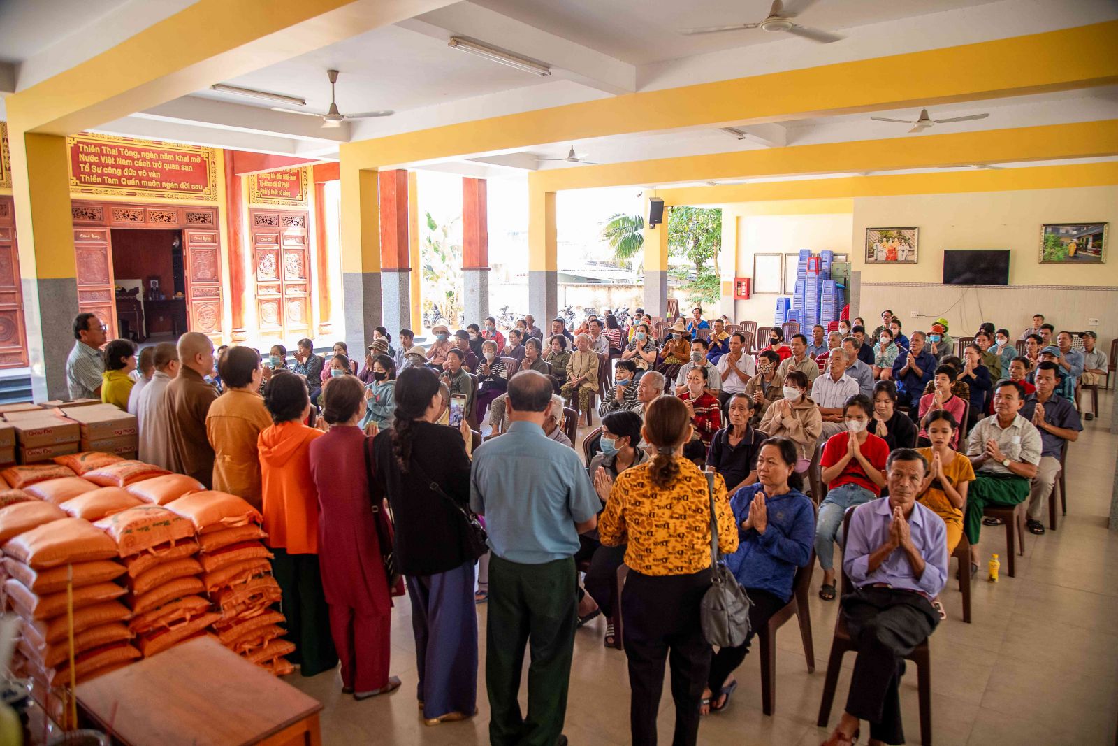 Đại đức trụ trì đã chia sẻ đến với hội chúng nhân duyên buổi trao quà yêu thương ngày hôm nay. Đại đức nhấn mạnh: “Trong cuộc sống này có rất nhiều người giàu có, tiền ròng bạc chảy nhưng không phải ai cũng biết chia sẻ đến những người có hoàn cảnh khó khăn. Sở dĩ tại sao ở chùa quý Thầy Cô thường hay kết nối các vị Mạnh thường quân, người Phật tử hộ đạo để chia sẻ đến những hoàn cảnh khó khăn. Bởi những người tu học theo đạo Phật luôn lấy tinh thần từ bi cứu khổ ban vui làm đầu, luôn cảm thương cho người bất hạnh. Người con Phật dù xuất gia hay tại gia đi nữa khi thấy mình có điều kiện hơn những người khác họ tự nhận thấy mình có chút phước báu hơn người, họ thấy cần san sẻ ái tài của mình, do mình dùng công sức, trí lực bản thân mà đem cho những người thiếu phước báu, kém may mắn hơn người khác đó chính là nghĩa cử cao đẹp của người con Phật. Chính vì vậy quý bà con mỗi khi nhận quà ở đây hay bất cứ nơi đâu thì hãy nghĩ tưởng đến tình thương, sự chia sẻ của những người lao động vất vả để dành tiền bạc san sẻ bớt cho chúng ta, đó chính là tinh thần ăn quả nhớ kẻ trồng cây, tinh thần tri ân cao đẹp của con người. Hôm nay đây cũng vậy vì cảm thương cho những nạn nhân nhiễm chất độc da cam/đioxin nên các Phật tử đã về đây để chia sẻ đến quý vị, không phân biệt bất cứ tôn giáo nào và chỉ một mục đích duy nhất đó là lan tỏa tình thương trong hạnh bố thí của Phật dạy góp phần giúp đời sống xã hội ngày càng tốt đẹp hơn, hạnh phúc hơn”.