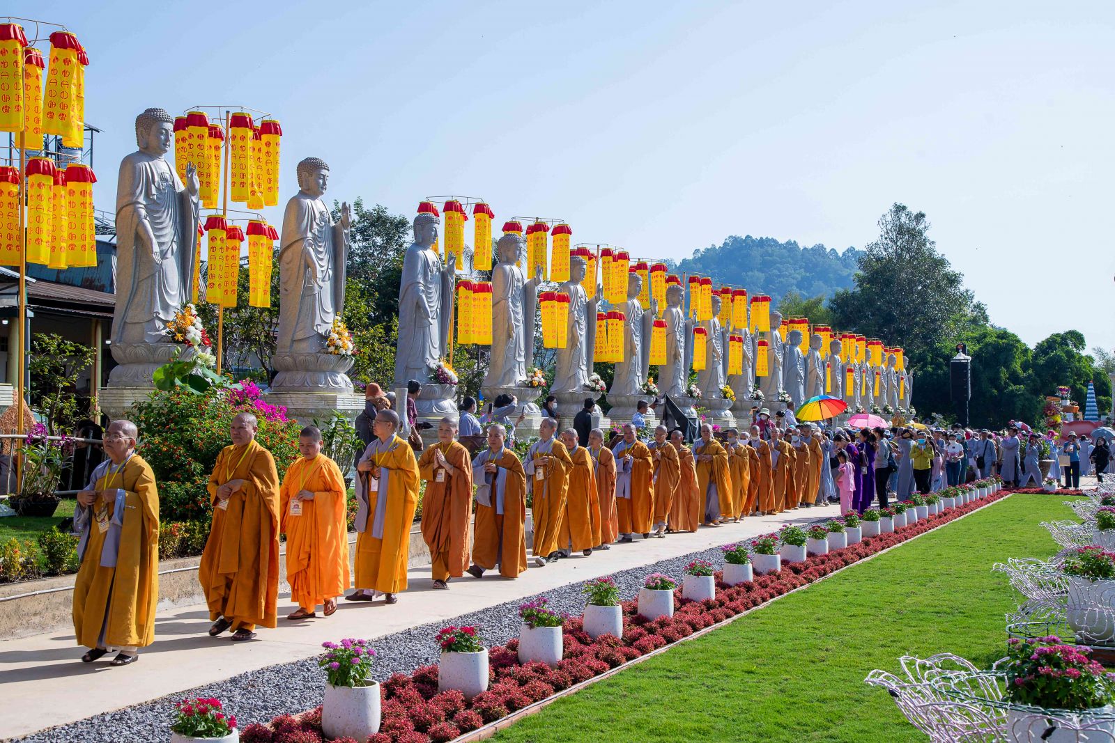 Buổi sáng diễn ra lễ Hoàn nguyện, sái tịnh an vị 49 tôn tượng Đức Phật A-di-đà với sự quang lâm chứng minh của HT. Thích Lệ Linh - Thành viên HĐCM, Chứng minh BTS GHPGVN tỉnh Bến Tre; HT. Thích Lệ Đức - Thành viên HĐCM, Chứng minh BTS tỉnh Bến Tre; HT. Thích Nhật Tấn - UV Thường Trực HĐTS, Trưởng BTS GHPGVN tỉnh Bến Tre; TT. Thích Huệ Khai - UV Thường Trực HĐTS, Phó Ban Thường Trực Ban Pháp chế Trung ương, Trưởng BTS GHPGVN tỉnh; HT. Thích Chơn Không - Phó Trưởng ban kiêm Trưởng Phân ban Cư sĩ Phật tử Trung ương, Trưởng Ban HD-PT TP. HCM; HT. Thích Hiển Đức - UV HĐTS, Phó Ban kiêm Chánh Thư ký Ban Pháp chế Trung ương, Trưởng Ban Pháp chế GHPGVN TP. Hồ Chí Minh; HT. Thích Thiện Thái - Chứng minh BTS GHPGVN Q. Bình Tân, TP. Hồ Chí Minh; HT. Thích Giác Quang, HT. Thích Thiện Hoằng, HT. Thích Như Thanh, HT. Thích Huệ Nhẫn, HT. Thích Thiện Đồng đồng chứng minh BTS GHPGVN huyện Xuân Lộc; ĐĐ. Thích Chơn Nghĩa - Trưởng Ban TT-XH GHPGVN tỉnh Đồng Nai; NS. Thích nữ Huệ Ngọc - Đặc Trách Ni giới GHPGVN huyện cùng chư Tôn đức Tăng Ni trụ trì các tự viện trong huyện, chư Tôn đức Tăng Ni trụ trì từ TP. HCM, tỉnh Bến Tre, tỉnh Long An là pháp lữ với Đại đức trụ trì và gần 3000 Phật tử đồng tham dự.