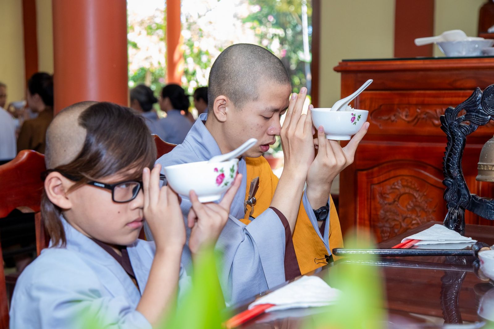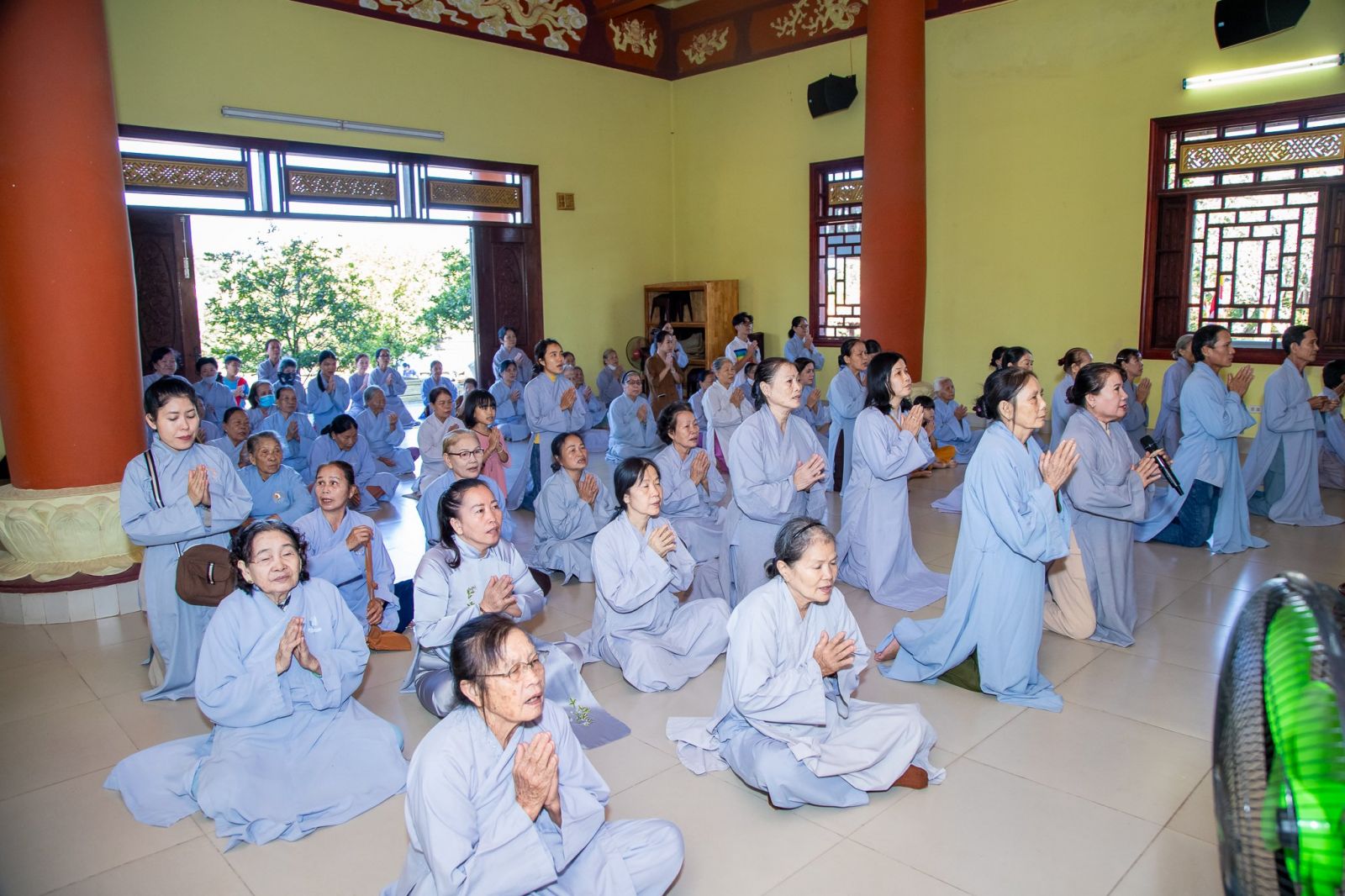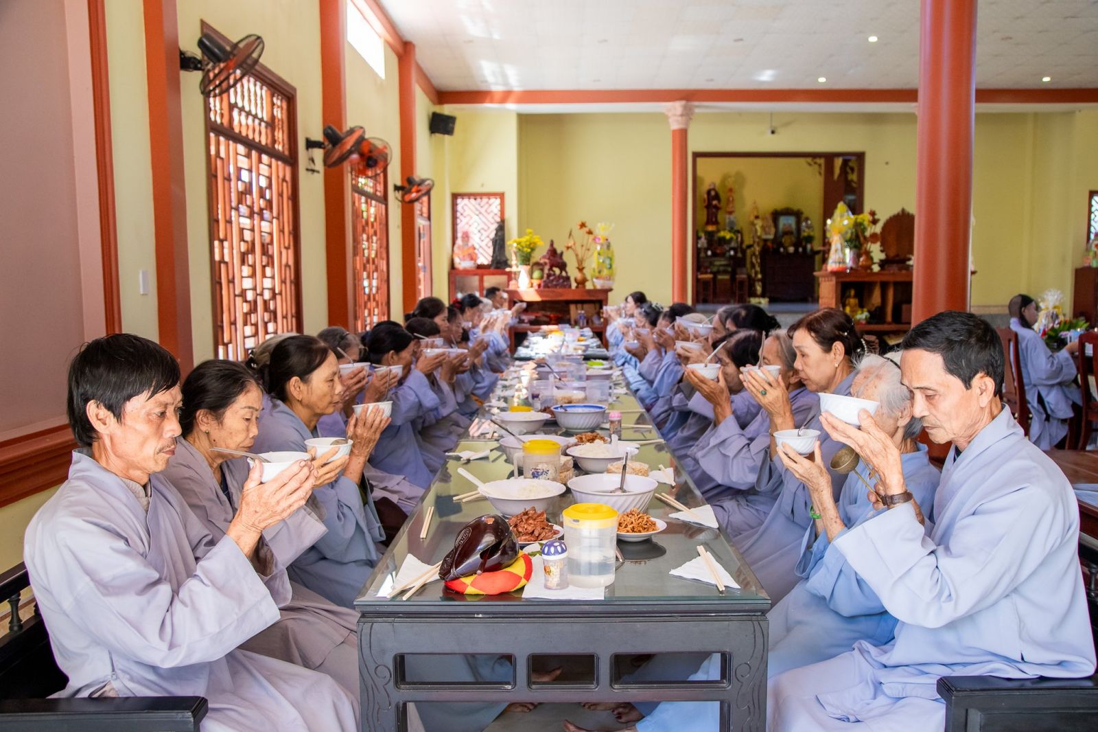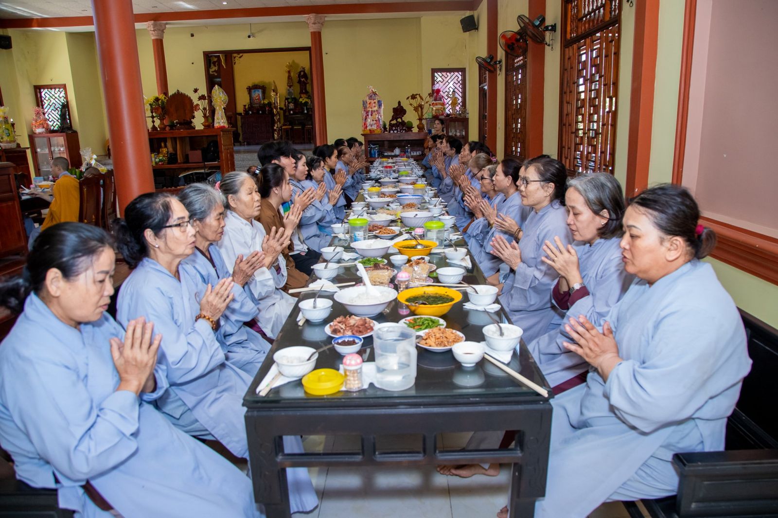 Sau thời pháp thoại, đạo tràng Phật tử đồng kinh hành niệm Phật về tại Trai đường, cử hành nghi thức quá đường và thọ trai trong sự trang nghiêm thanh tịnh.