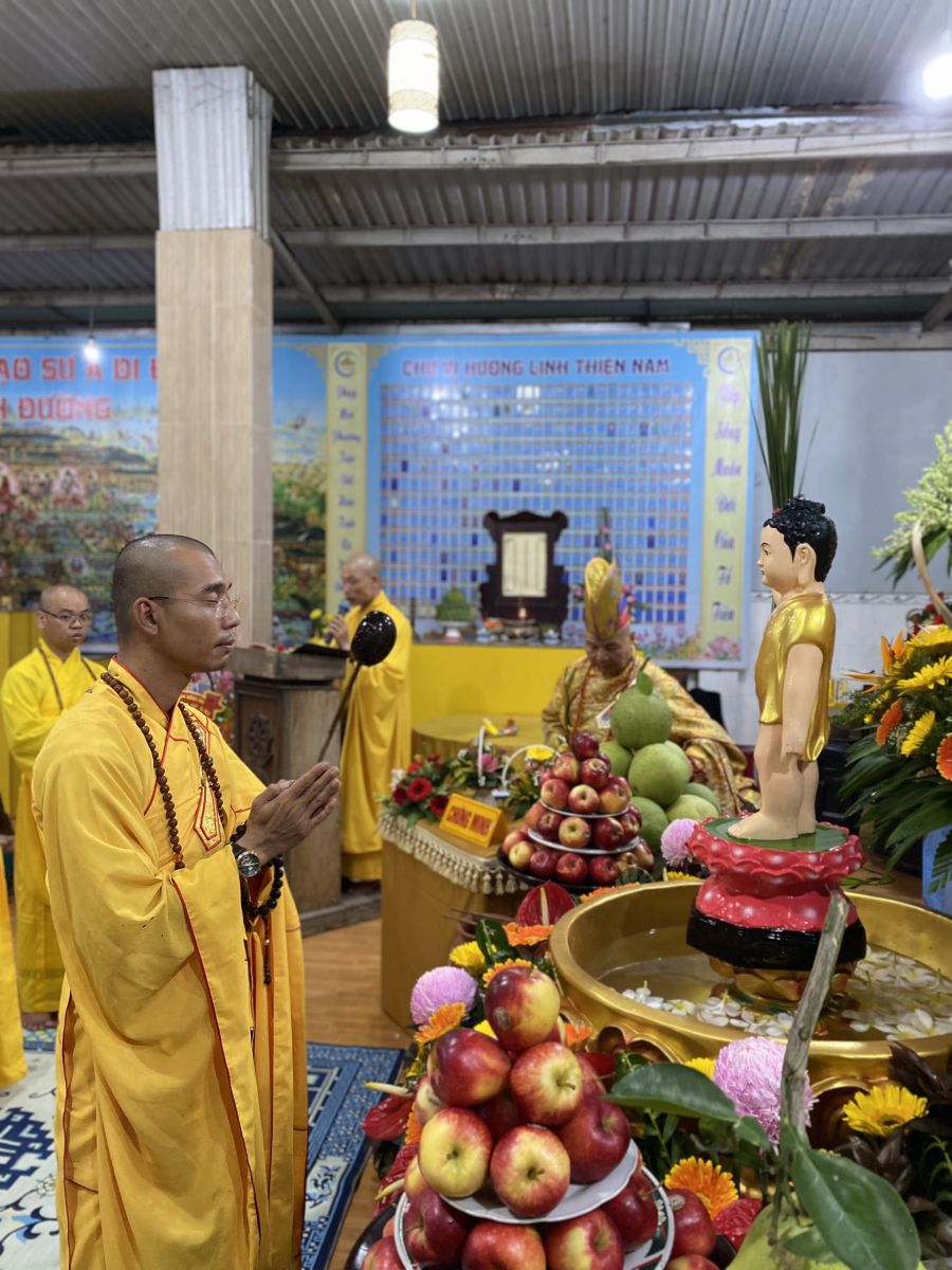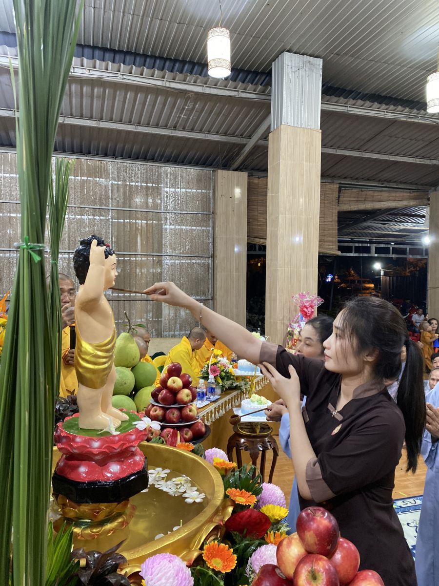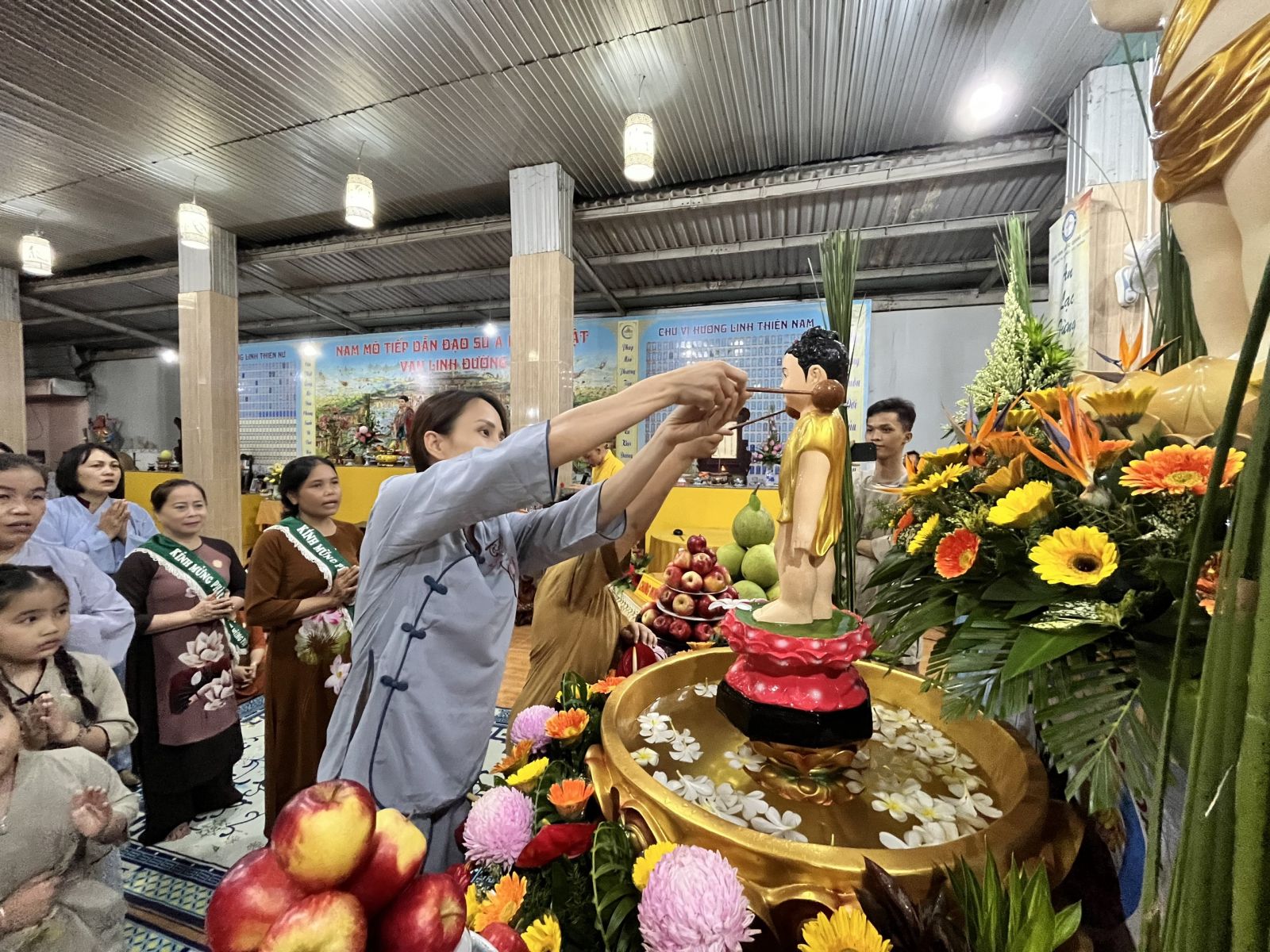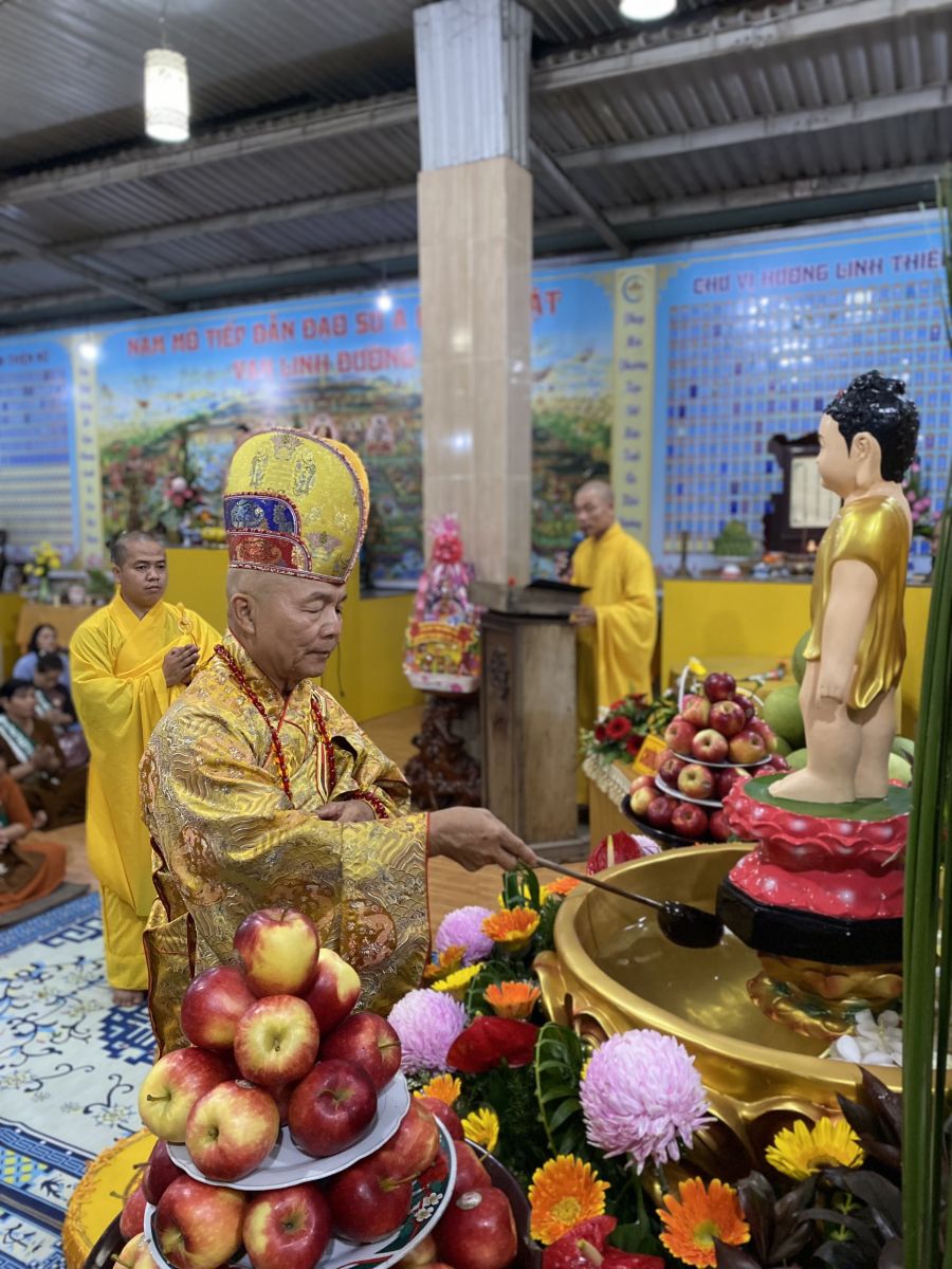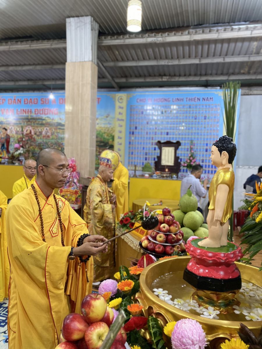 Buổi lễ Khánh đản hôm nay tại Chùa Vạn Phước Quảng Long được tổ chức trong sự trang nghiêm và thắm tình đạo vị với nghi thức: đảnh lễ và chiêm ngưỡng tôn dung đản sanh của đấng từ phụ, tiếp đó là nghi thức lễ tắm phật như khơi lại một hình ảnh “Chín Rồng phun nước, Bảy bước xưng Tôn”.