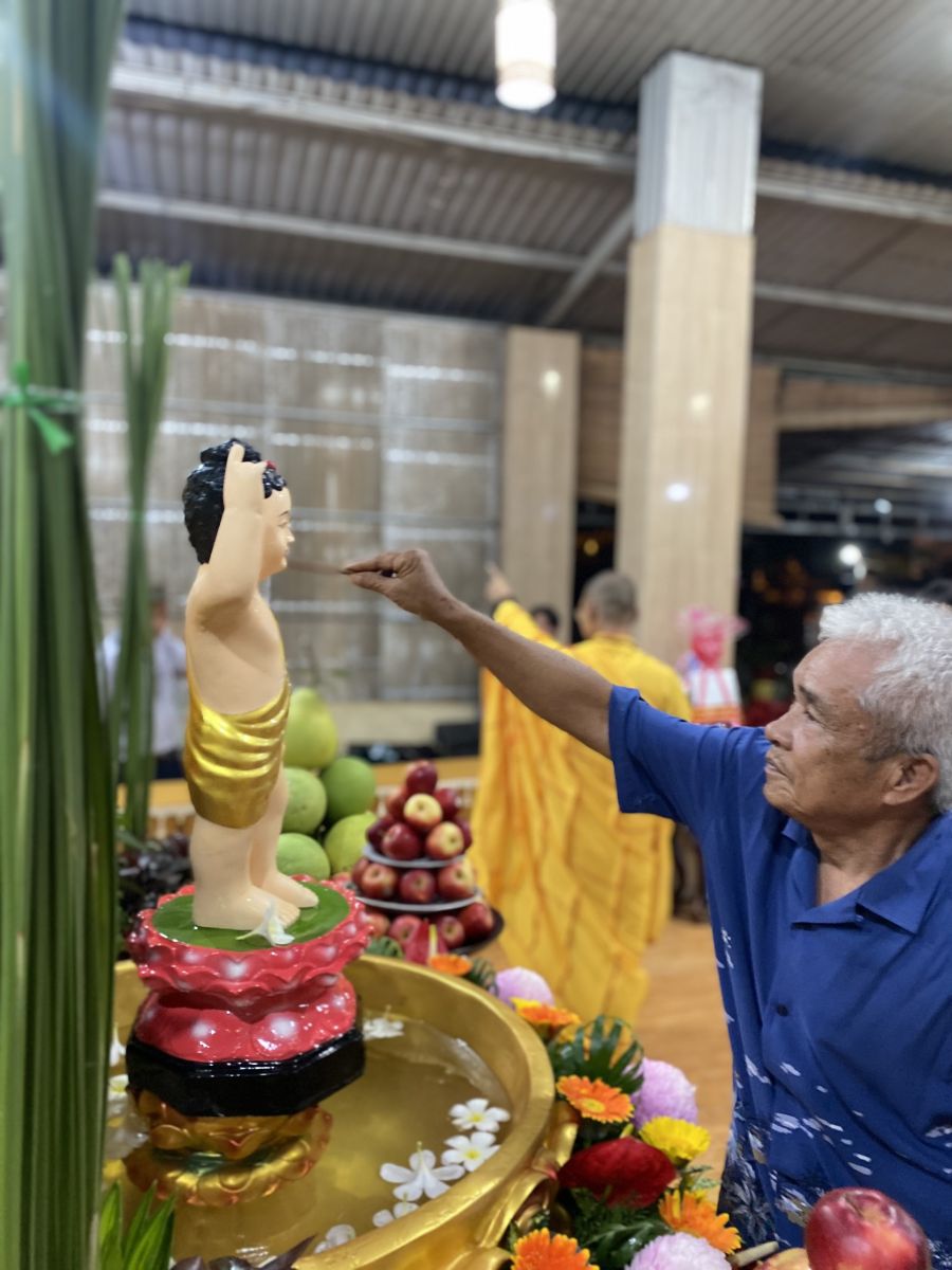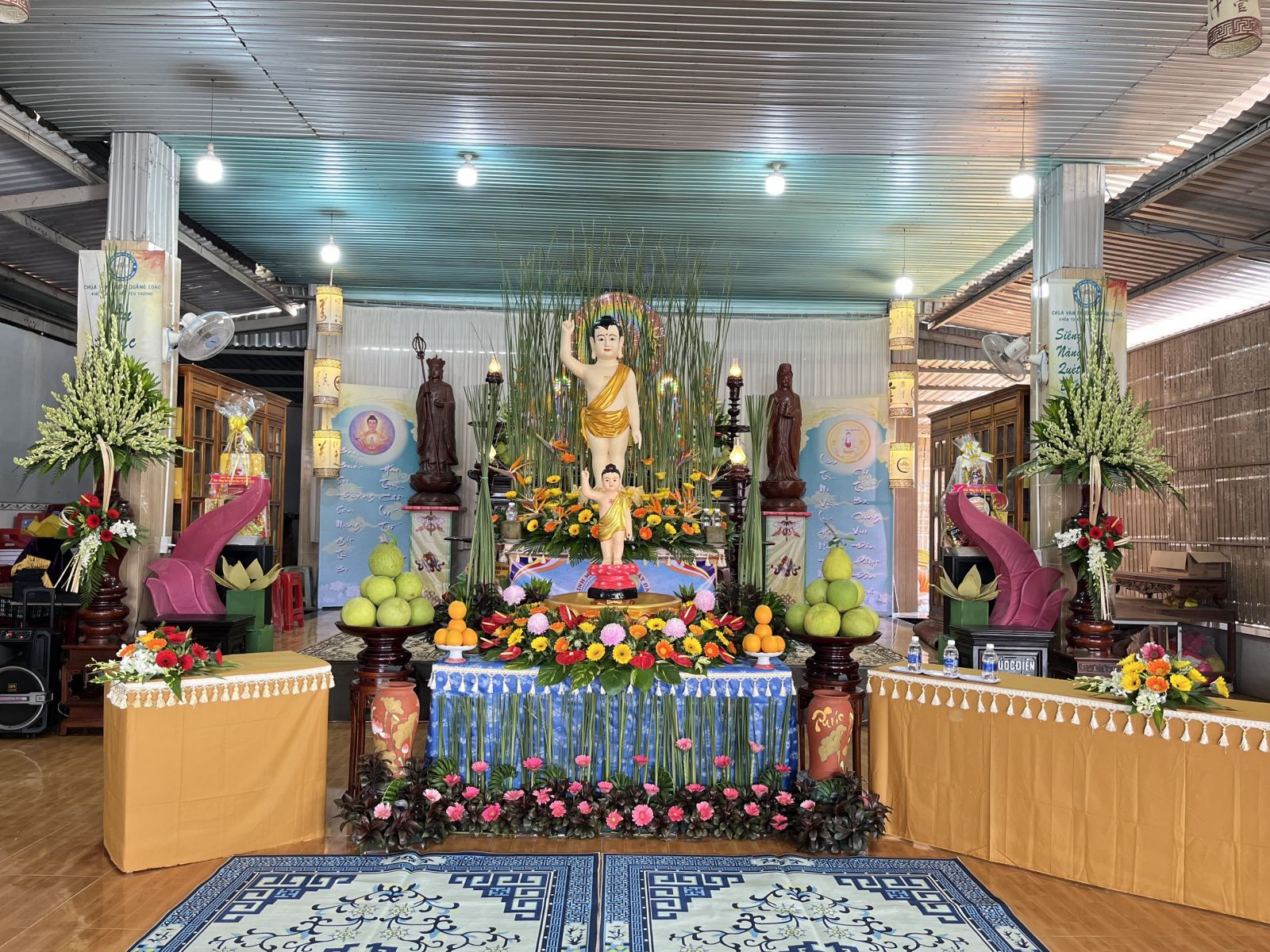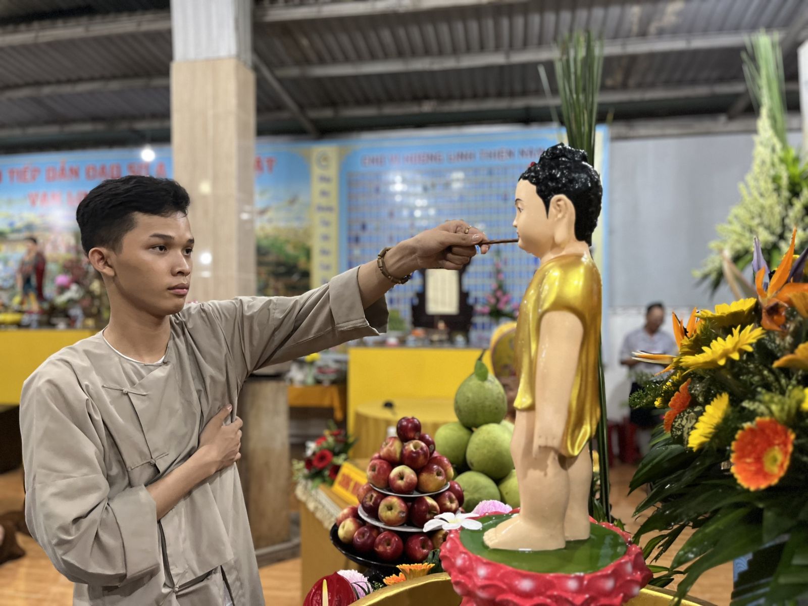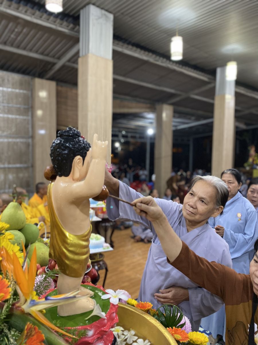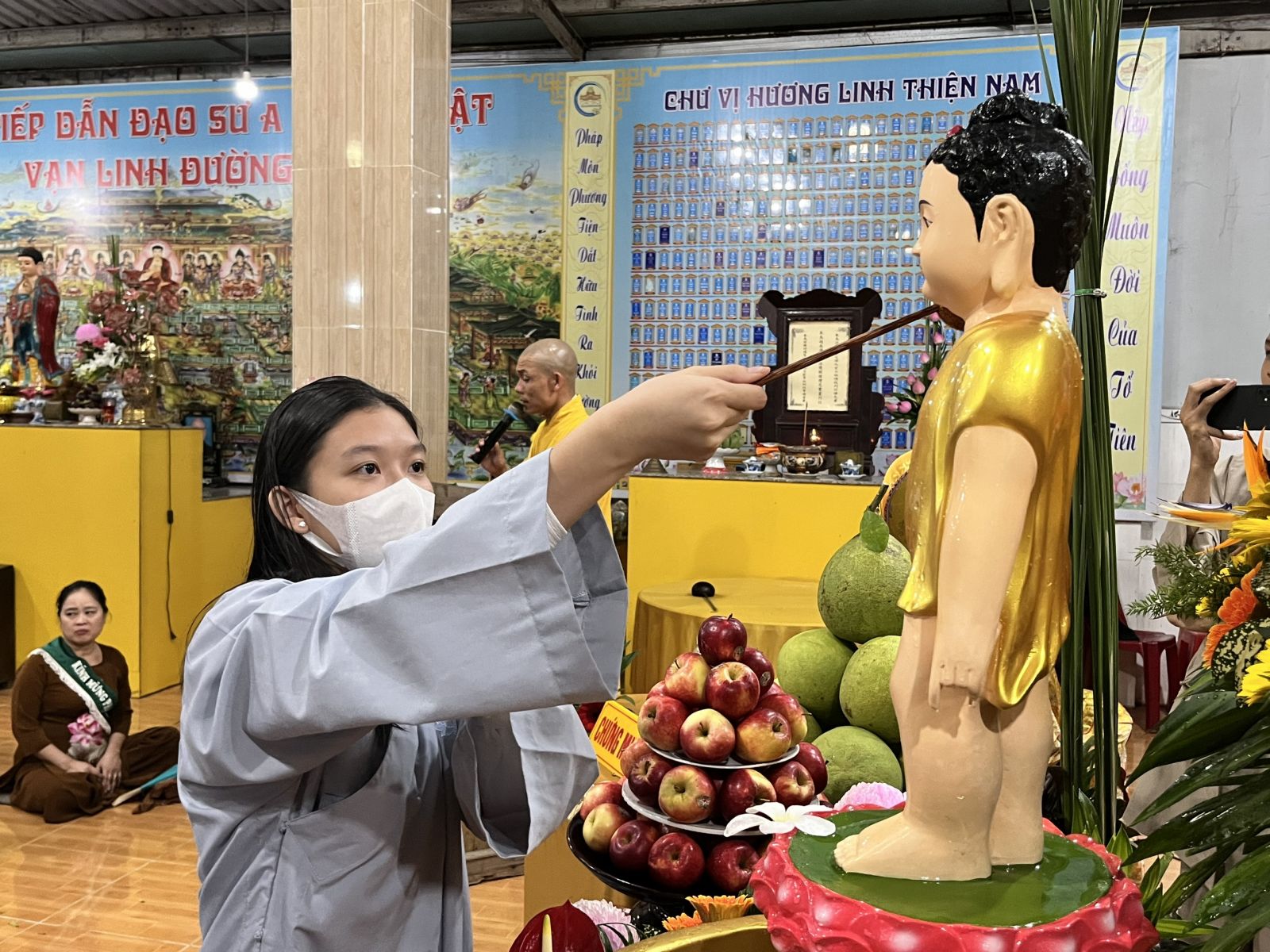 Buổi lễ Khánh đản hôm nay tại Chùa Vạn Phước Quảng Long được tổ chức trong sự trang nghiêm và thắm tình đạo vị với nghi thức: đảnh lễ và chiêm ngưỡng tôn dung đản sanh của đấng từ phụ, tiếp đó là nghi thức lễ tắm phật như khơi lại một hình ảnh “Chín Rồng phun nước, Bảy bước xưng Tôn”.