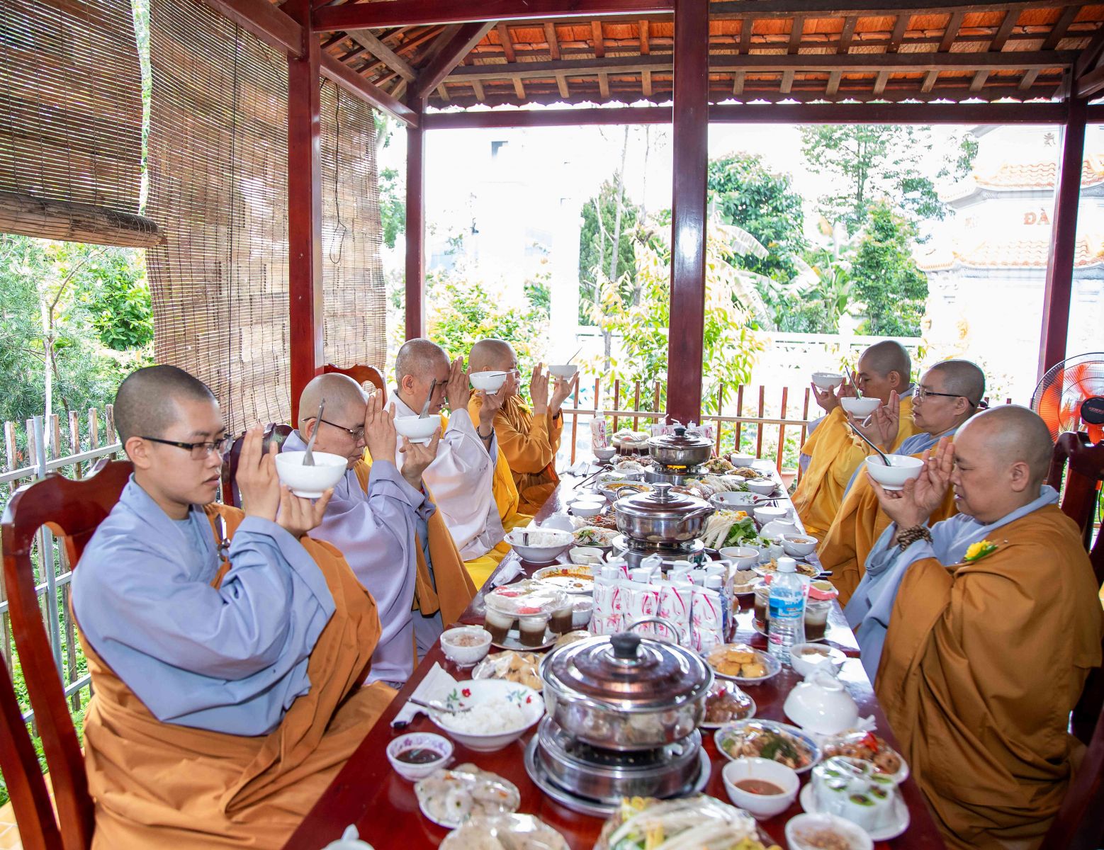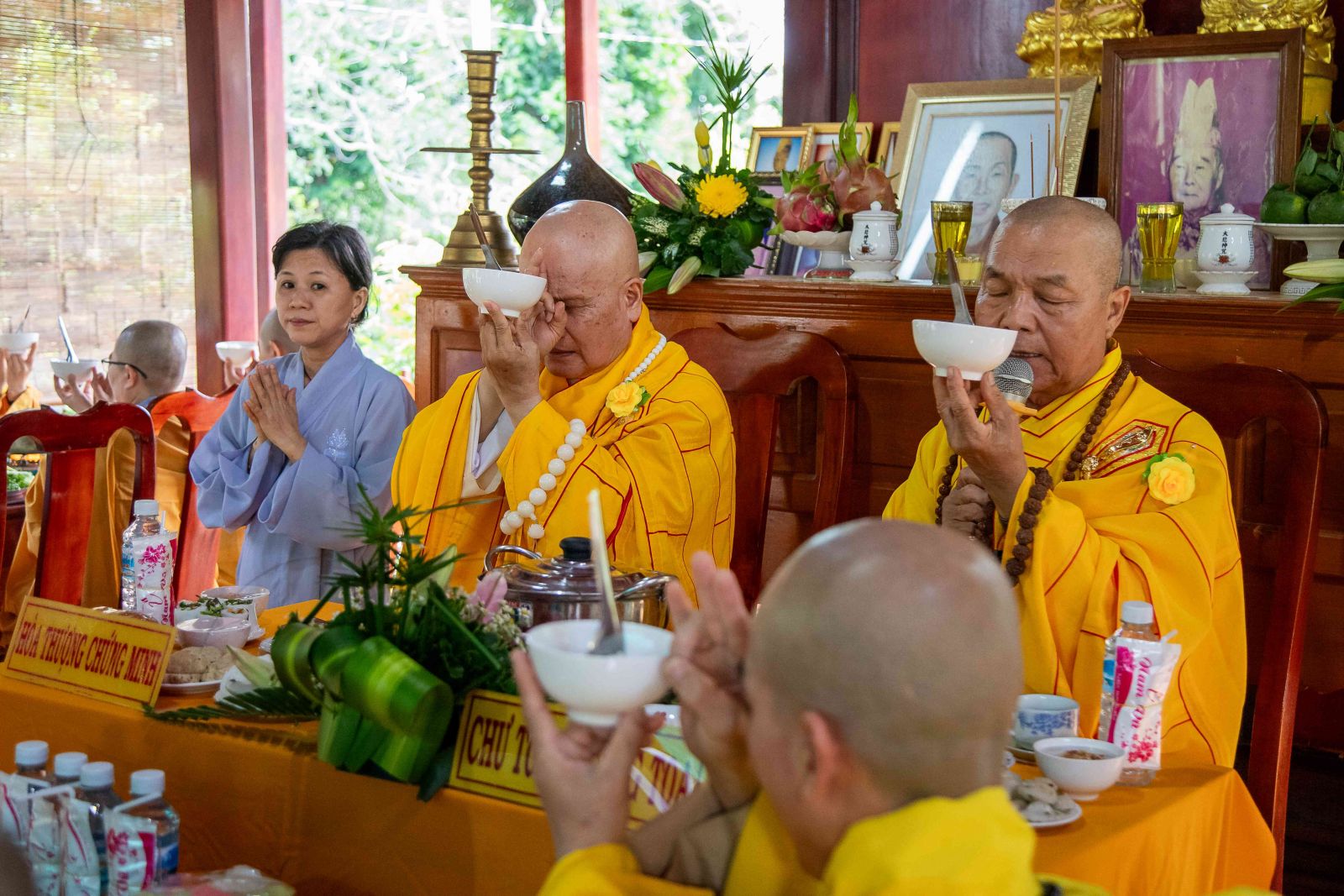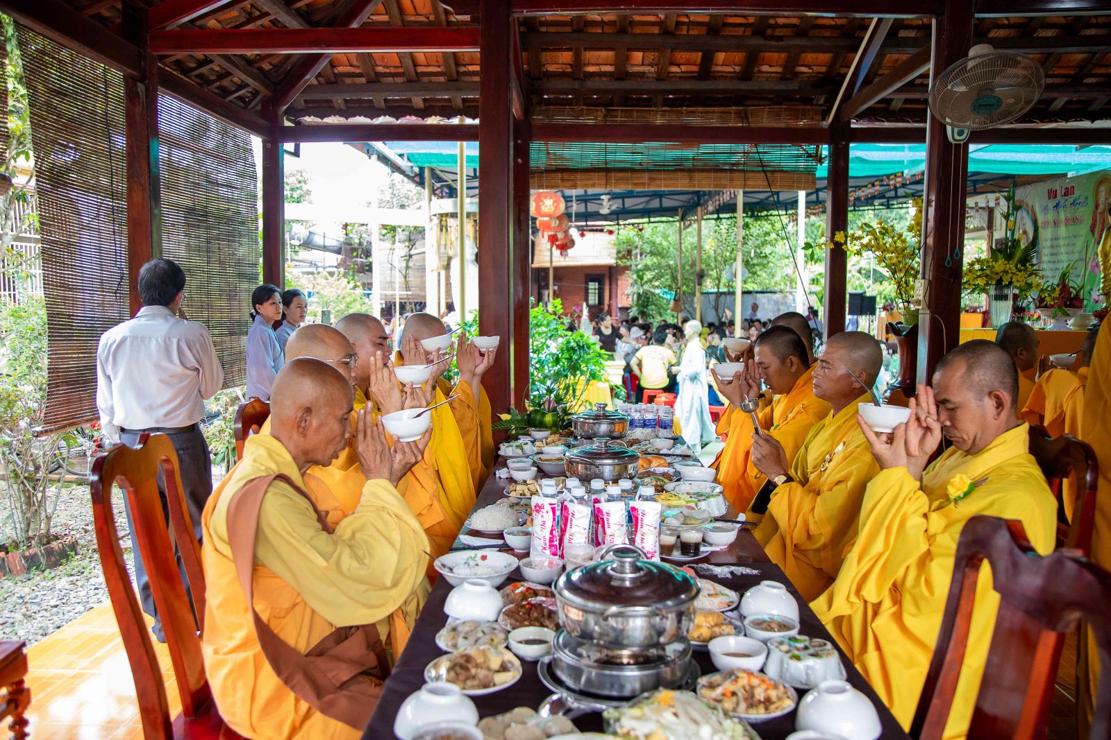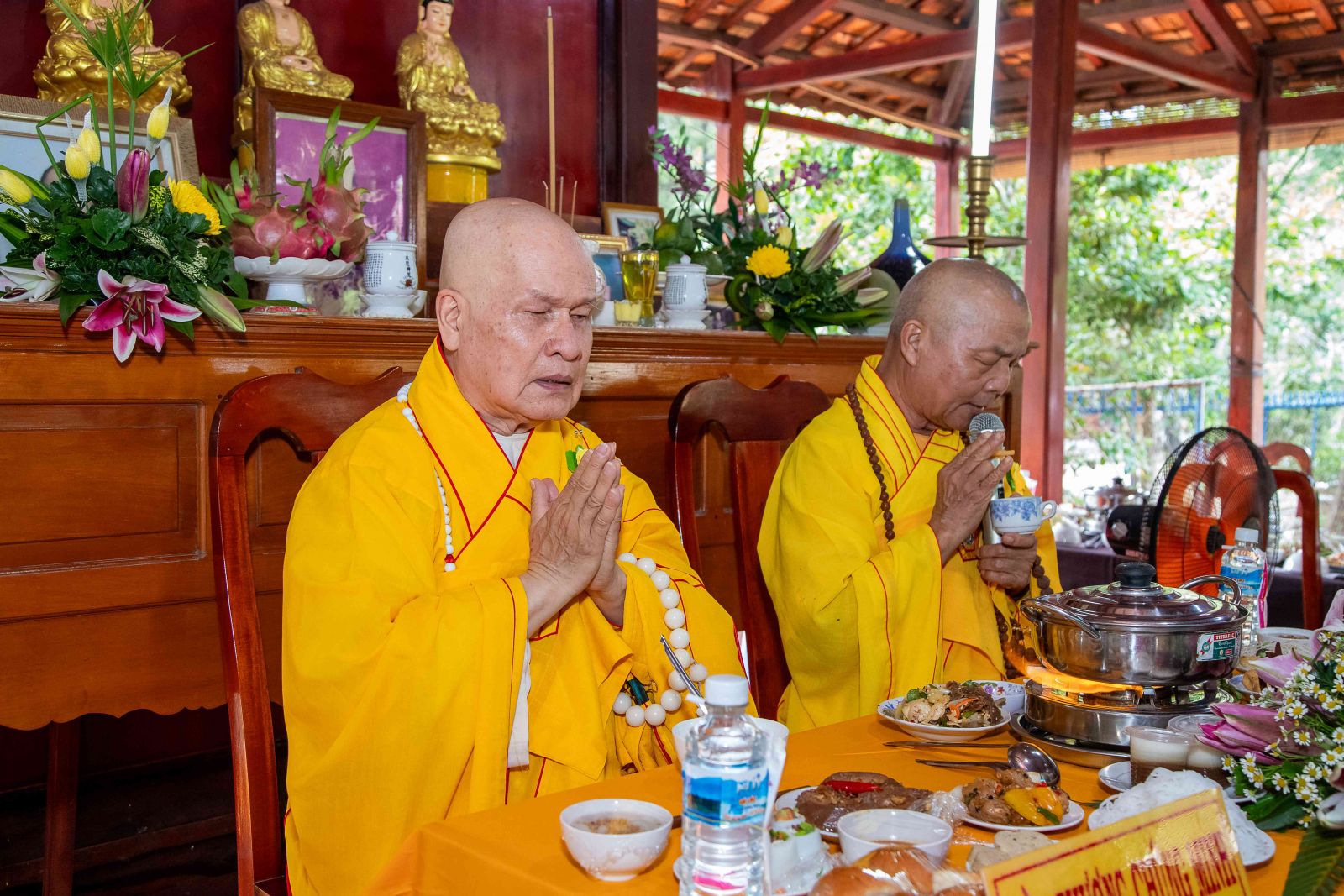 Sau đó Hòa thượng cùng quý Phật tử chùa Vân Quang thành tâm thiết lễ cúng dường trai Tăng kính mừng khánh tuế chư Tôn thiền đức Tăng Ni vừa tăng quang hạ lạp.