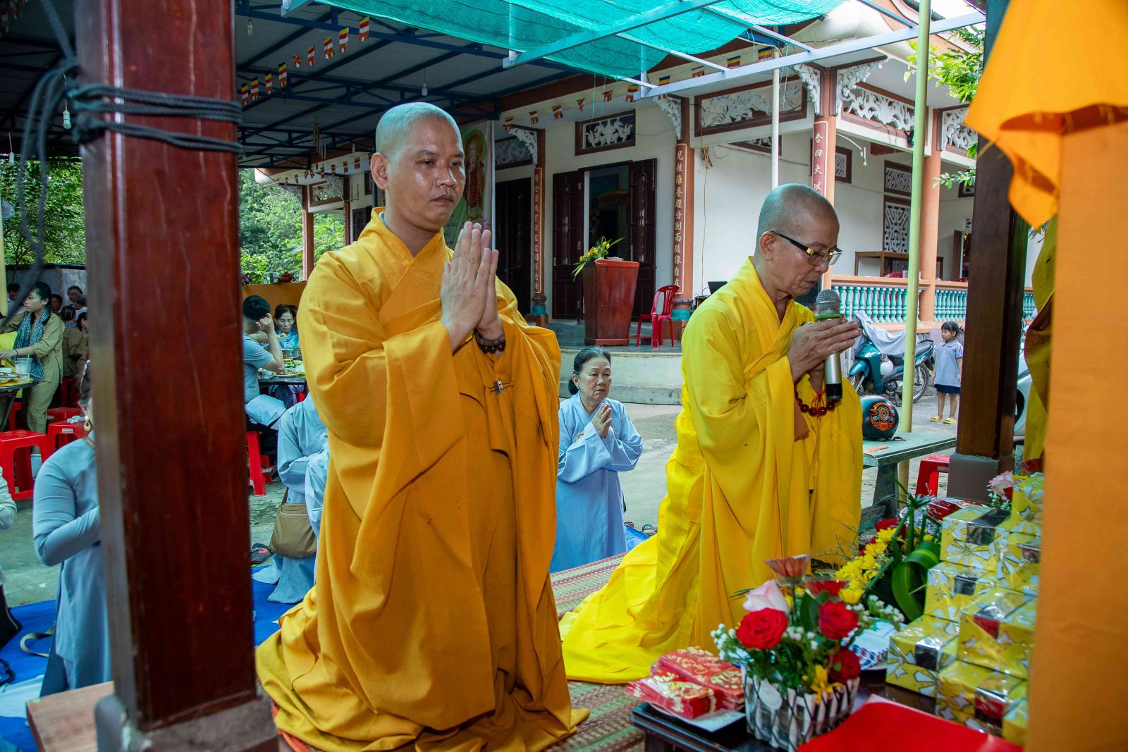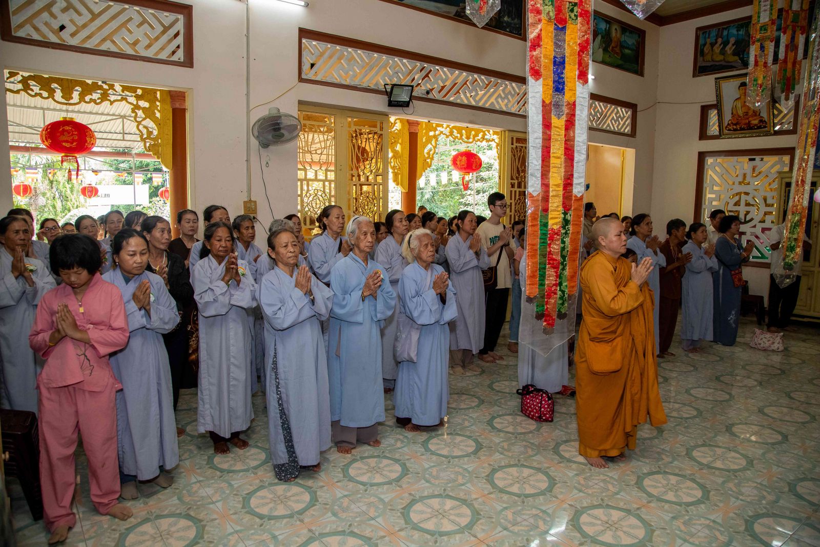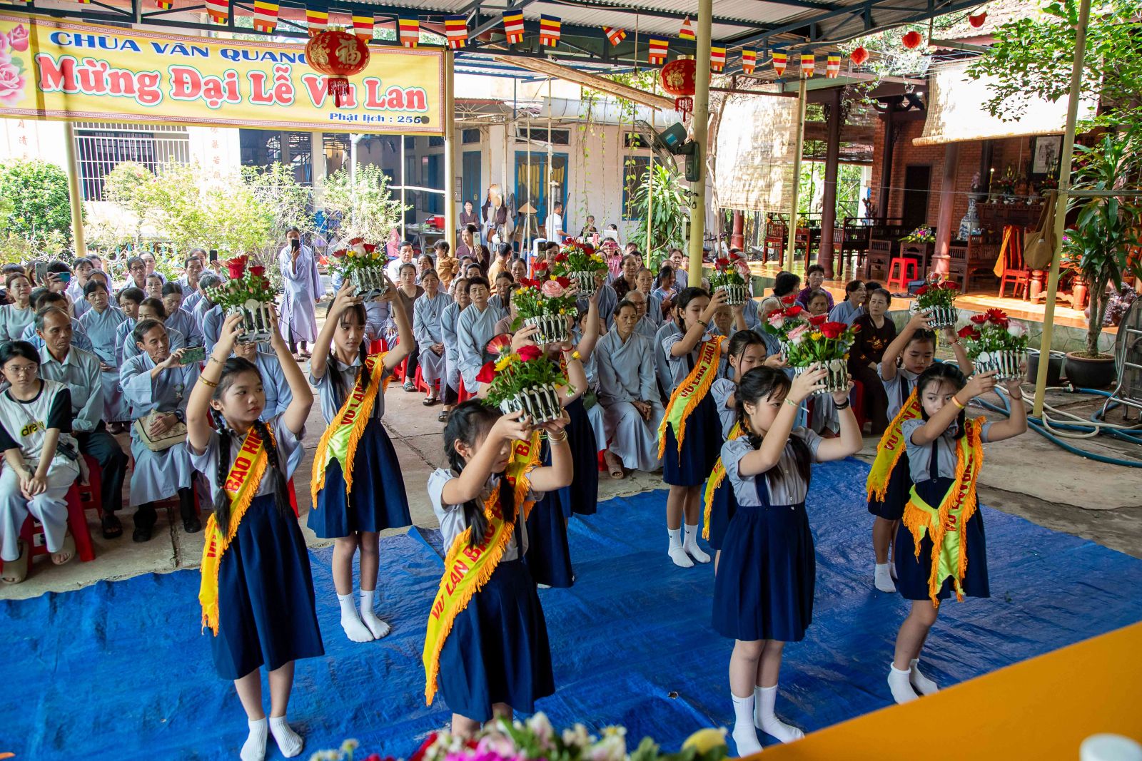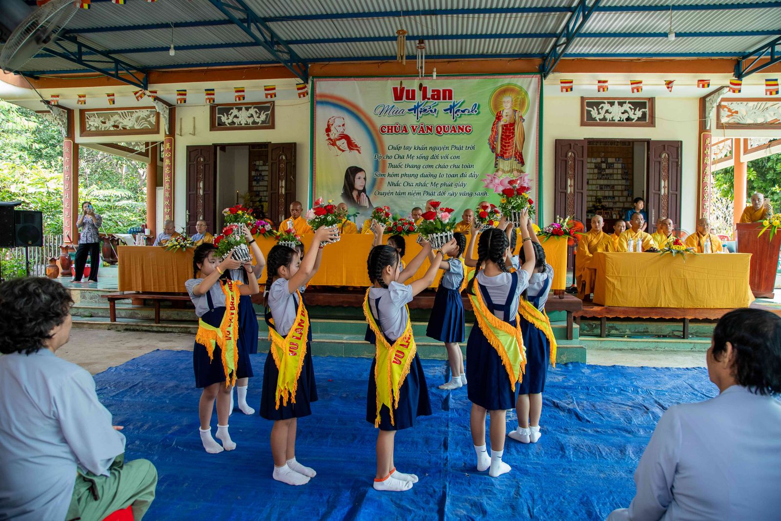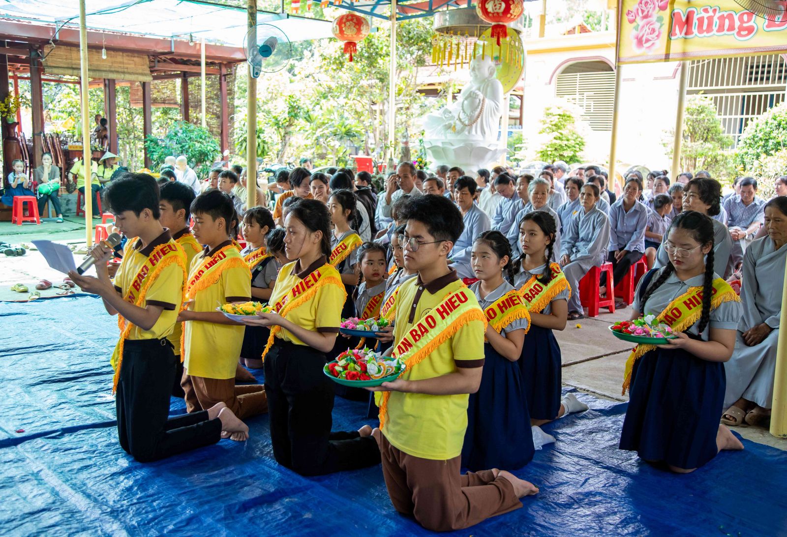 Sau khi kết thúc lễ Bông hồng cài áo, Hòa thượng trụ trì đã thành tâm cung thỉnh chư Tôn tịnh đức Tăng Ni quang lâm chánh điện tác lễ Cúng ngọ Phật, Cúng tiến chư hương linh và phát nguyện phóng sanh nhân mùa Vu lan Báo hiếu nguyện cầu thế giới hòa bình, chúng sanh an lạc.