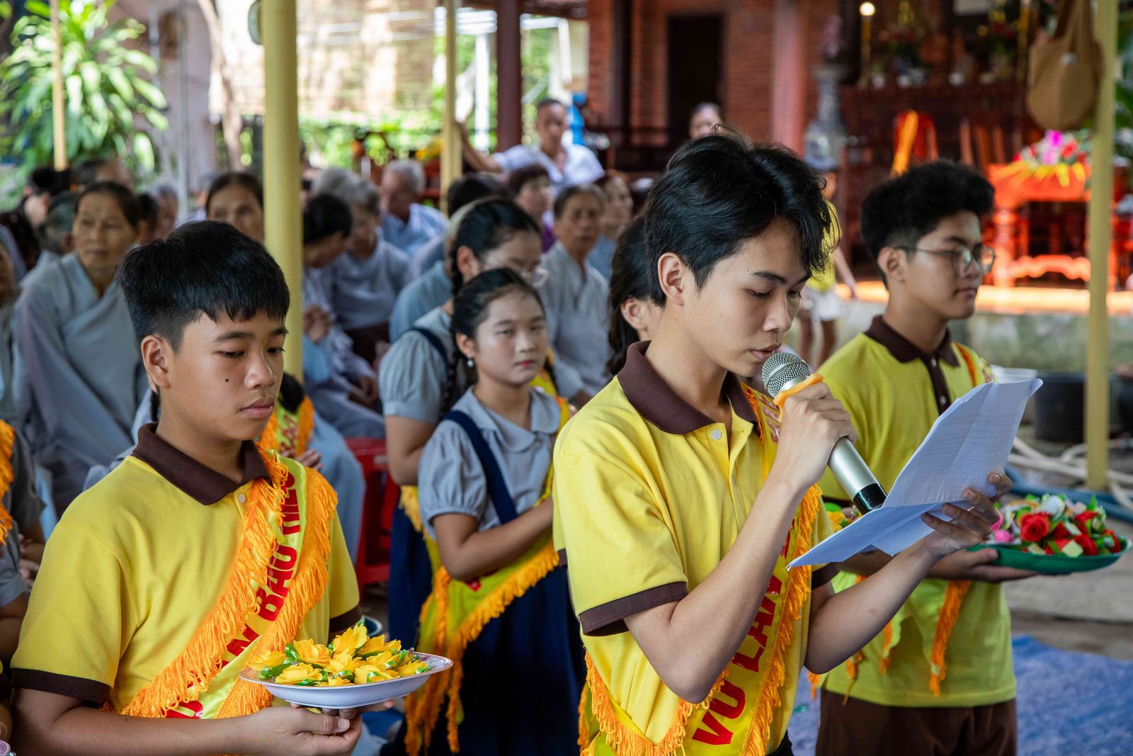 Trong nghi thức Bông hồng cài áo, Phật tử Thiện Xuân đã dâng lời cảm niệm ân đức cha mẹ và ý nghĩa cài hoa hồng đầy xúc động đến với toàn thể đạo tràng.