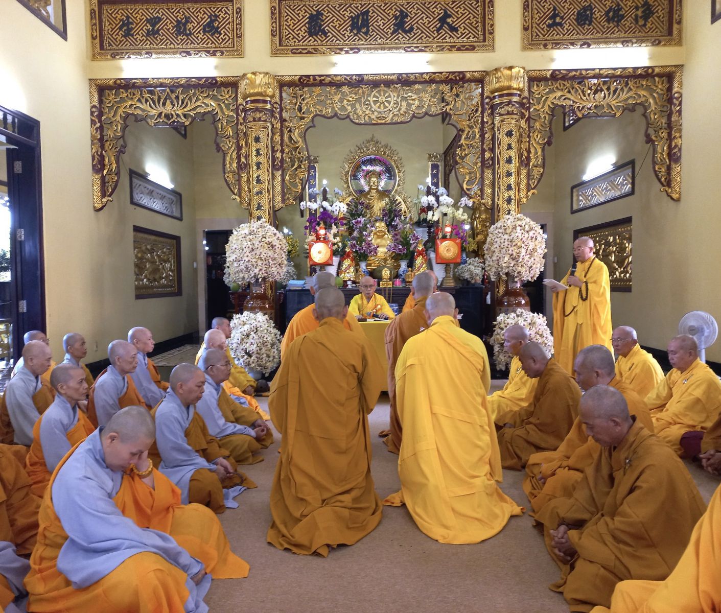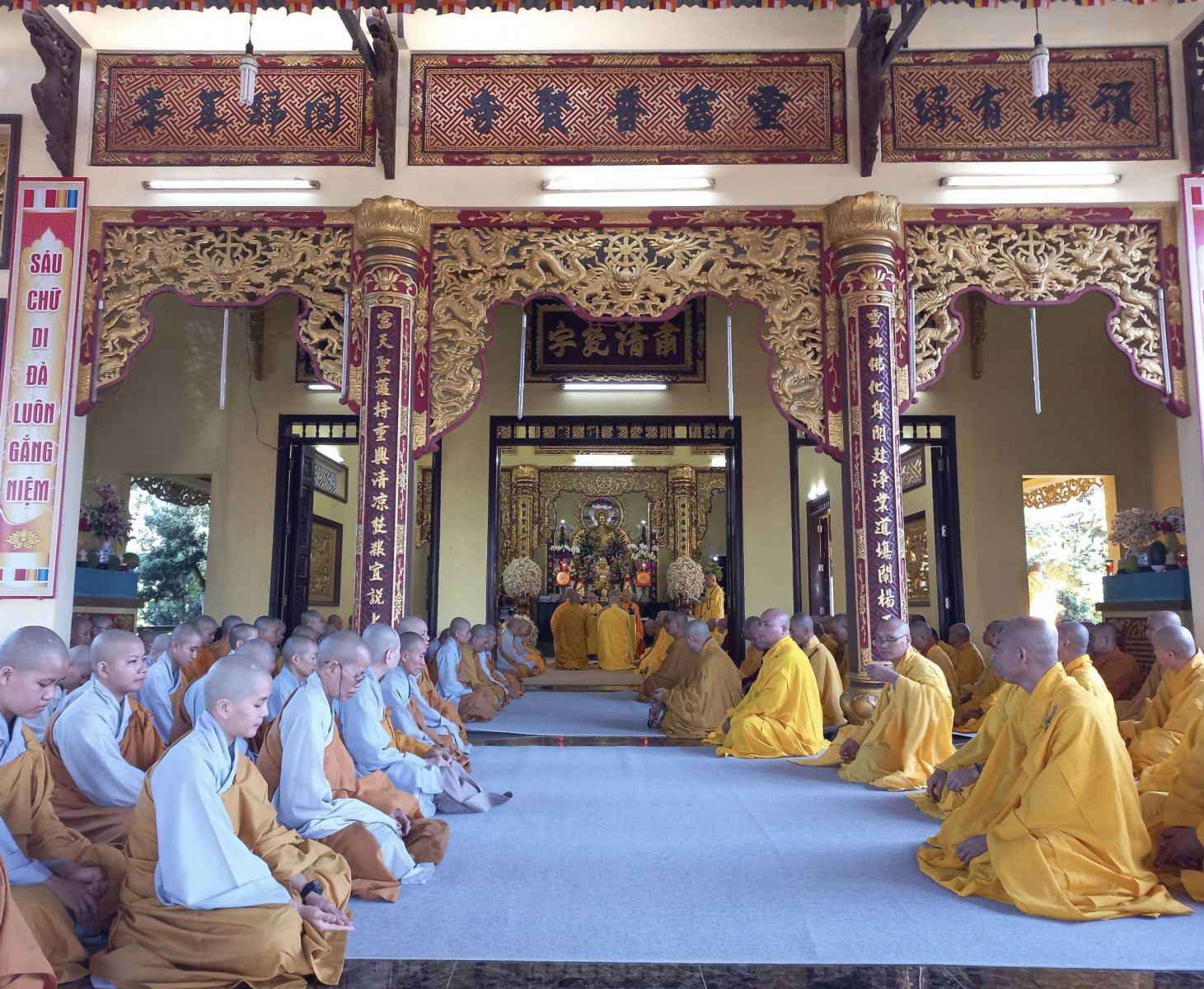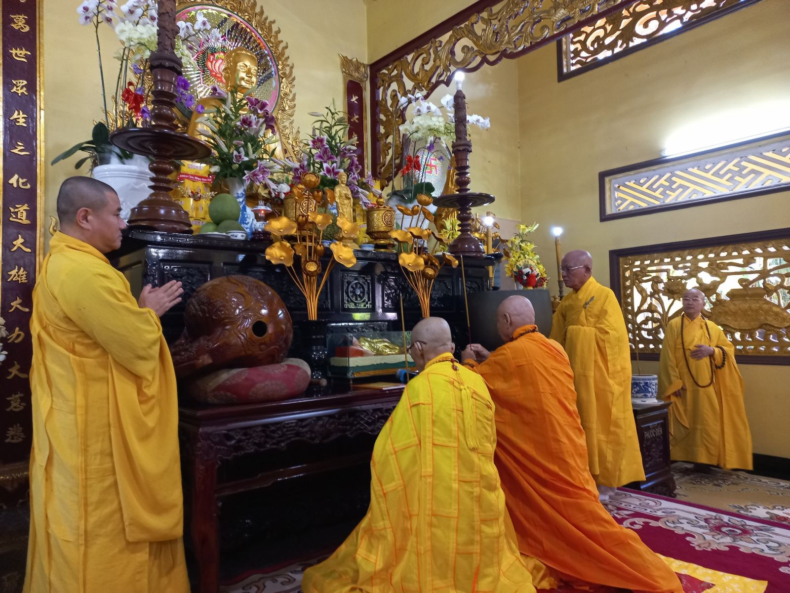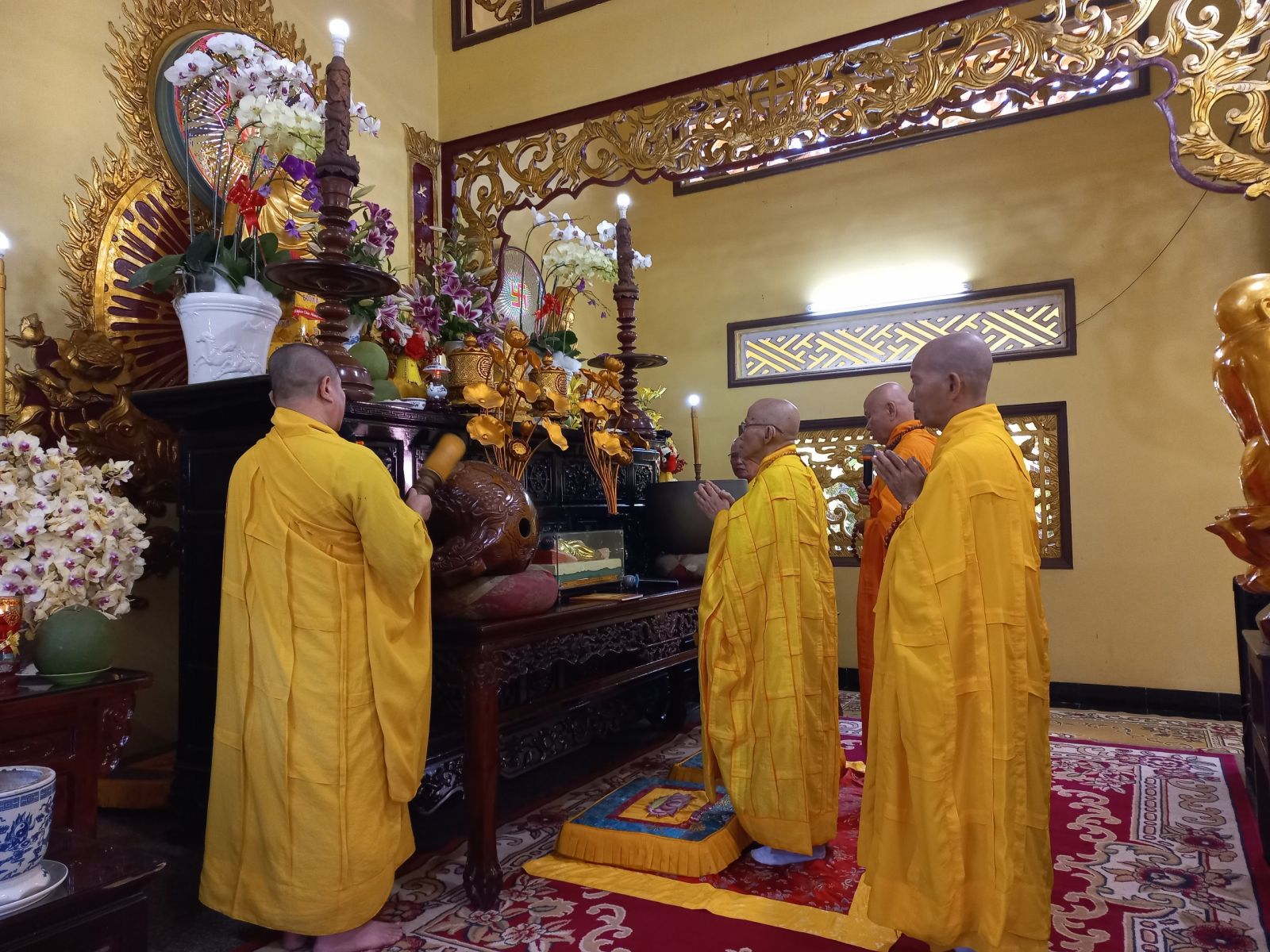 Chư Tôn đức giáo phẩm Ban chứng minh, chư tôn đức Ban Trị sự, chư Tôn đức hành giả An cư cùng đại chúng đã đảnh lễ lịch đại Tổ Sư tại Tổ đường, sau đó tuần tự trang nghiêm quang lâm tại chánh điện thực hiện nghi thức Bố-tát.