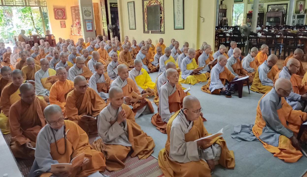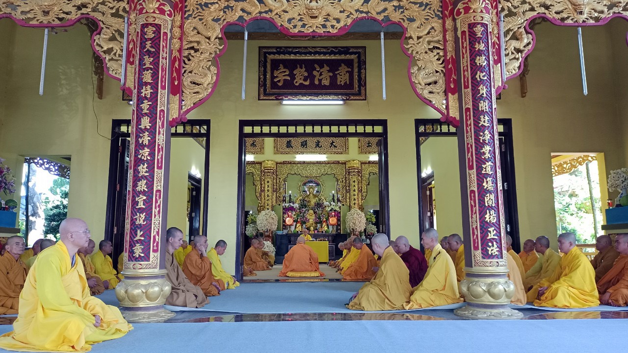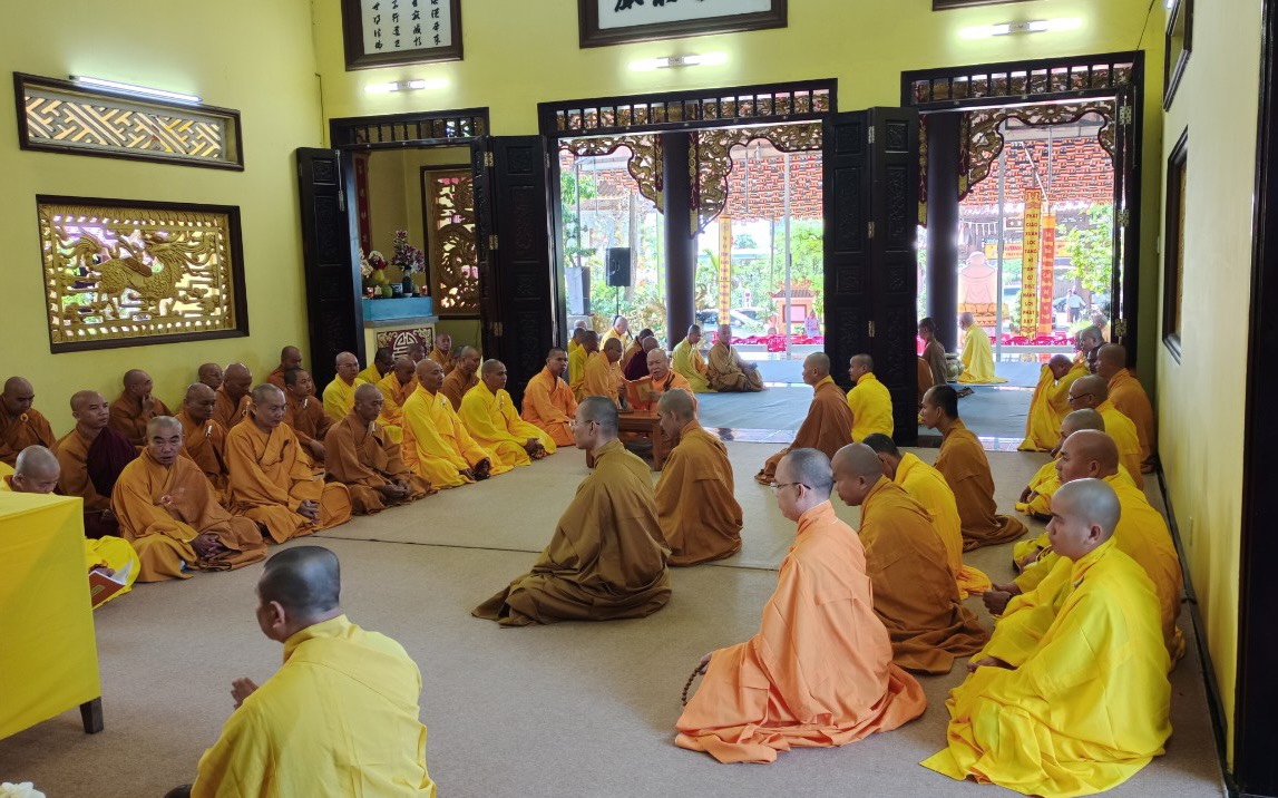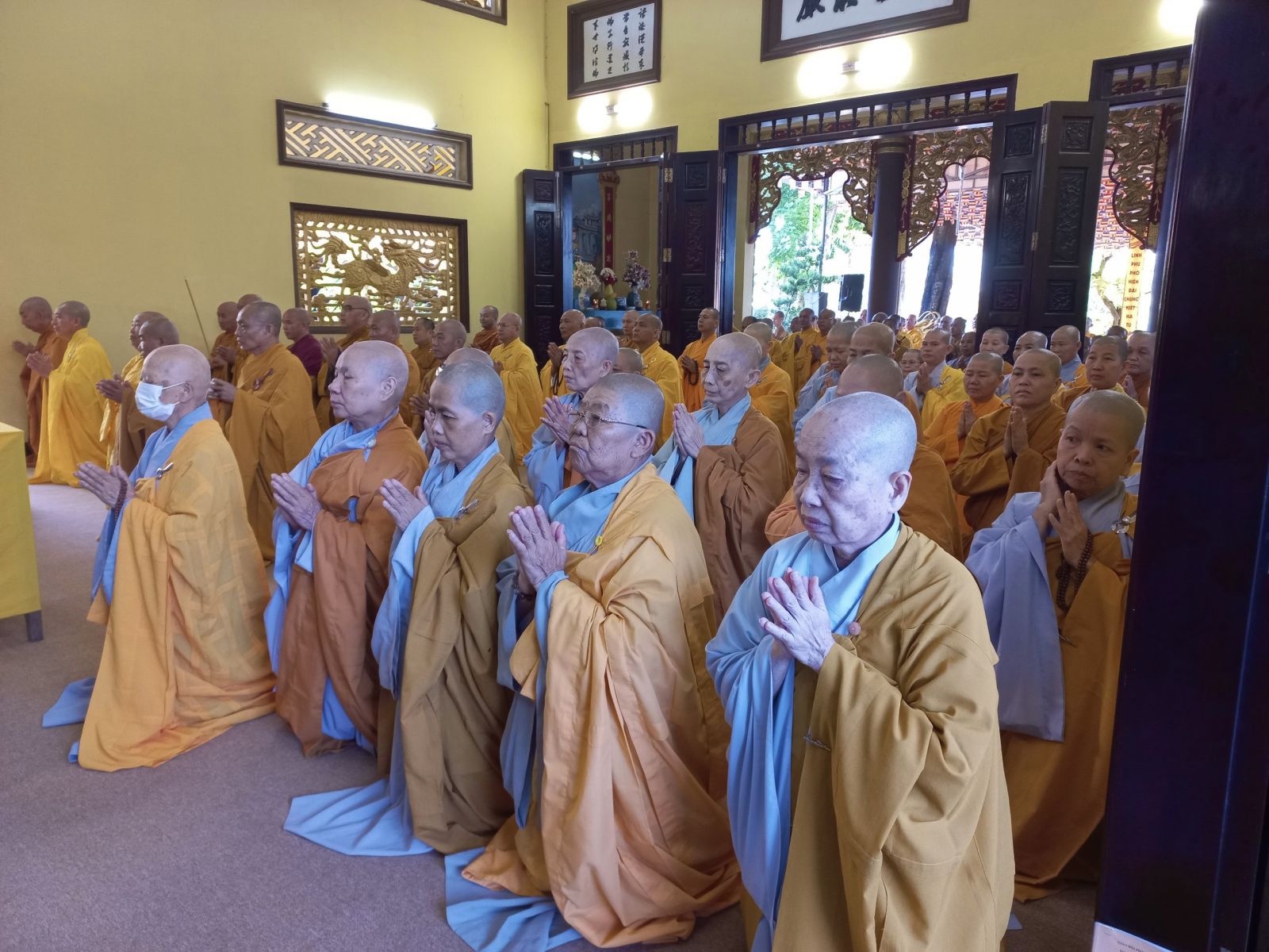 Chư Tôn đức giáo phẩm Ban chứng minh, chư tôn đức Ban Trị sự, chư Tôn đức hành giả An cư cùng đại chúng đã đảnh lễ lịch đại Tổ Sư tại Tổ đường, sau đó tuần tự trang nghiêm quang lâm tại chánh điện thực hiện nghi thức Bố-tát.