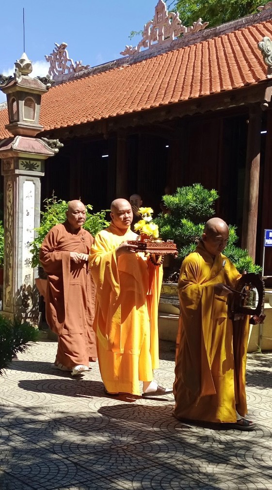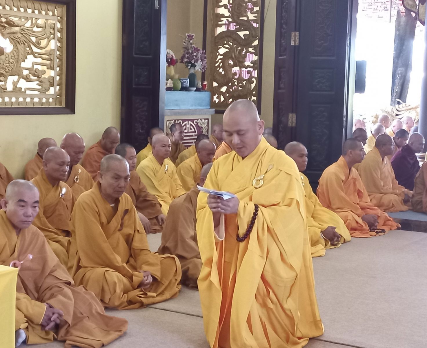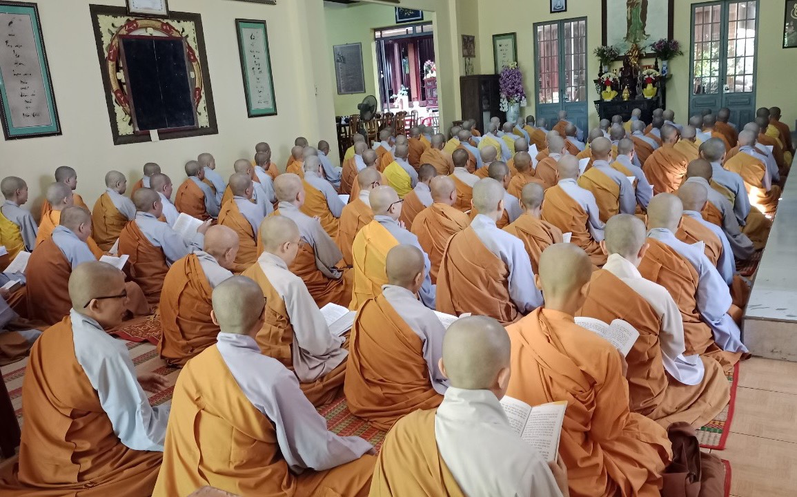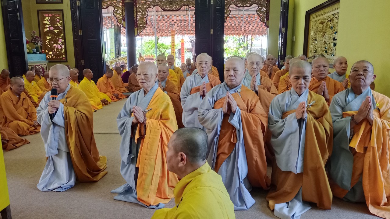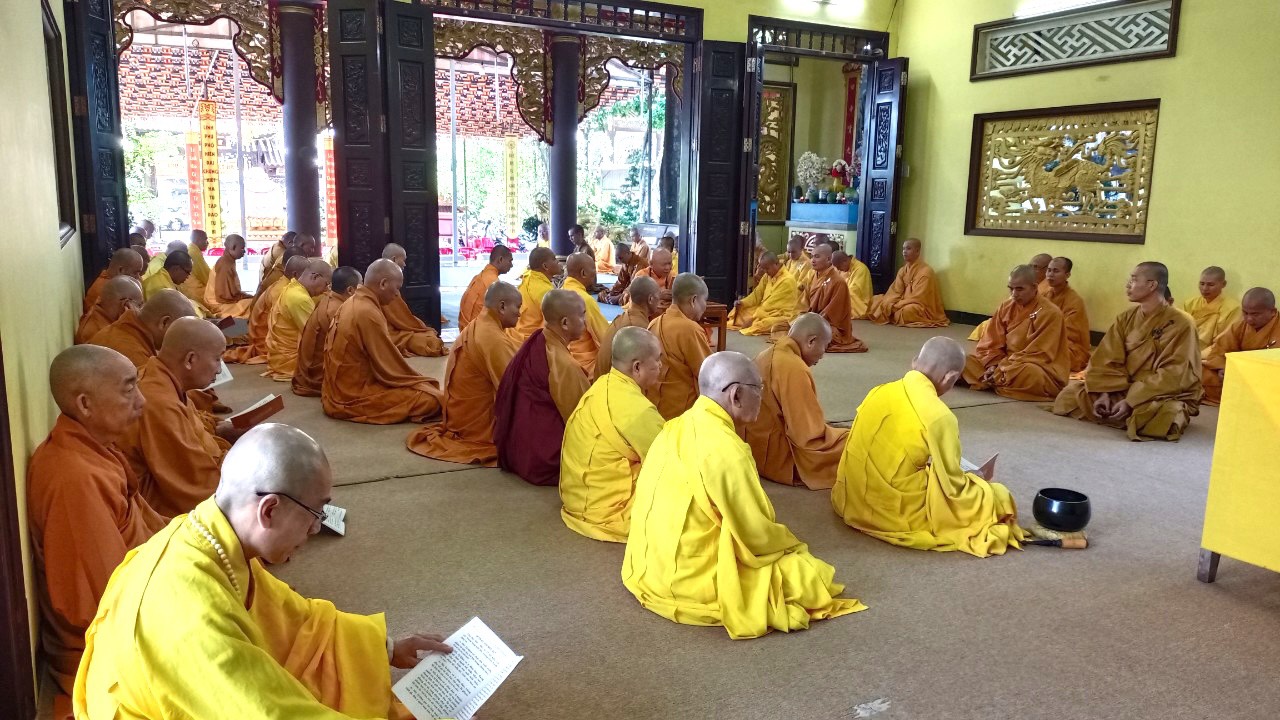 Chư Tôn đức giáo phẩm Ban chứng minh, chư tôn đức Ban Trị sự, chư Tôn đức hành giả An cư cùng đại chúng đã đảnh lễ lịch đại Tổ Sư tại Tổ đường, sau đó tuần tự trang nghiêm quang lâm tại chánh điện thực hiện nghi thức Bố-tát.