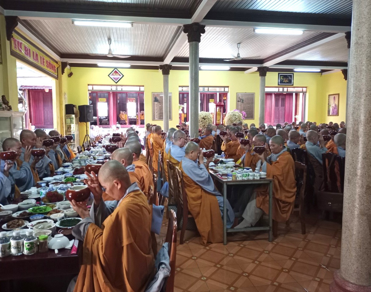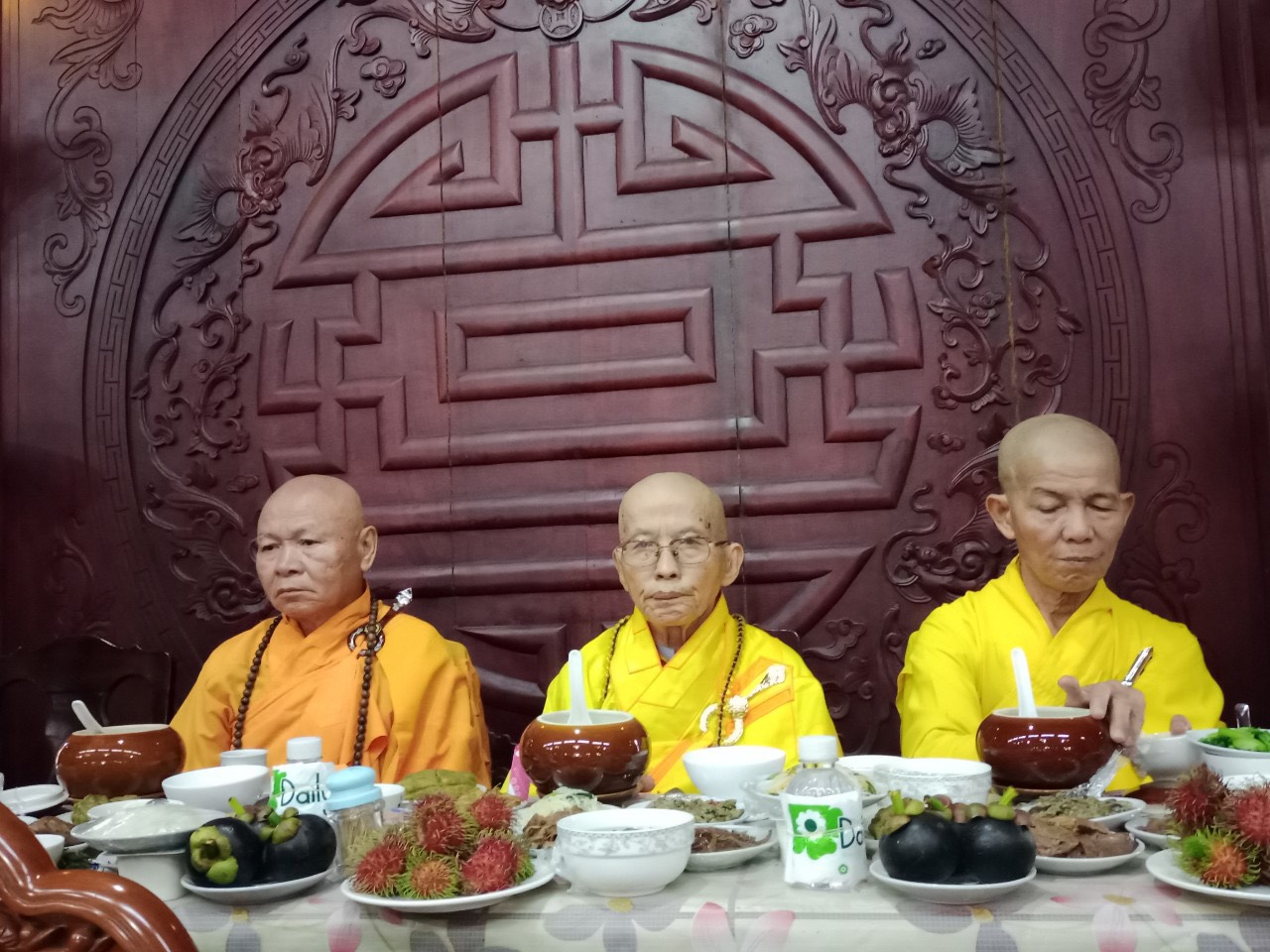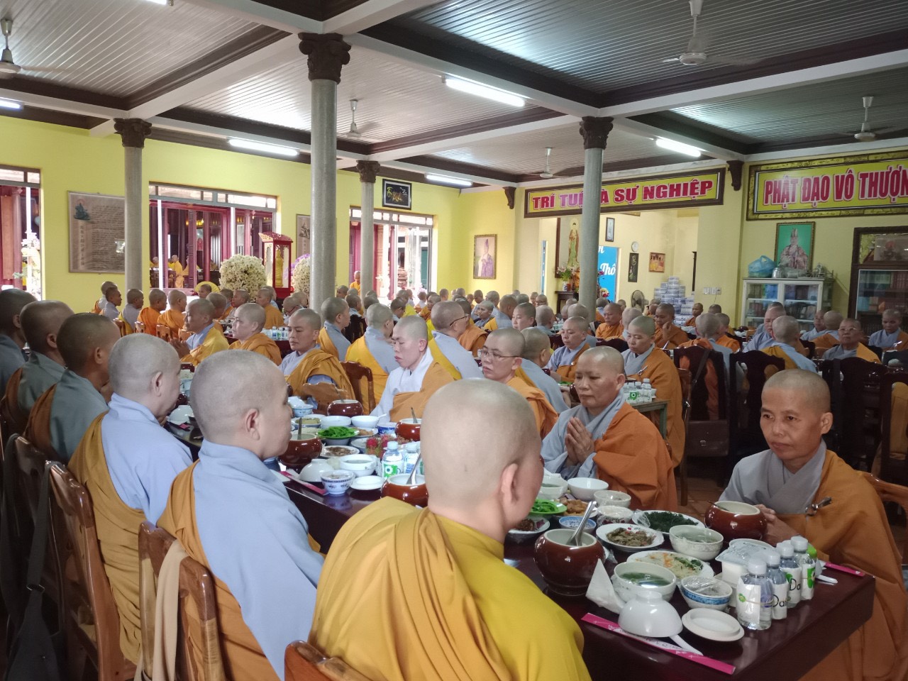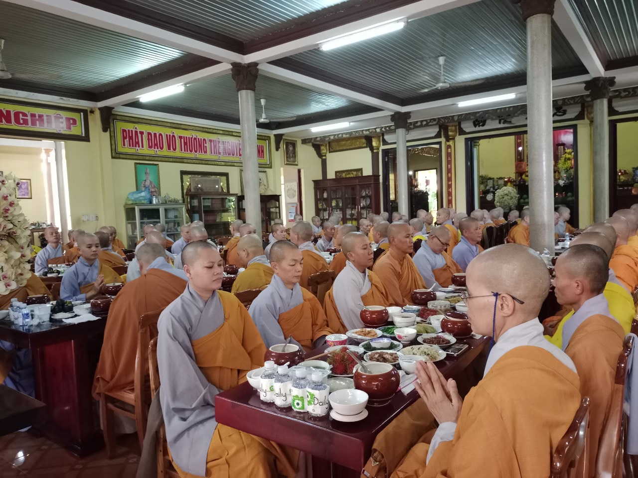 Trong kỳ Bố-tát này các tự viện cùng chư Tăng Ni trong huyện đã phát tâm cúng dường trai phạn cho đại chúng. Toàn thể chư Tôn đức Tăng Ni cùng quý Phật tử thực hiện nghi thức quá đường và thọ trai trong niềm hoan hỷ.