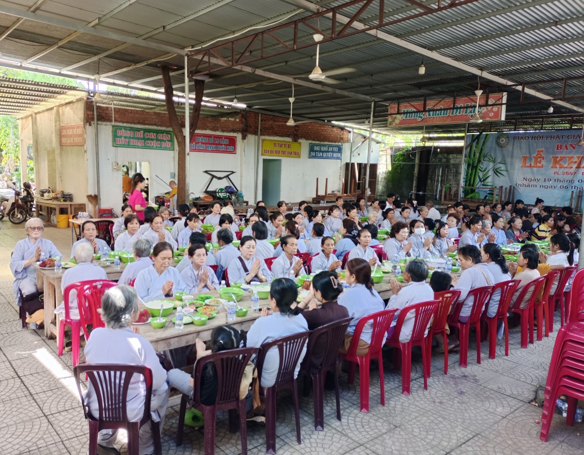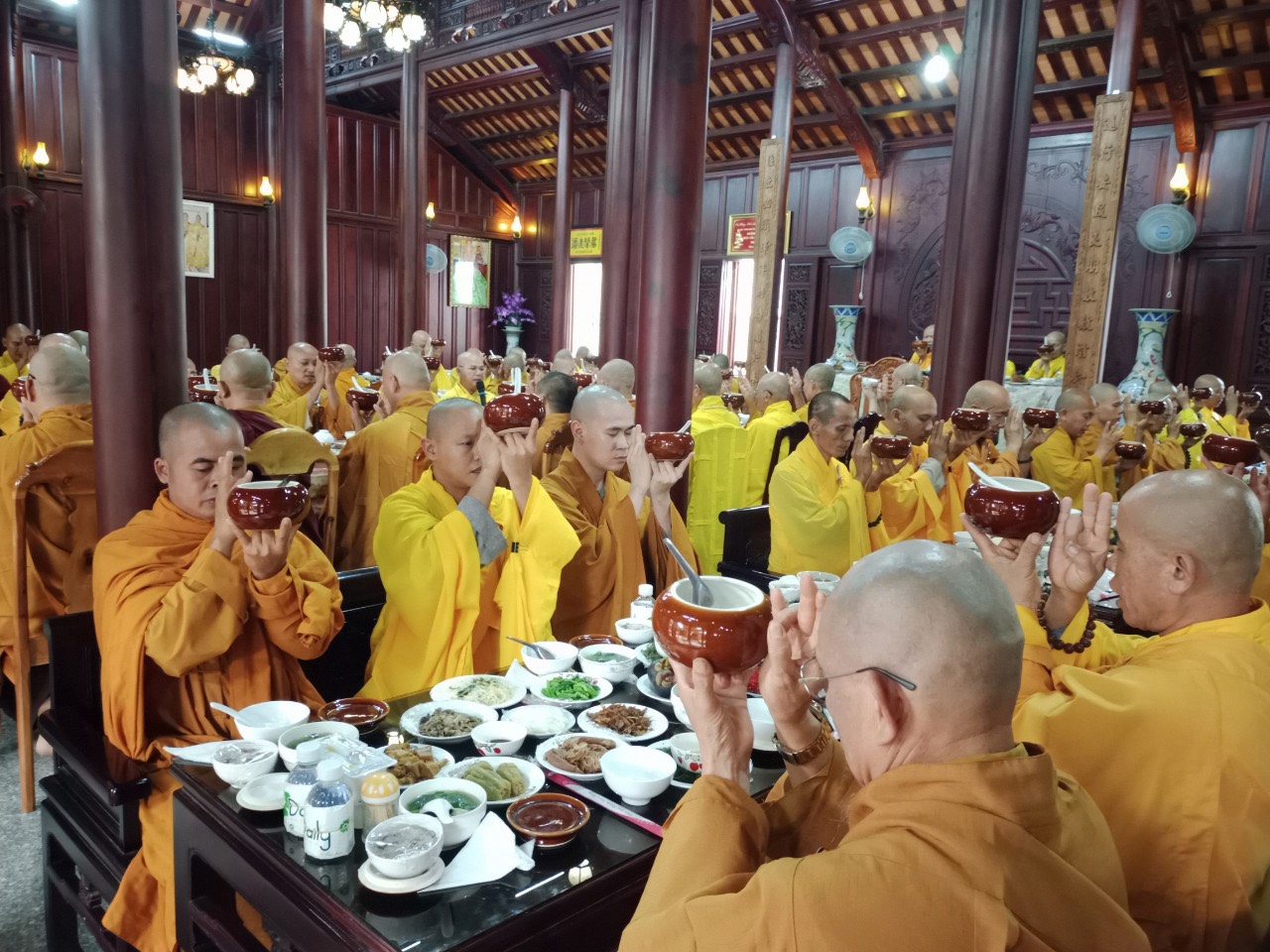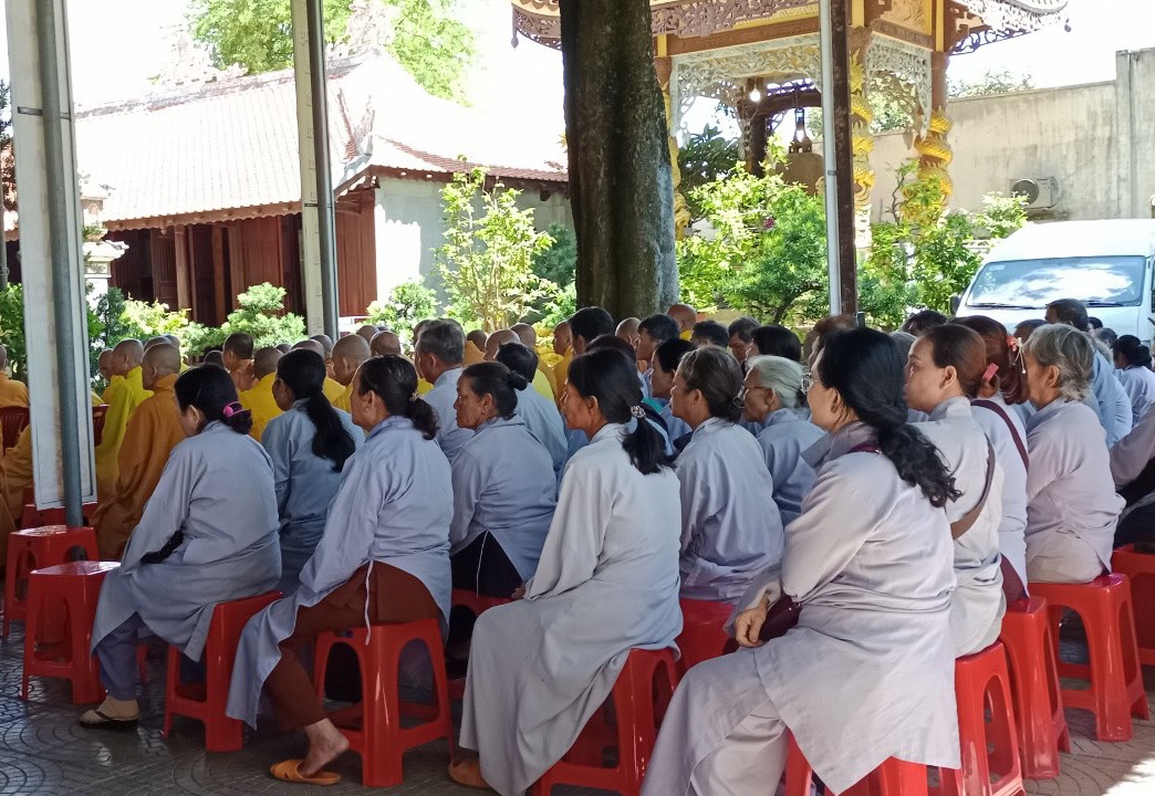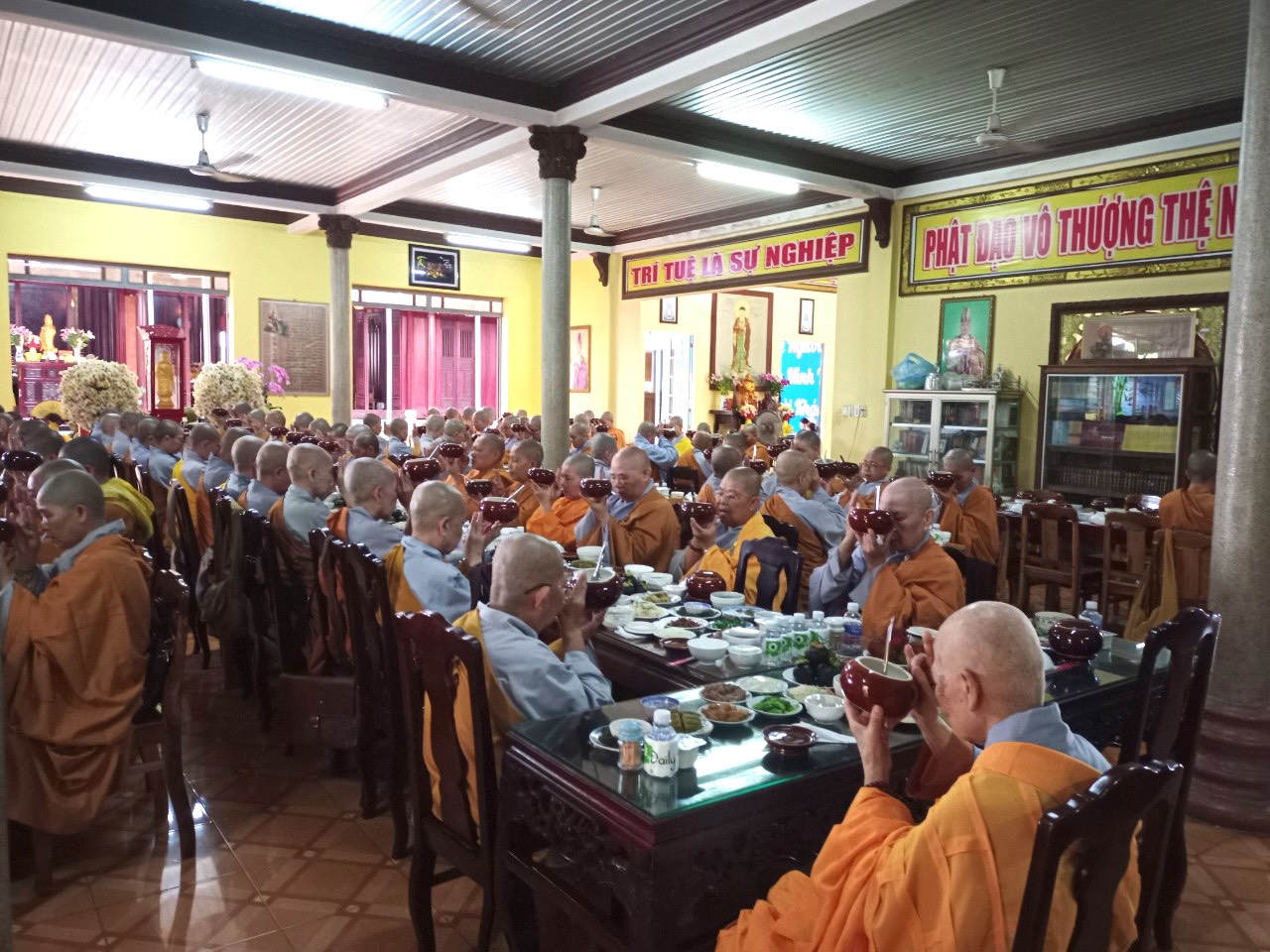 Trong kỳ Bố-tát này các tự viện cùng chư Tăng Ni trong huyện đã phát tâm cúng dường trai phạn cho đại chúng. Toàn thể chư Tôn đức Tăng Ni cùng quý Phật tử thực hiện nghi thức quá đường và thọ trai trong niềm hoan hỷ.